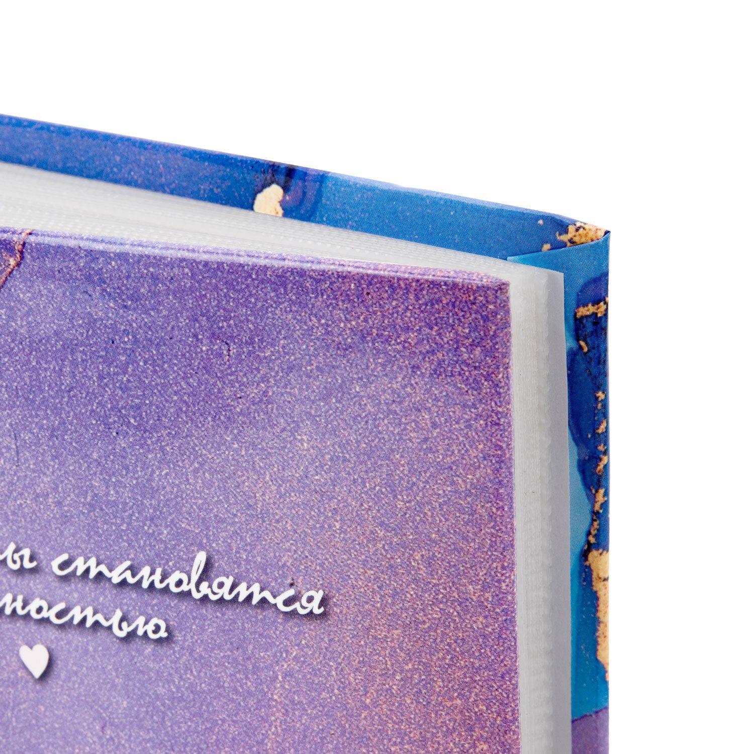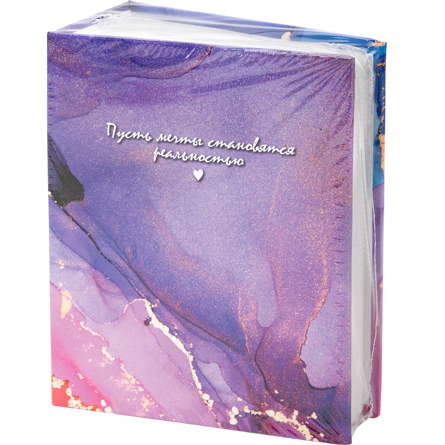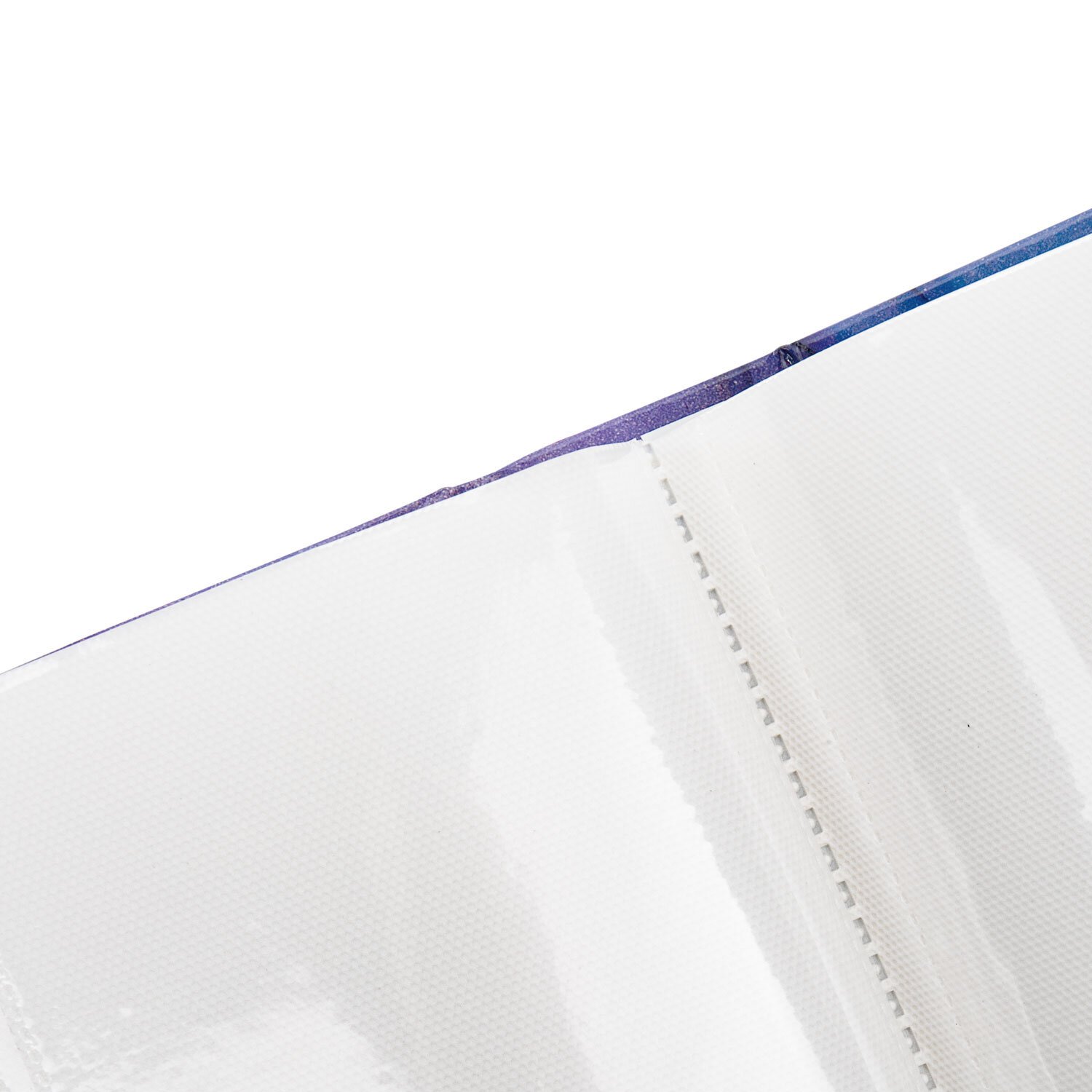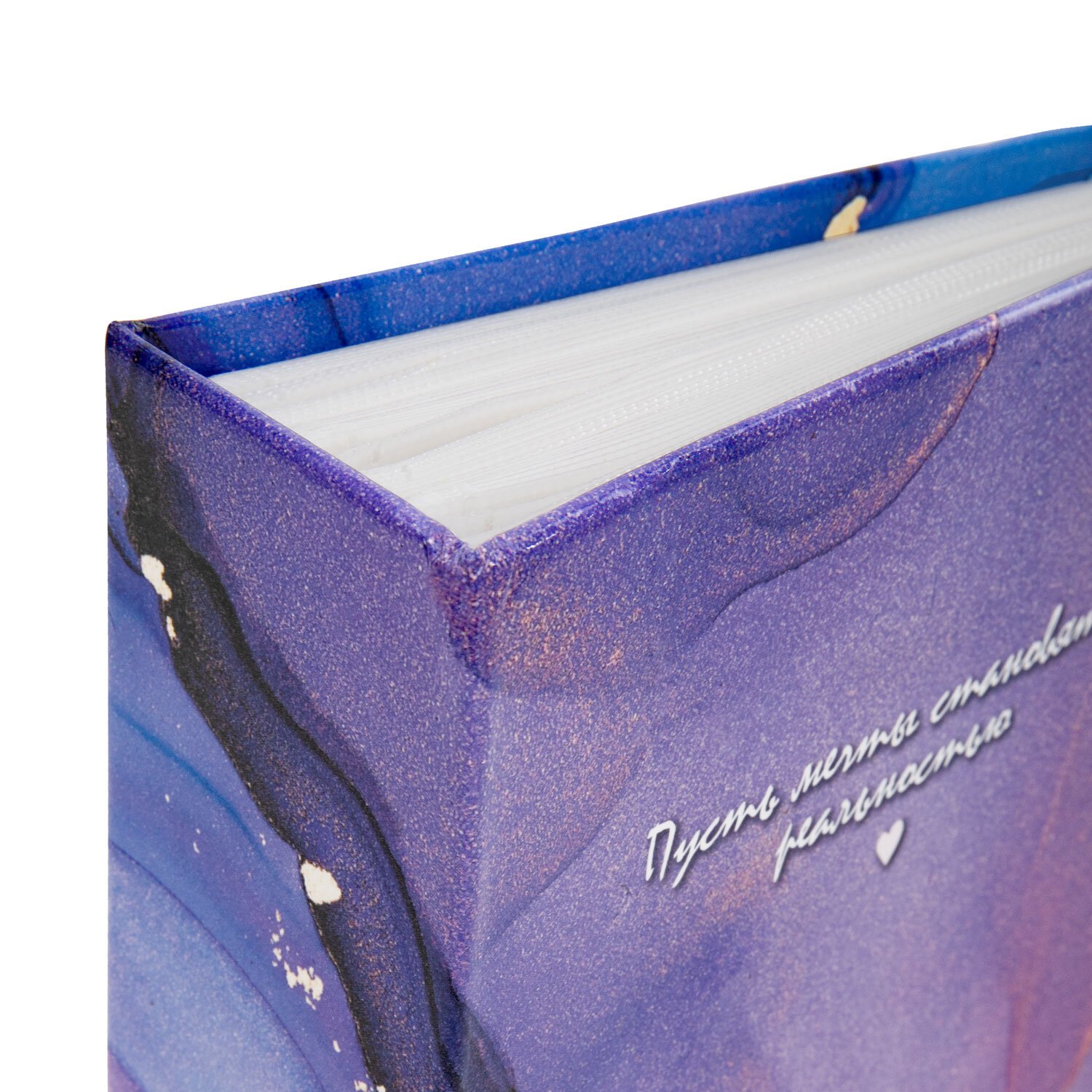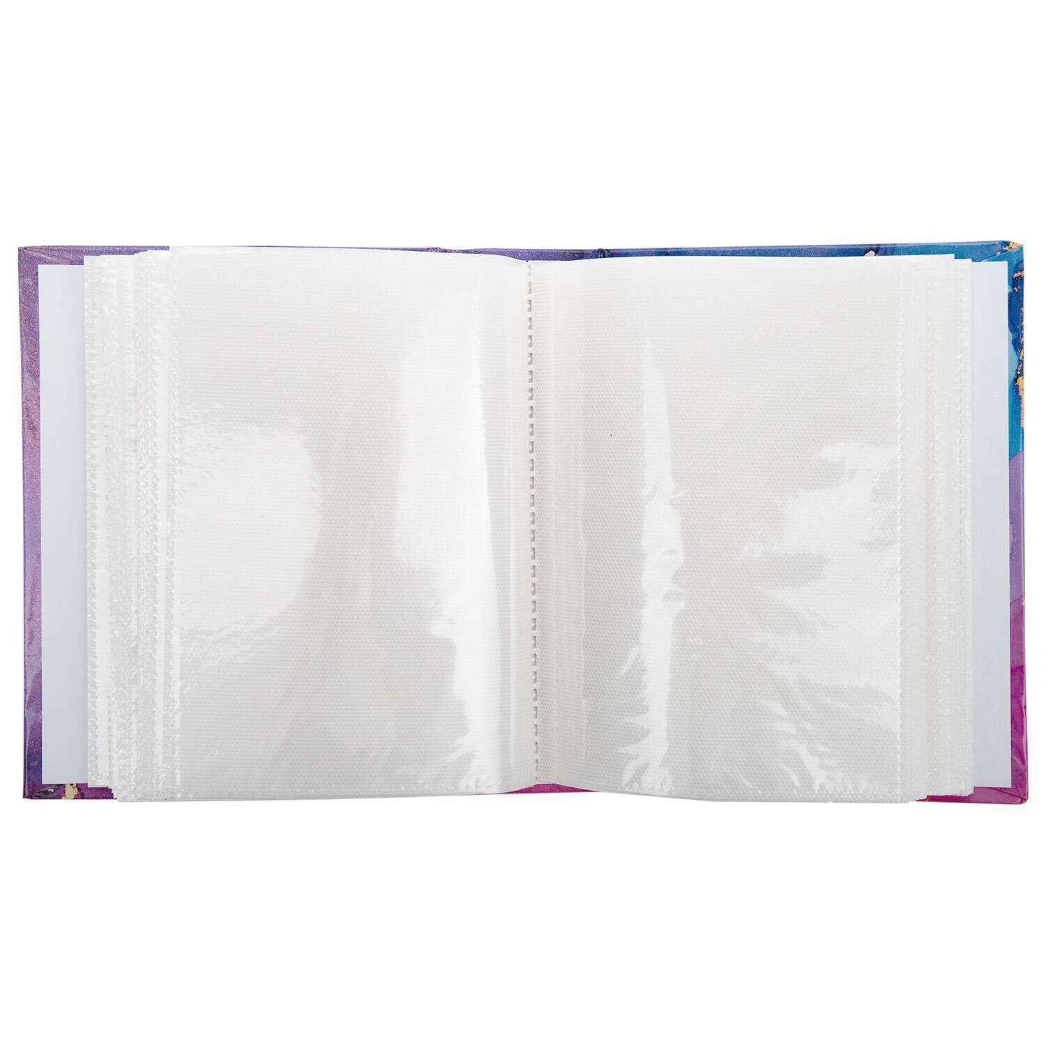 Состоит из 50 полипропиленовых листов размером 12х15,15 см с карманами и вмещает 100 фотографий размером 10х15 см по 2 штуки на странице. Обложка альбома выполнена под мраморный принт, а его листы склеены в единый блок. Размер – 13х17 см.