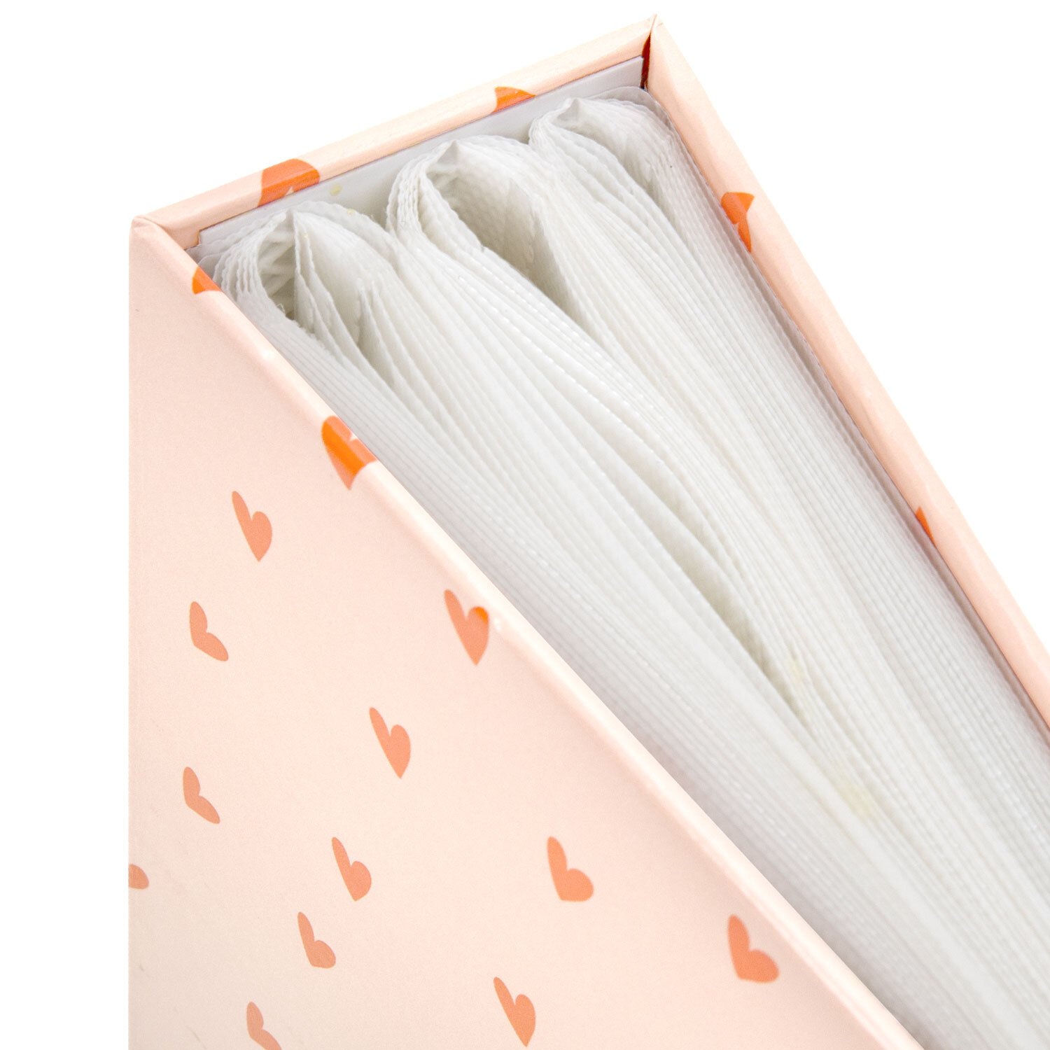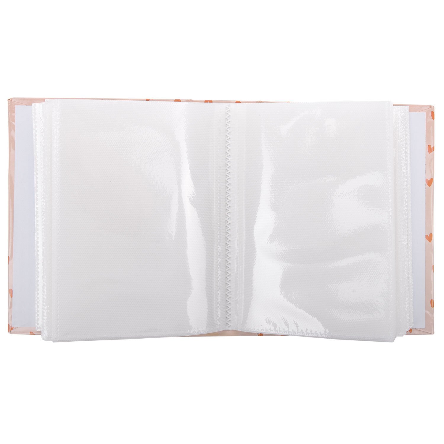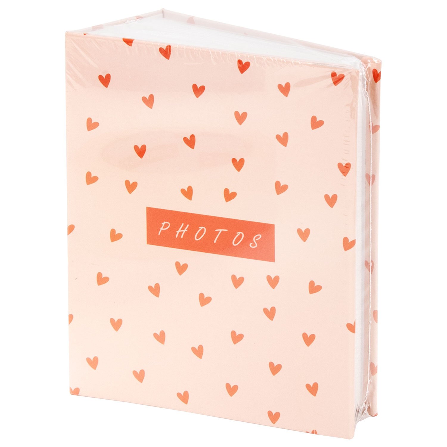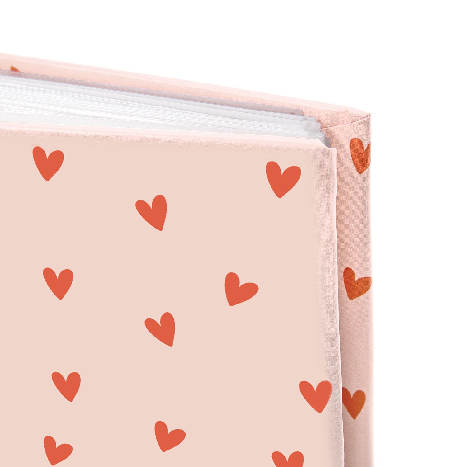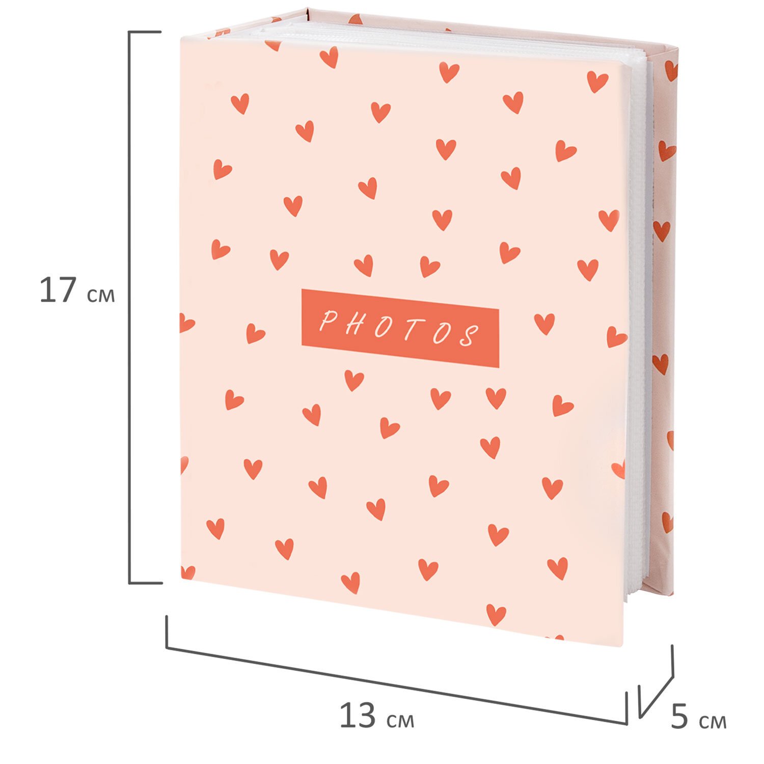 Состоит из 50 полипропиленовых листов размером 12х15,15 см с карманами и вмещает 100 фотографий размером 10х15 см по 2 штуки на странице. На обложке фотоальбома изображен принт с сердечками, а его листы склеены в единый блок. Размер – 13х17 см.