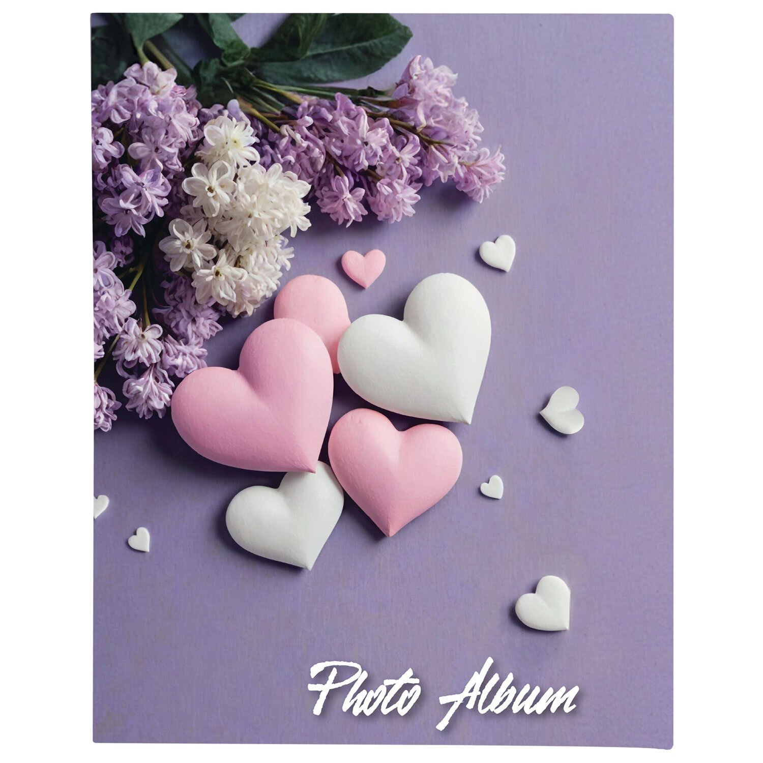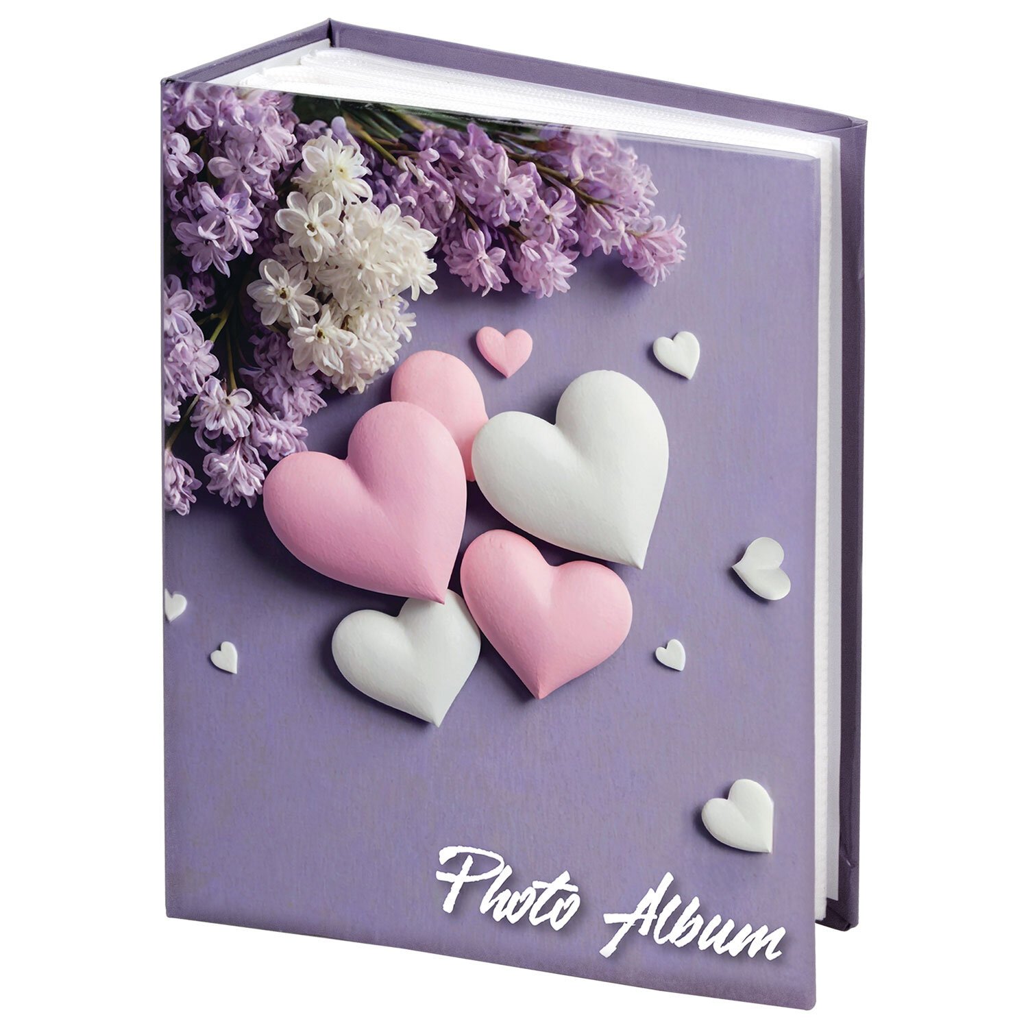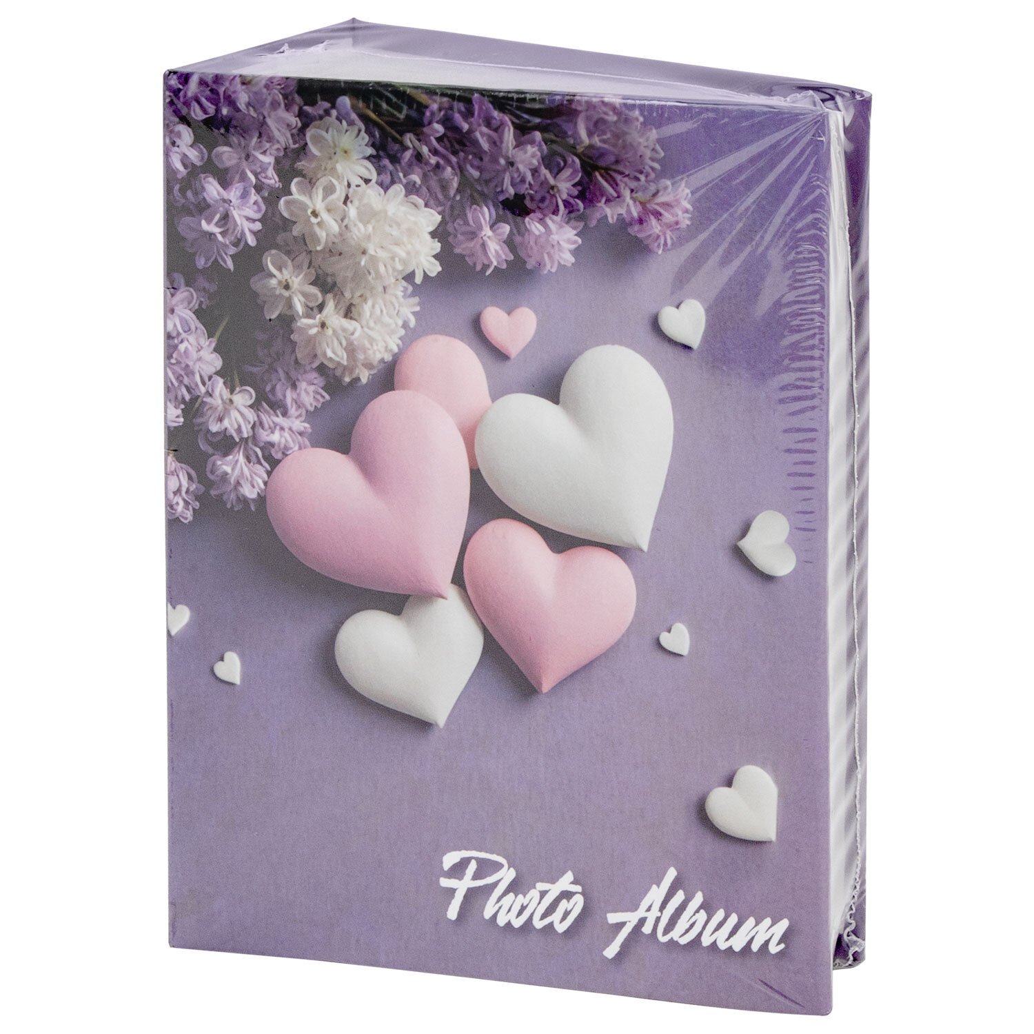 Состоит из 50 полипропиленовых листов размером 12х15,15 см с карманами и вмещает 100 фотографий размером 10х15 см по 2 штуки на странице. На обложке фотоальбома изображен принт с сердцами, а его листы склеены в единый блок. Размер – 13х17 см.
