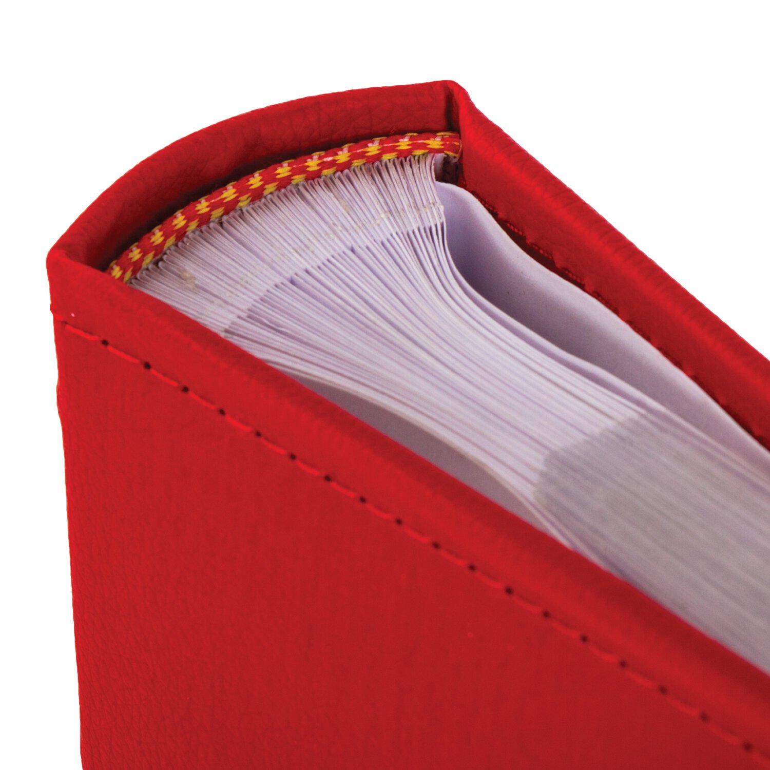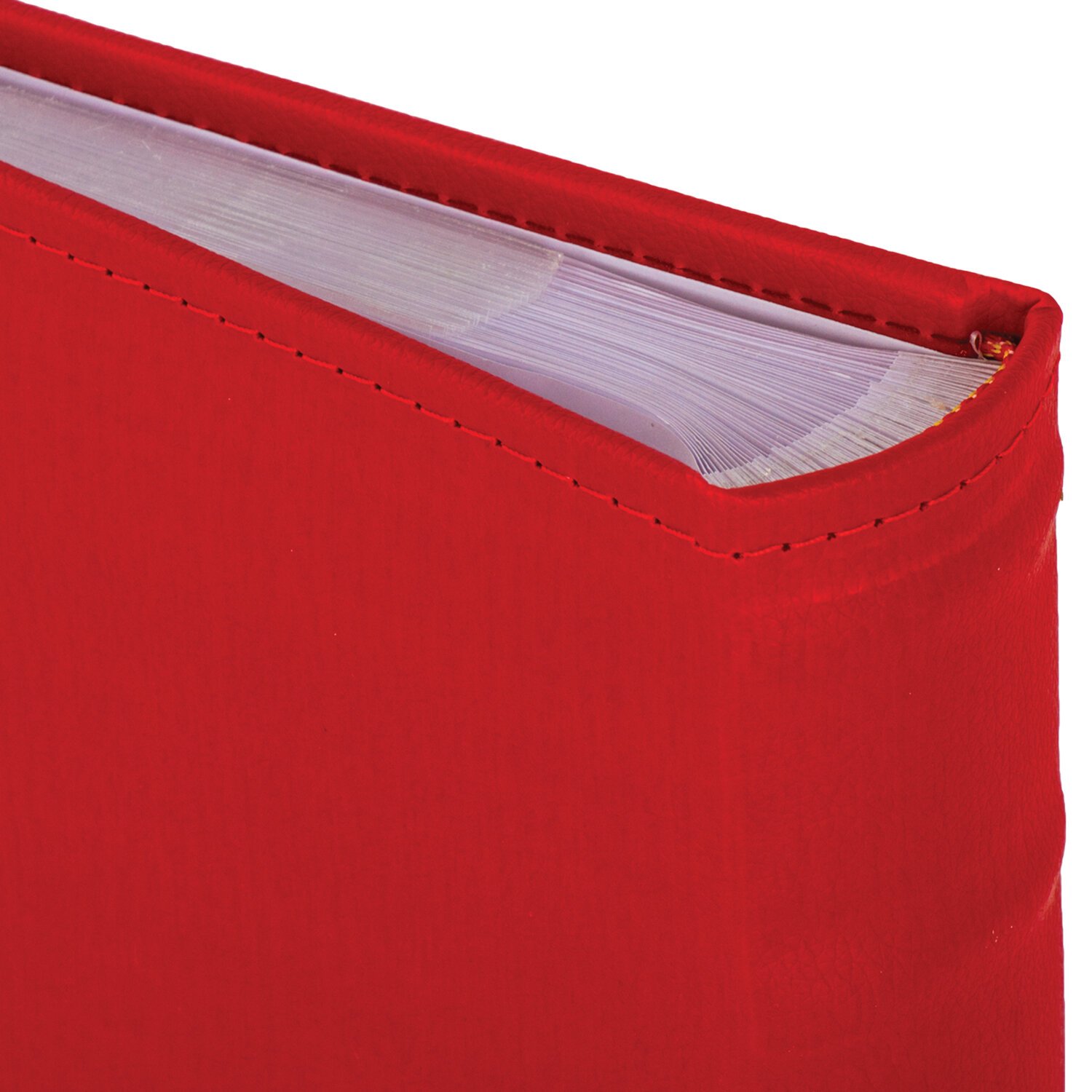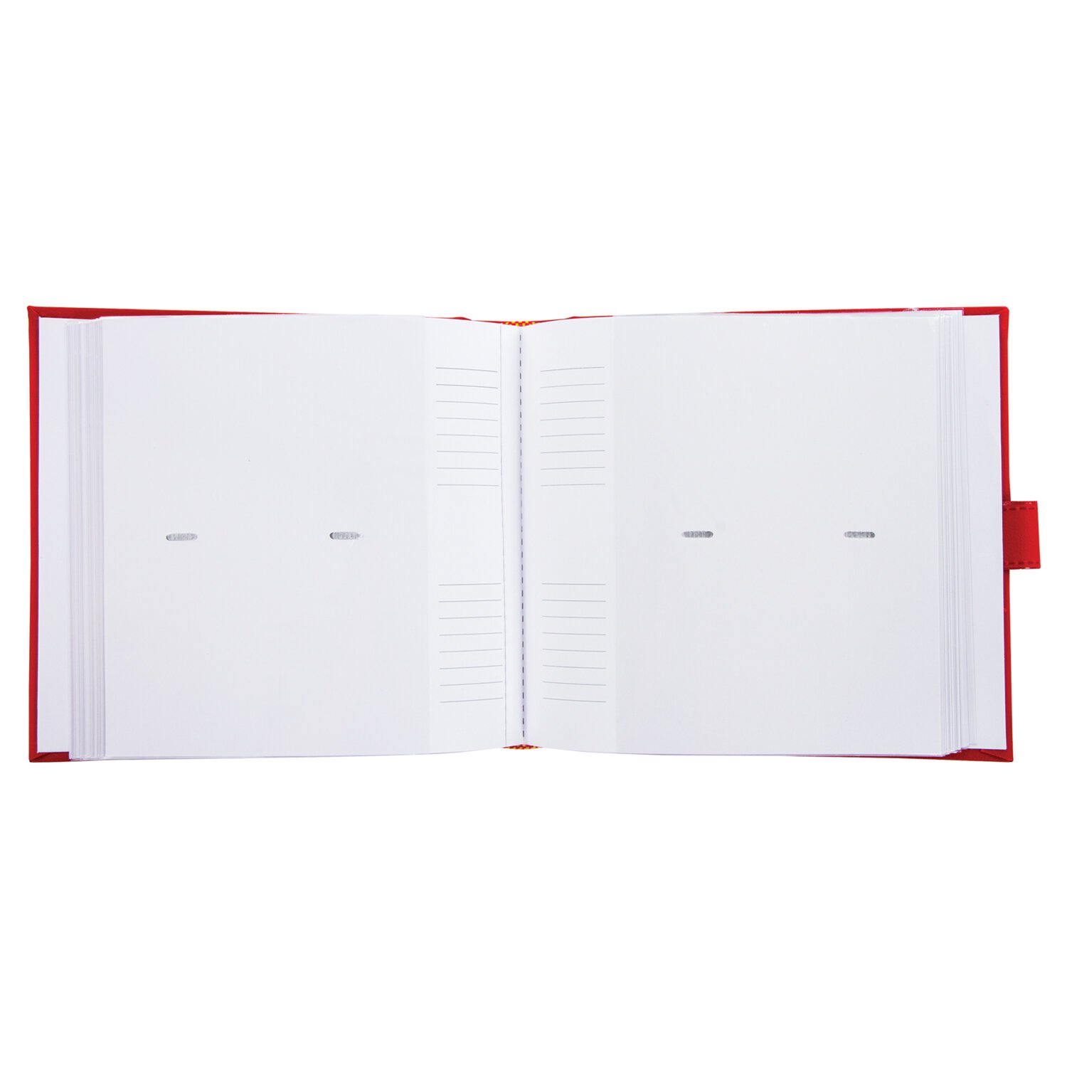 Состоит из 50 бумажных листов размером 15,5х21 см с карманами и вмещает 200 фотографий размером 10х15 см по 2 штуки на странице. Имеются поля для записей. Обложка фотоальбома стилизована под кожу красного цвета. Фотоальбом с книжным переплетом отличается повышенной прочностью и долгим сроком службы. Размер - 30х26 см.