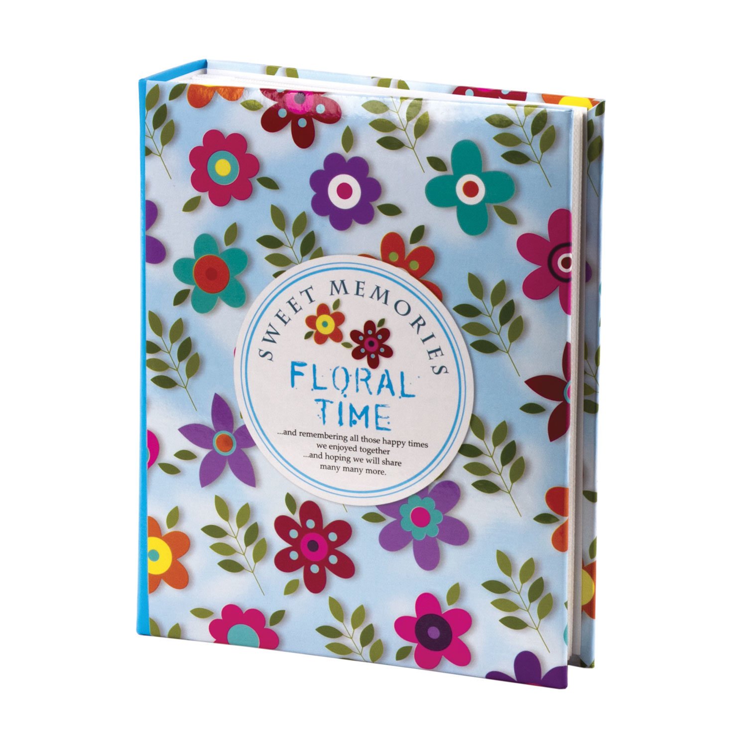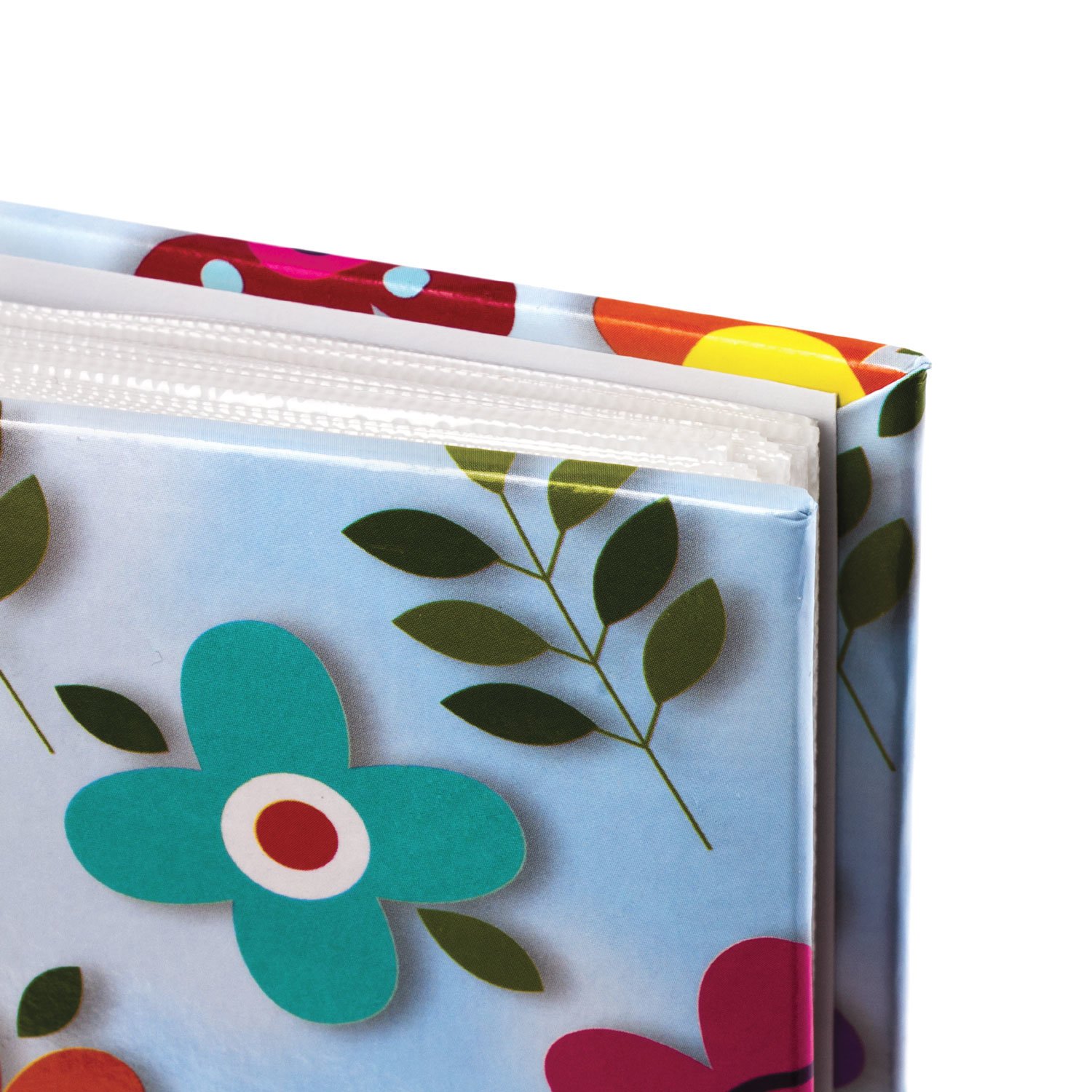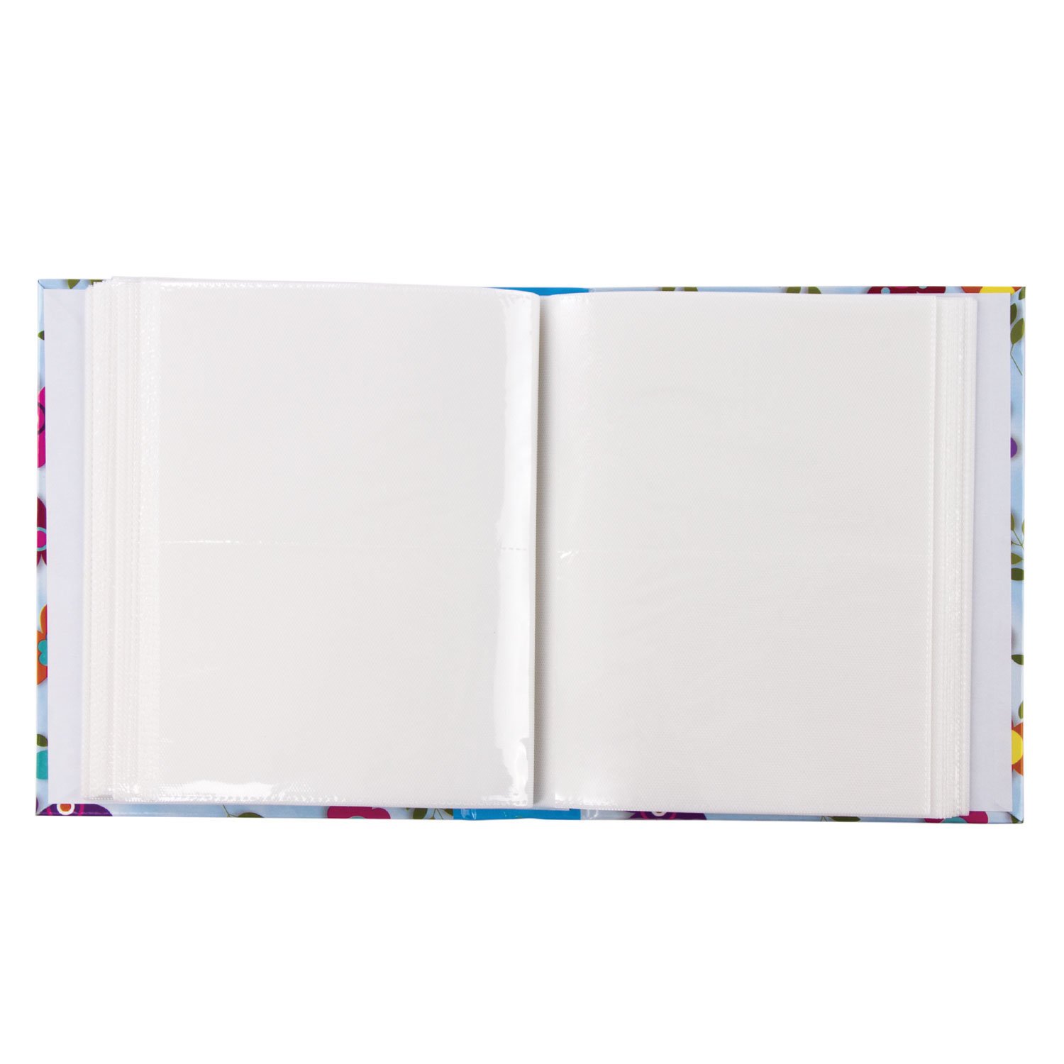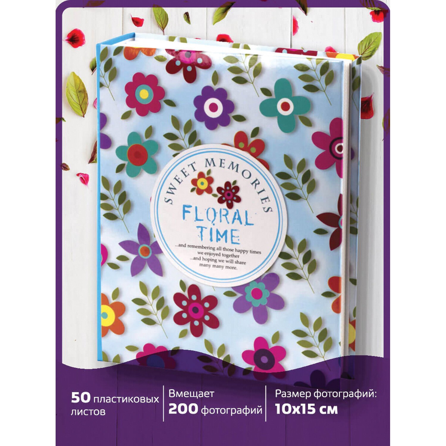 Состоит из 50 полипропиленовых листов размером 17,5х22 см с карманами и вмещает 200 фотографий размером 10х15 см по 2 штуки на странице. На обложке фотоальбома изображен цветочный принт, а его листы склеены в единый блок. Размер - 18х23 см.