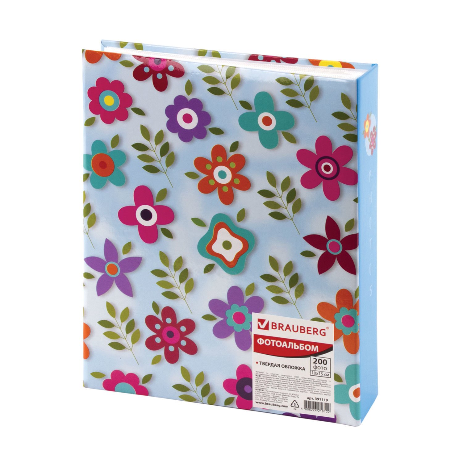 Фотоальбом BRAUBERG на 200 фото 10х15 см, твердая обложка, "Цветочки", разноцветный, 391119