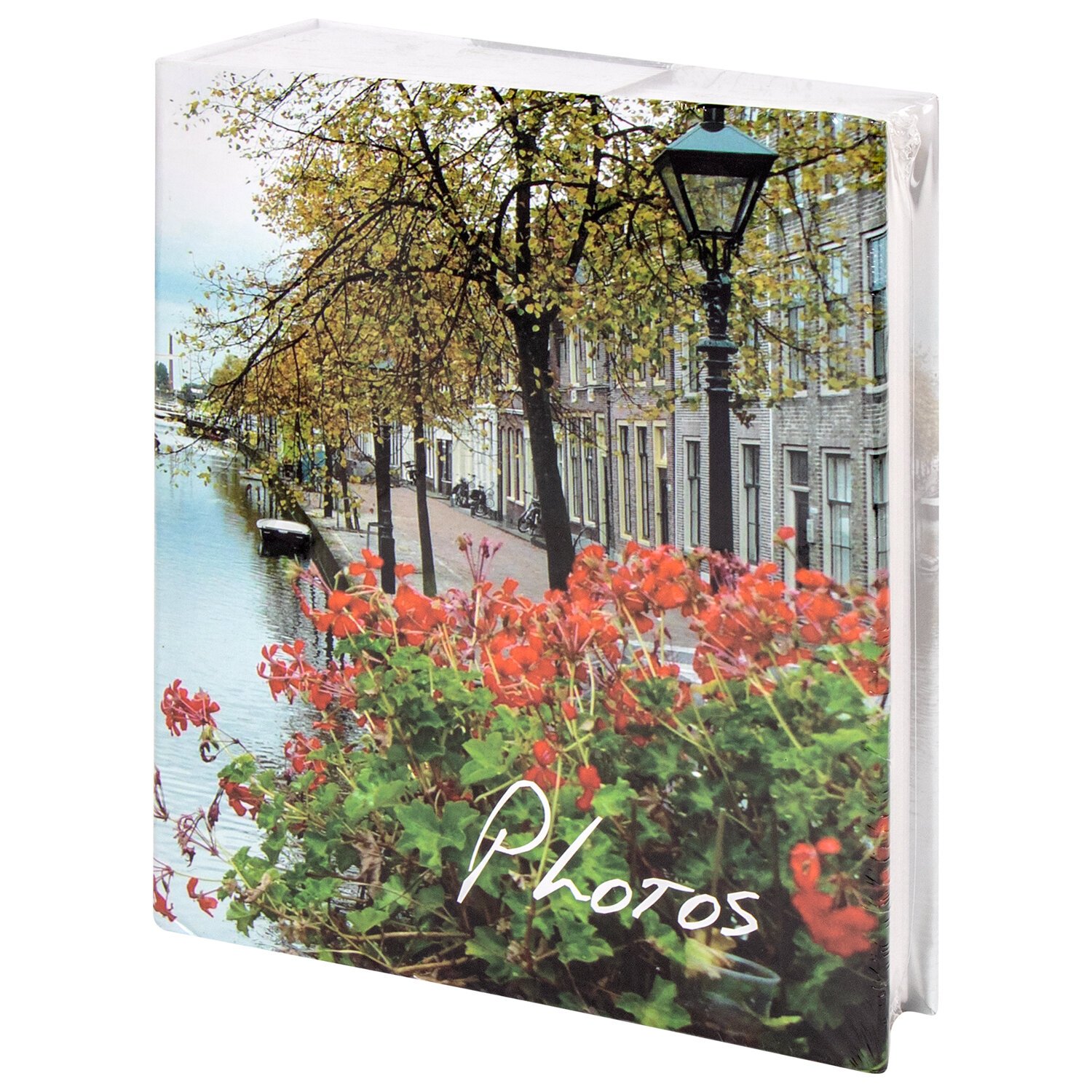 Состоит из 76 полипропиленовых листов размером 17,5х22 см с карманами и вмещает 304 фотографии размером 10х15 см по 2 штуки на странице. Обложка фотоальбома выполнена в голубых, красных и зеленых тонах с изображением городского пейзажа, а его листы склеены в единый блок. Размер альбома - 18х23 см.
