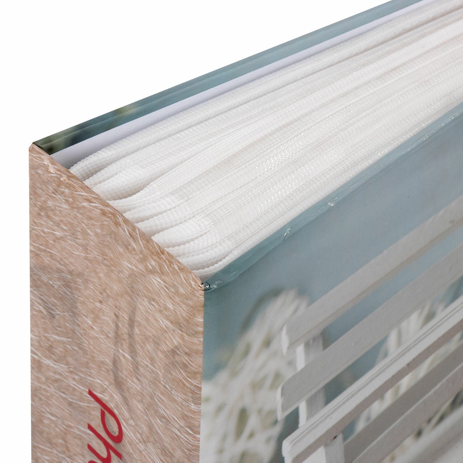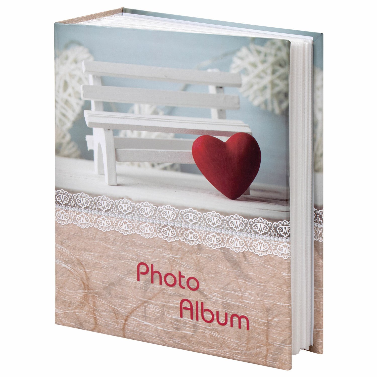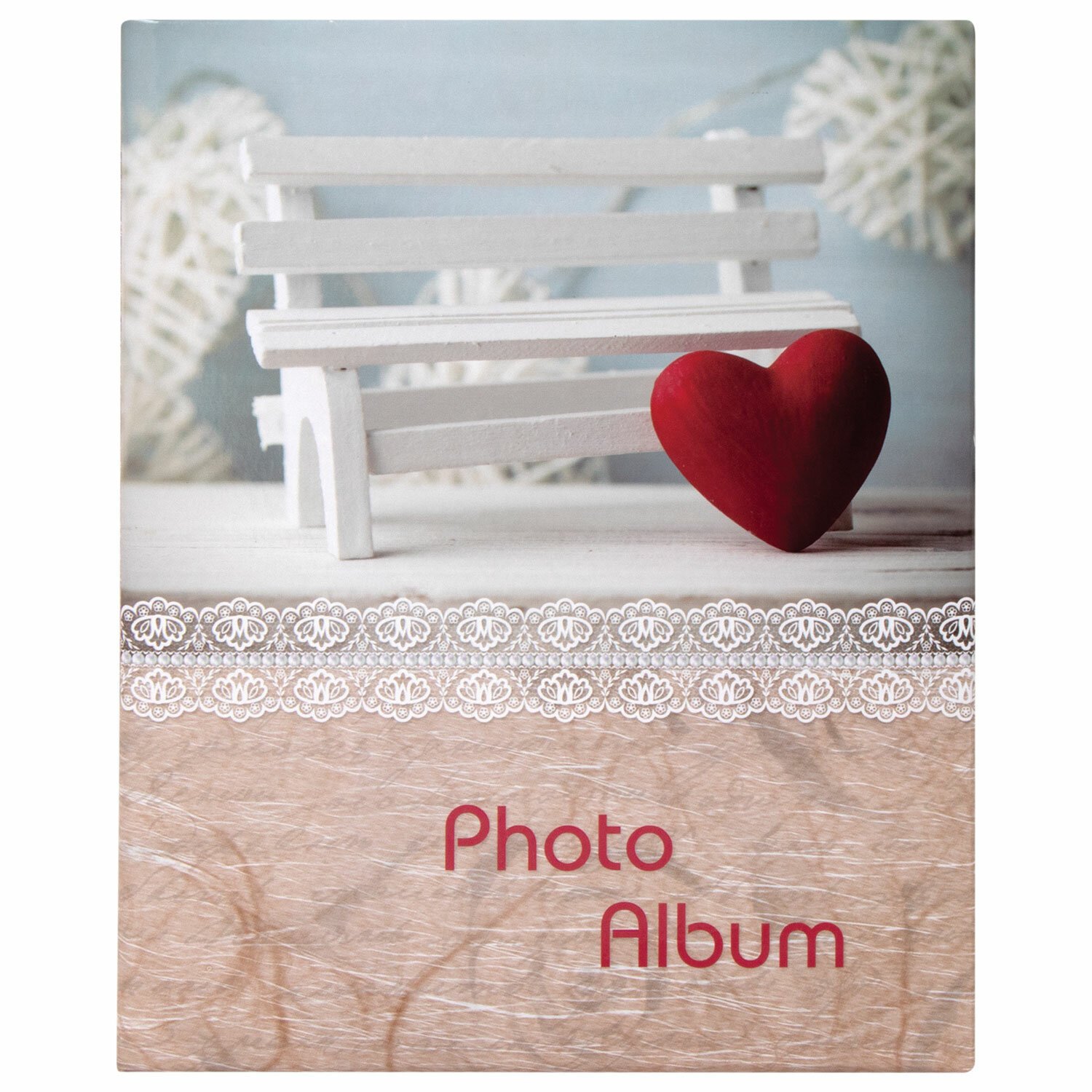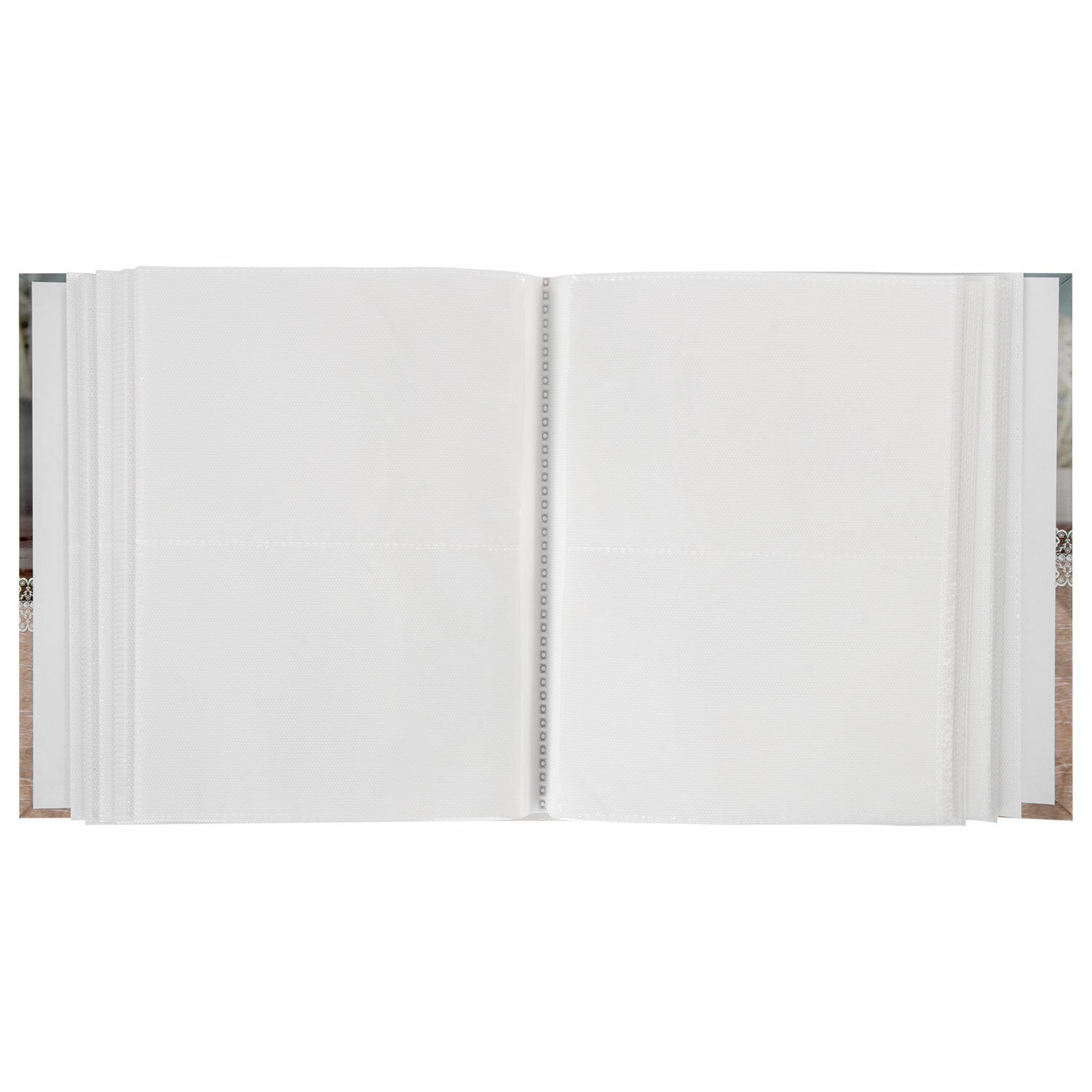 Состоит из 76 полипропиленовых листов размером 17,5х22 см с карманами и вмещает 304 фотографии размером 10х15 см по 2 штуки на странице. Обложка фотоальбома выполнена в белых и бежевых тонах с романтичной тематикой, а его листы склеены в единый блок. Размер - 18х23 см.