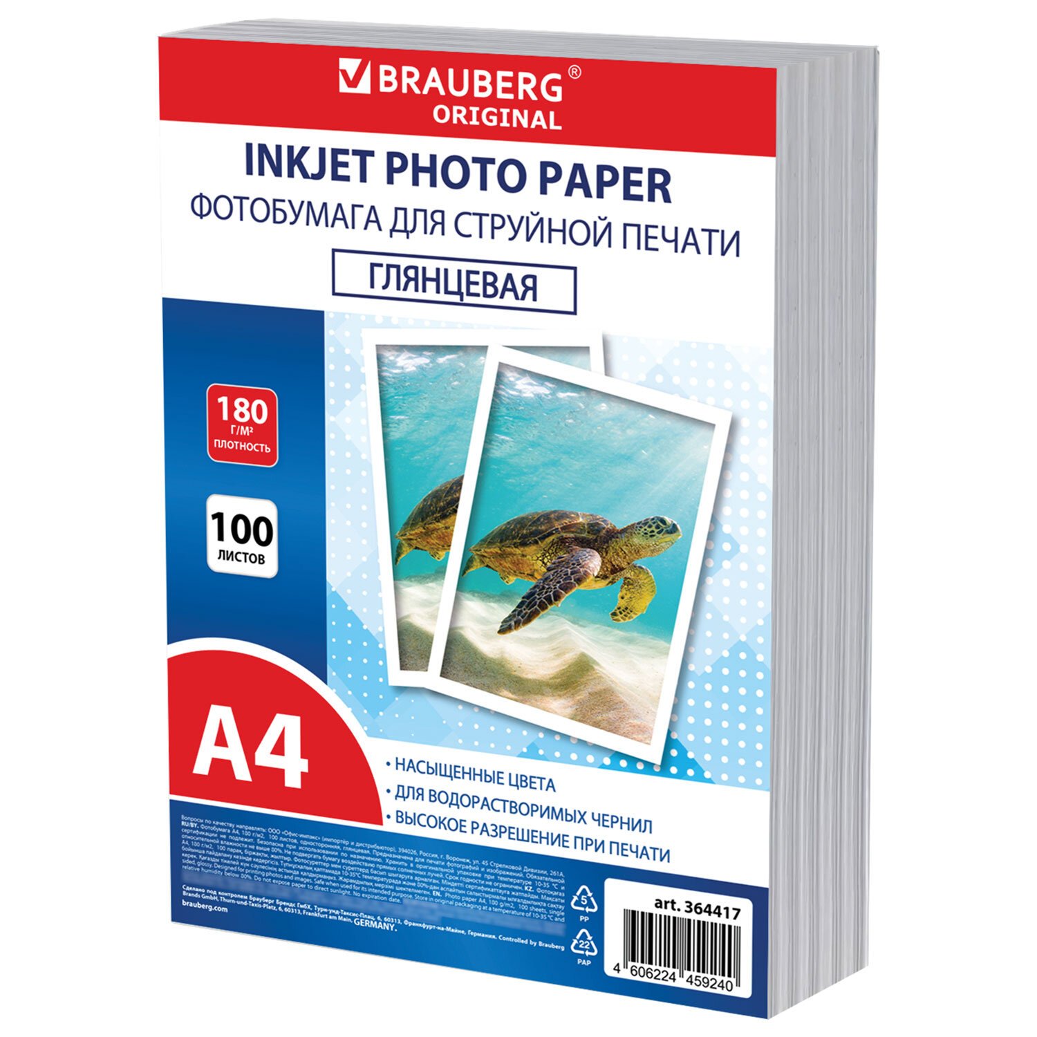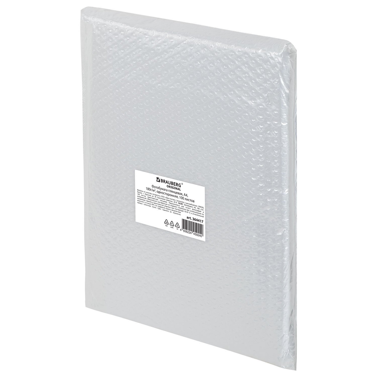 Фотобумага глянцевая, А4, 180 г/м2, односторонняя, 100 листов, ПАКЕТ, BRAUBERG ORIGINAL 364417