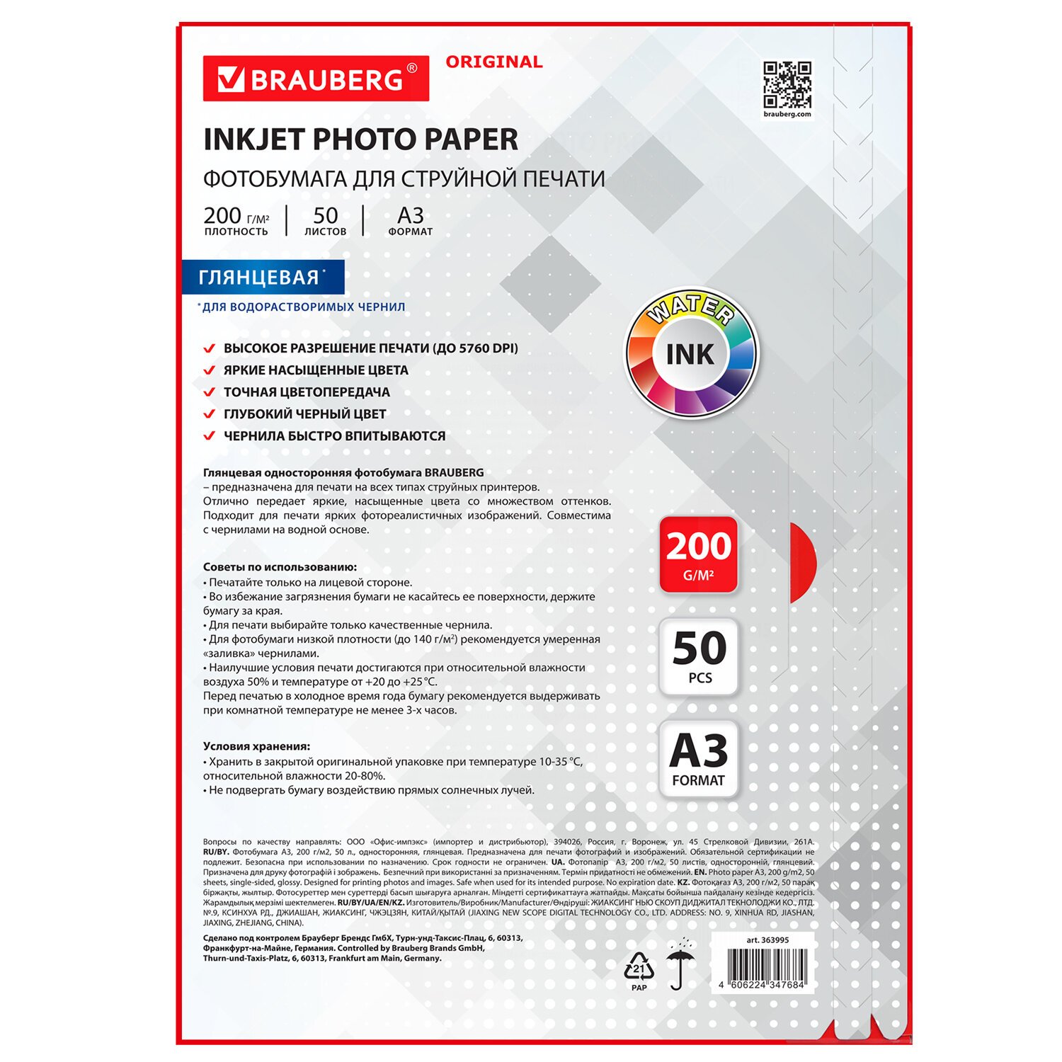Фотобумага глянцевая БОЛЬШОГО ФОРМАТА, А3, 200 г/м2, односторонняя, 50 листов, BRAUBERG ORIGINAL, 363995