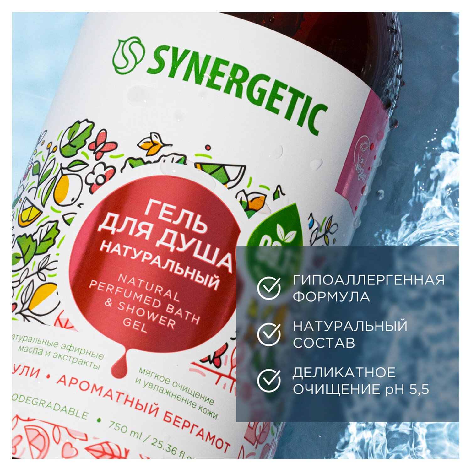 Гель для душа 750 мл SYNERGETIC "Пачули и ароматный бергамот", натуральный биоразлагаемый, 400009