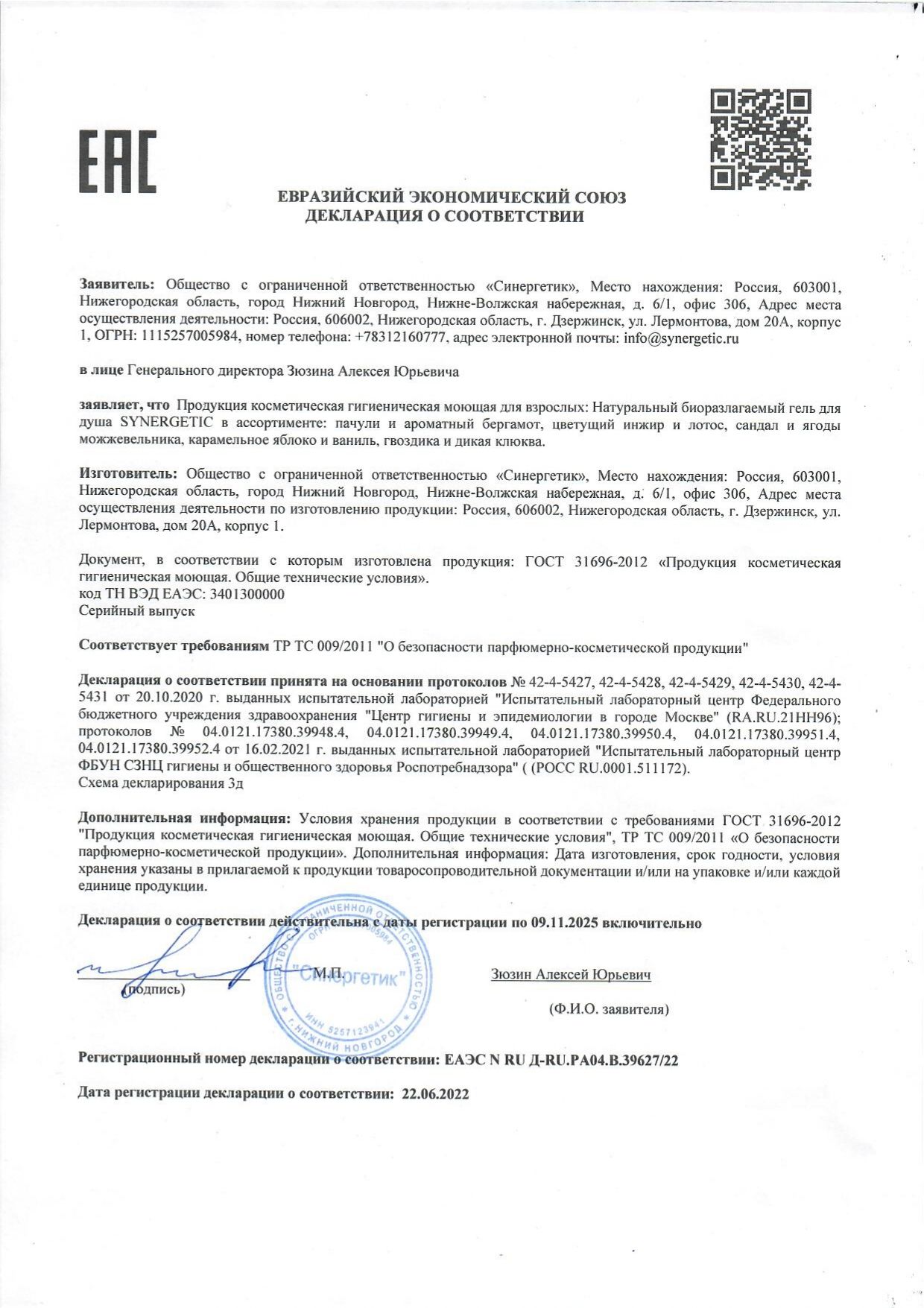 Гель для душа 750 мл SYNERGETIC "Пачули и ароматный бергамот", натуральный биоразлагаемый, 400009