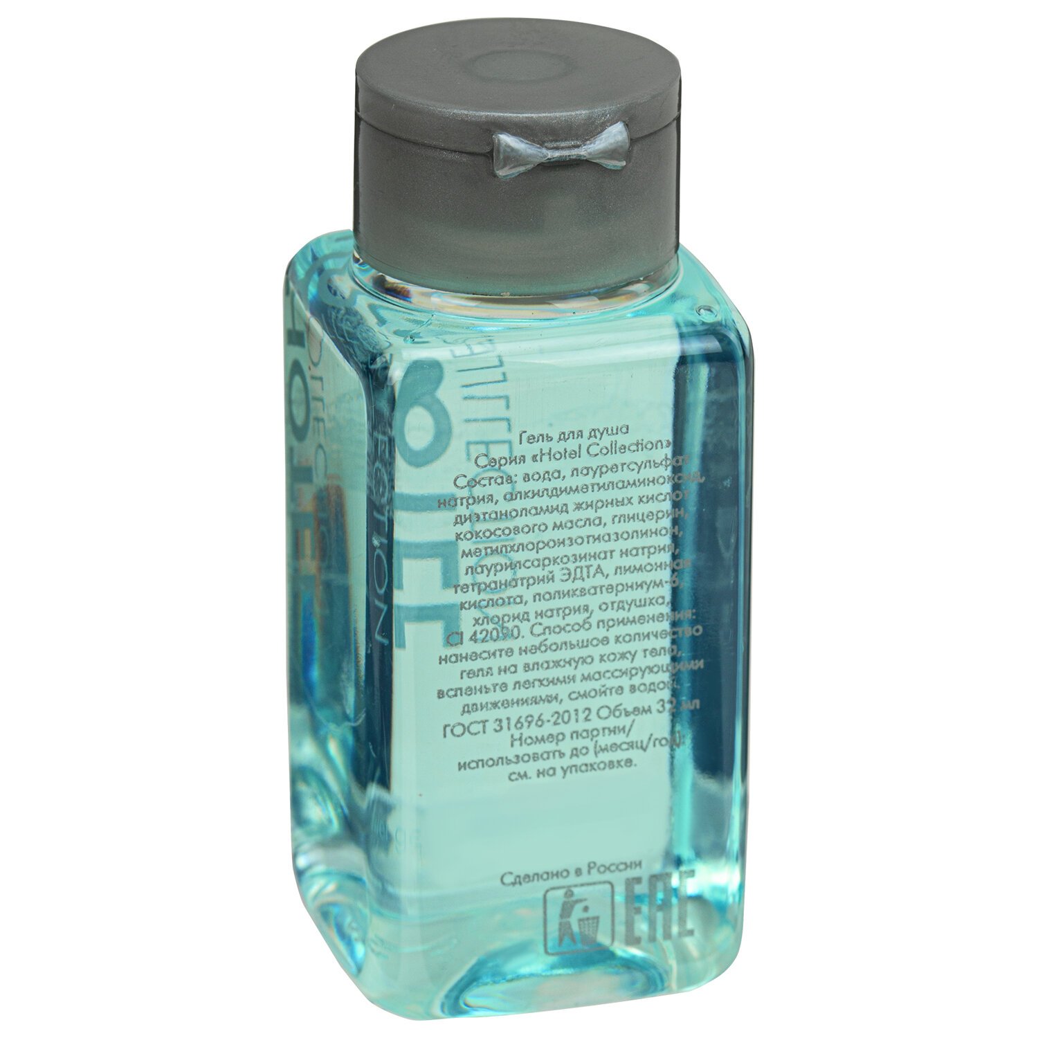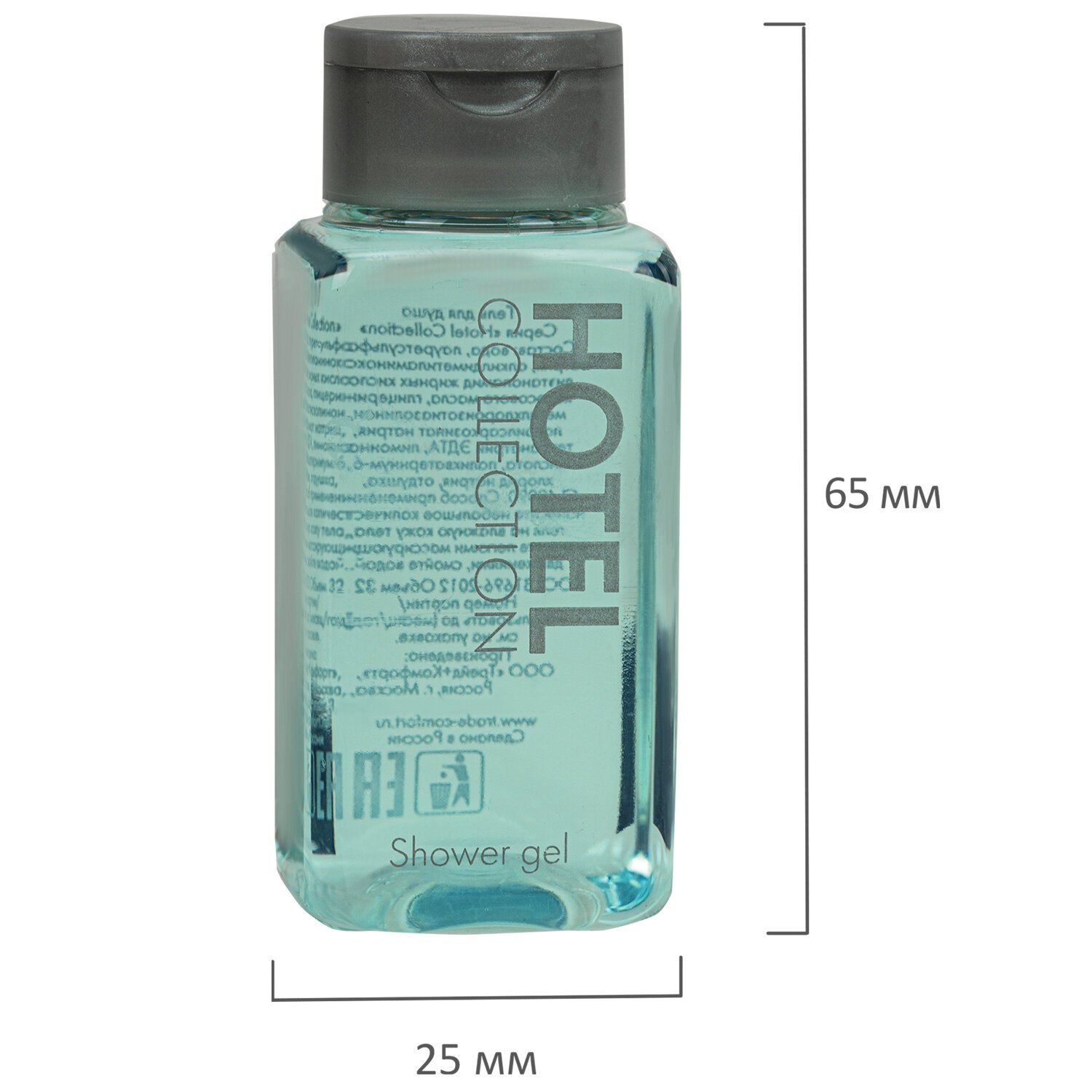 Пластиковый флакон объемом 32 мл содержит оптимальное количество геля, которое позволит удовлетворить потребности постояльца отеля во время проживания.