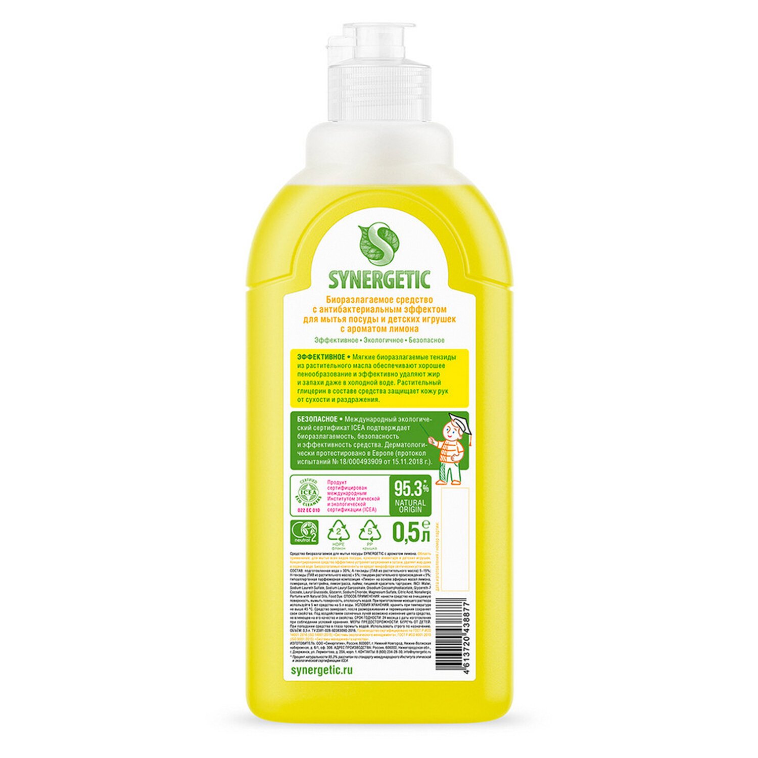 Биоразлагаемый концентрированный гель для посуды с антибактериальным эффектом SYNERGETIC – это экологичное, безопасное и эффективное средство для мытья всех видов посуды, в том числе детской, кухонного инвентаря и детских игрушек от любых видов загрязнений. Он не оставляет следов на посуде. Мягкие биоразлагаемые тензиды из растительного масла обеспечивают хорошее пенообразование и эффективно удаляют жир и запахи даже в холодной воде. Растительный глицерин в составе средства защищает кожу рук от сухости и раздражения. Гипоаллергенная парфюмерная композиция с эфирными маслами лимона, померанца, петитгрейна, лемонграсса и лайма придает средству свежий и приятный аромат. Гипоаллергенный гель дерматологически протестирован в Европе. Международный экологический сертификат ICEA подтверждает биоразлагаемость, безопасность и эффективность средства. Биоразлагаемые компоненты не вредят микрофлоре септических установок. Попадая в среду септика, гель без труда распадается на простые соединения.
