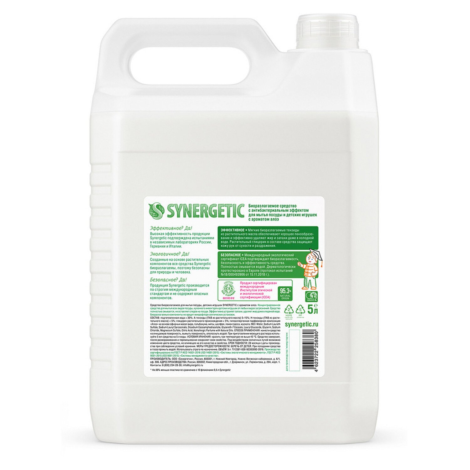 Гель для мытья посуды антибактериальный 5 л, SYNERGETIC "Алоэ", канистра, 103503