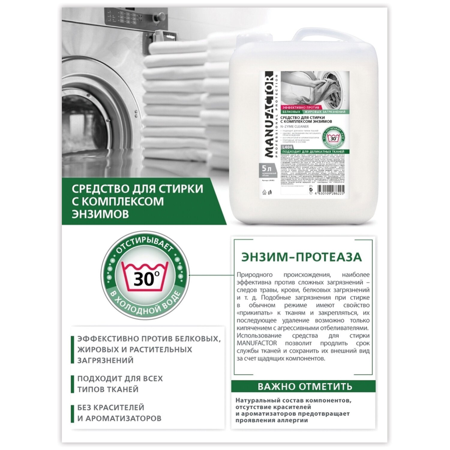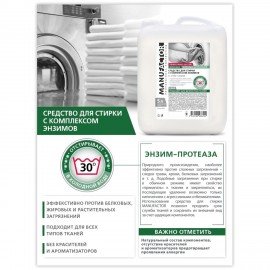 Средство с энзимами подходит для стирки всех типов текстиля. Содержит в себе комплекс компонентов для удаления широкого спектра загрязнений.
