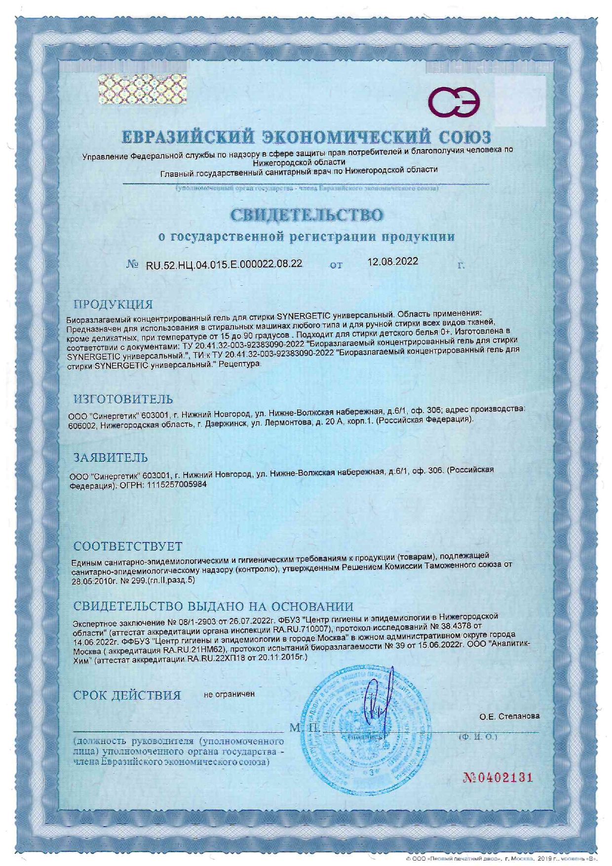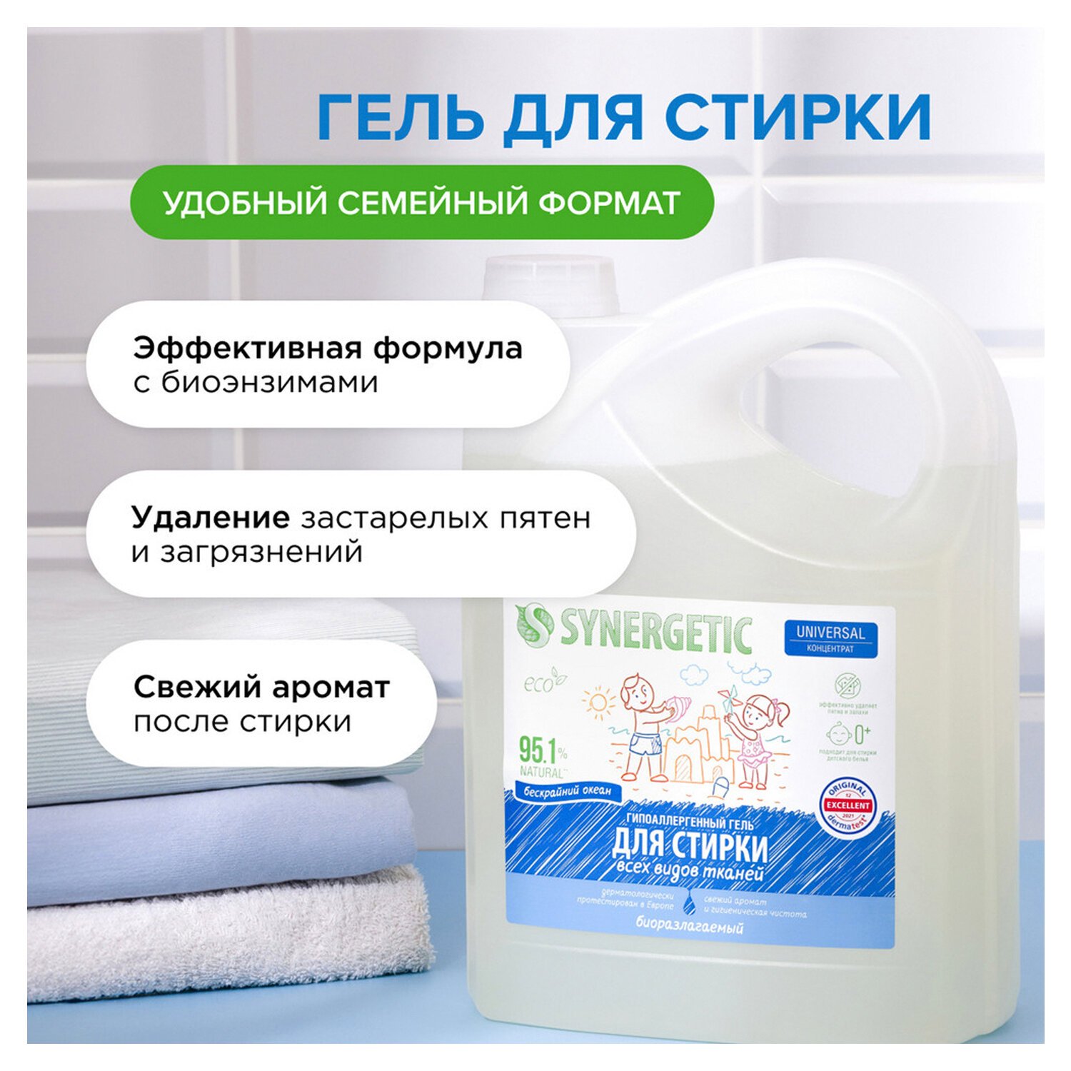 Биоразлагаемый концентрированный гель для стирки всех видов тканей SYNERGETIC UNIVERSAL с ароматом "Бескрайний океан" обеспечивает бережное и эффективное очищение тканей, устраняет неприятные запахи.