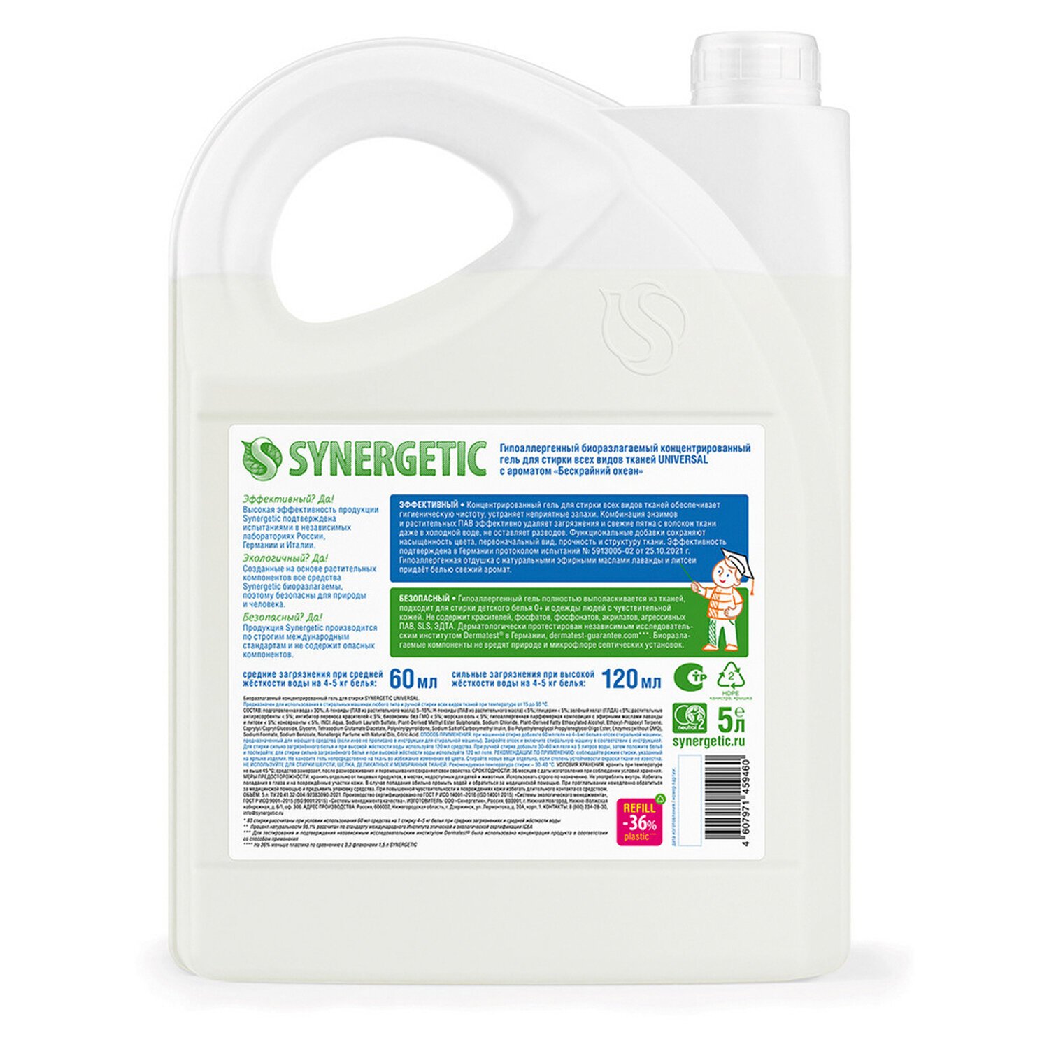 Гель для стирки концентрированный биоразлагаемый, 5 л, SYNERGETIC UNIVERSAL "Бескрайний океан", 109822