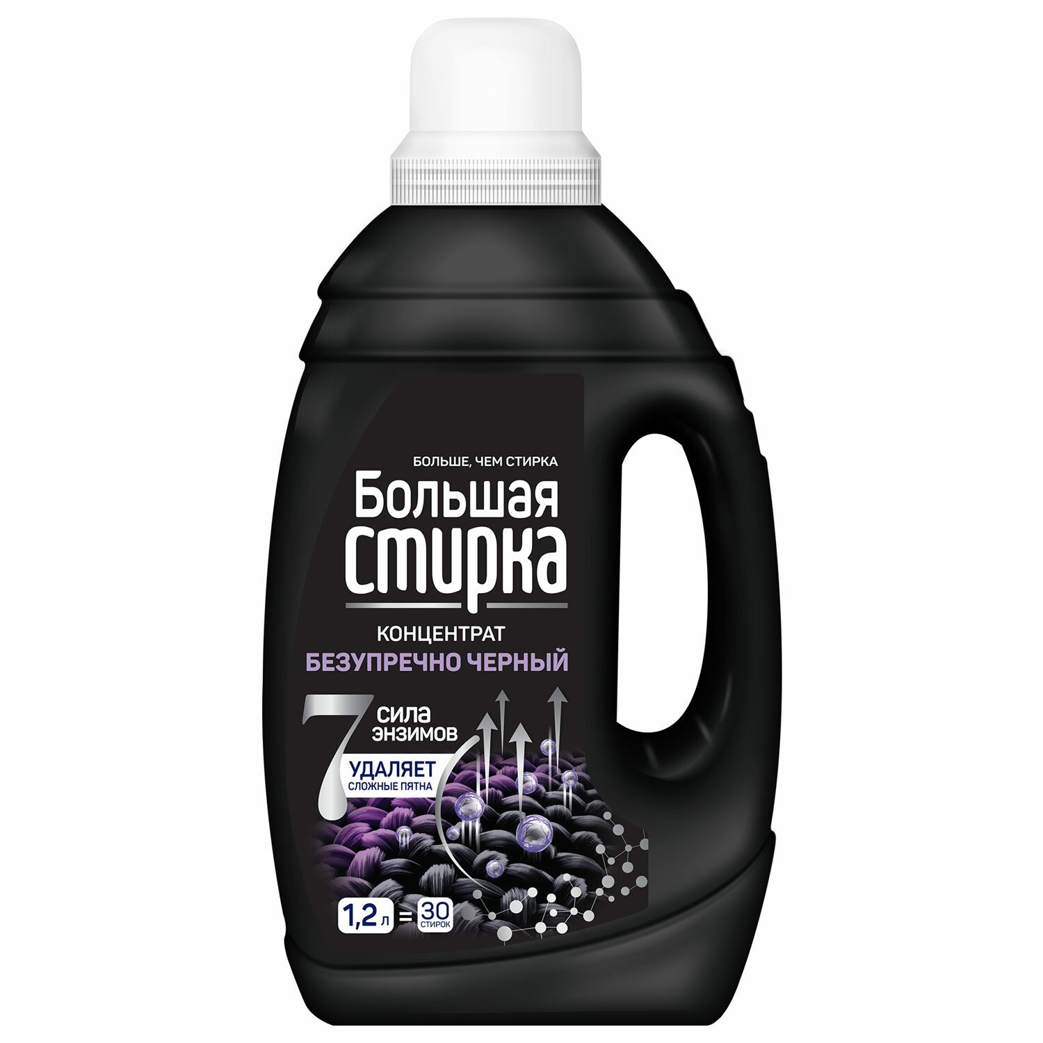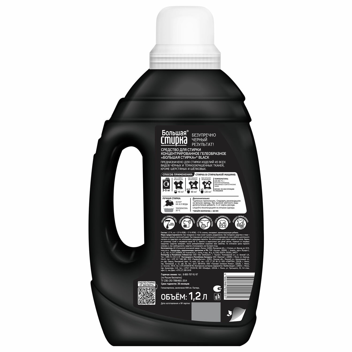 Гель-концентрат БОЛЬШАЯ СТИРКА идеально подходит для эффективной и бережной стирки чёрных и тёмных тканей с защитой от белых разводов.
