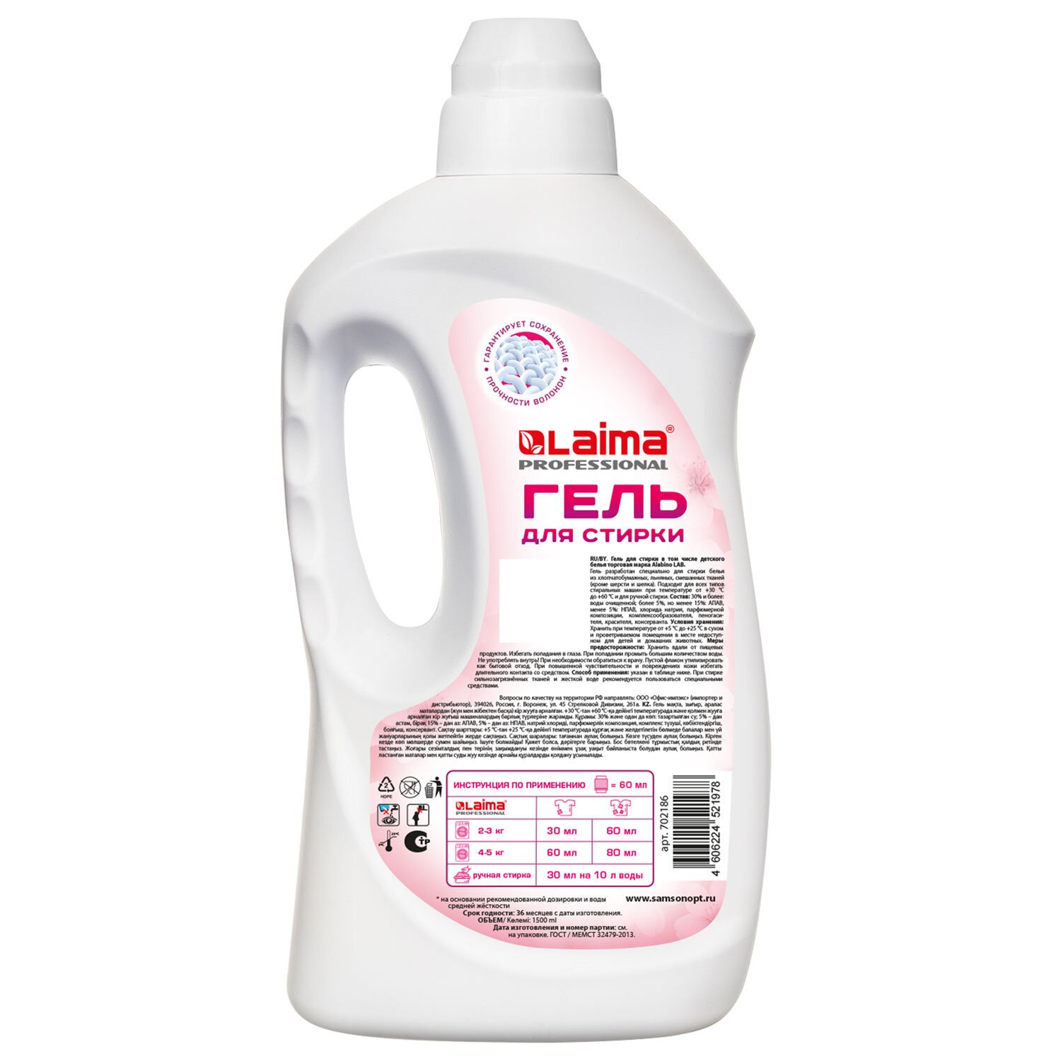 Гель LAIMA PROFESSIONAL разработан специально для стирки белья из хлопчатобумажных, льняных, смешанных тканей (кроме шерсти и шелка). Эффективно очищает, но при этом полностью вымывается в процессе полоскания, не остаётся на вещах.