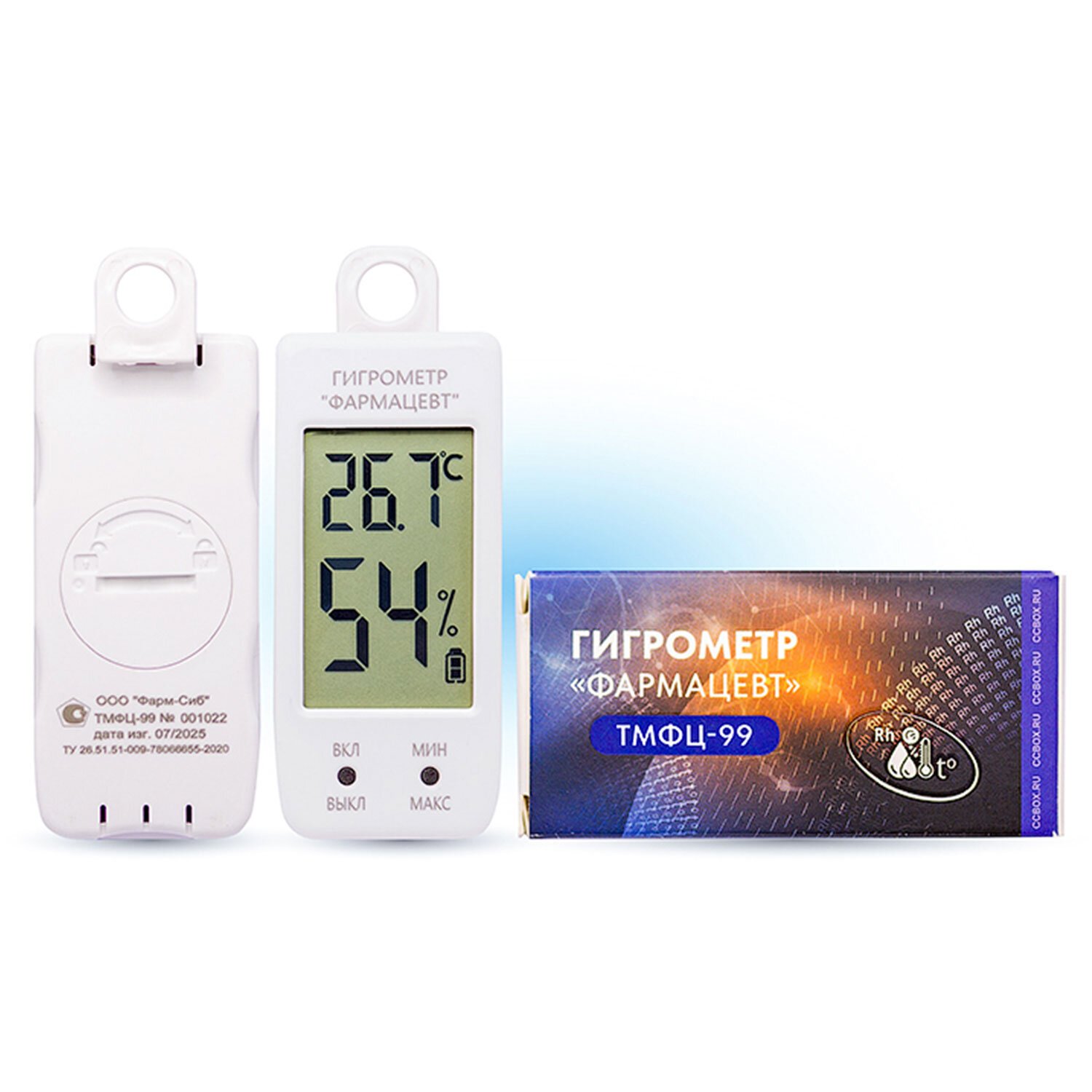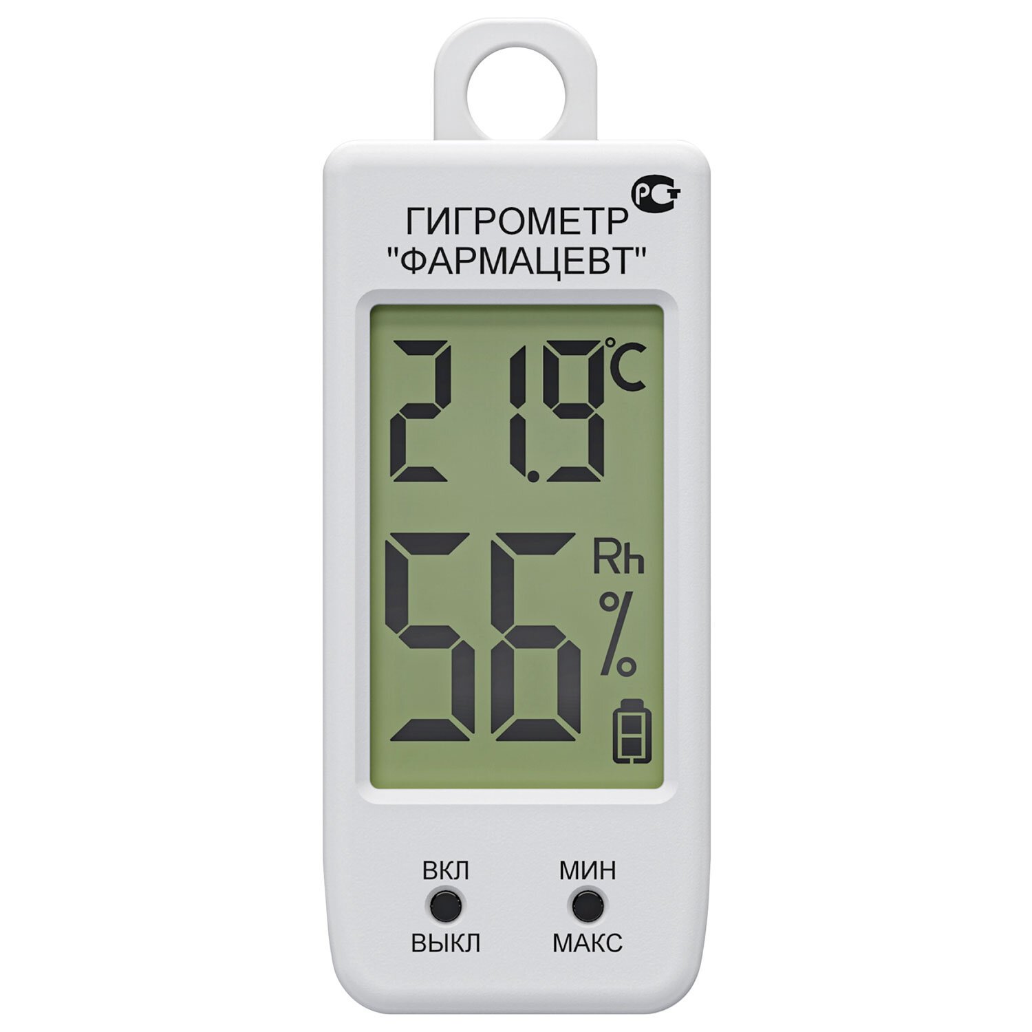 Гигрометр "Фармацевт" представляет собой автономное переносимое устройство, которое обеспечивает измерение и отображение относительной влажности и температуры воздуха в реальном времени на ж/к дисплее гигрометра; автоматическую запись и хранение измеренных значений с передачей на внешнее устройство. Гигрометр может применяться в медицинских, фармацевтических учреждениях, лабораториях и прочих организациях с целью измерения и контроля параметров относительной влажности и температуры воздуха.