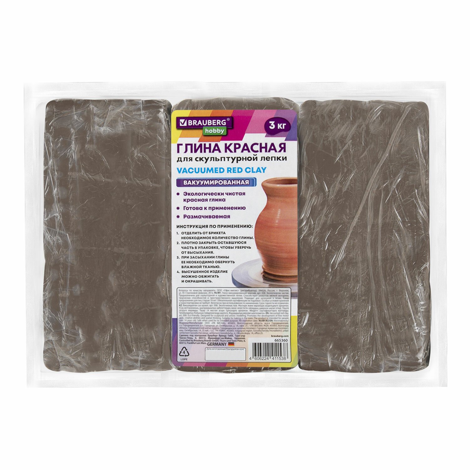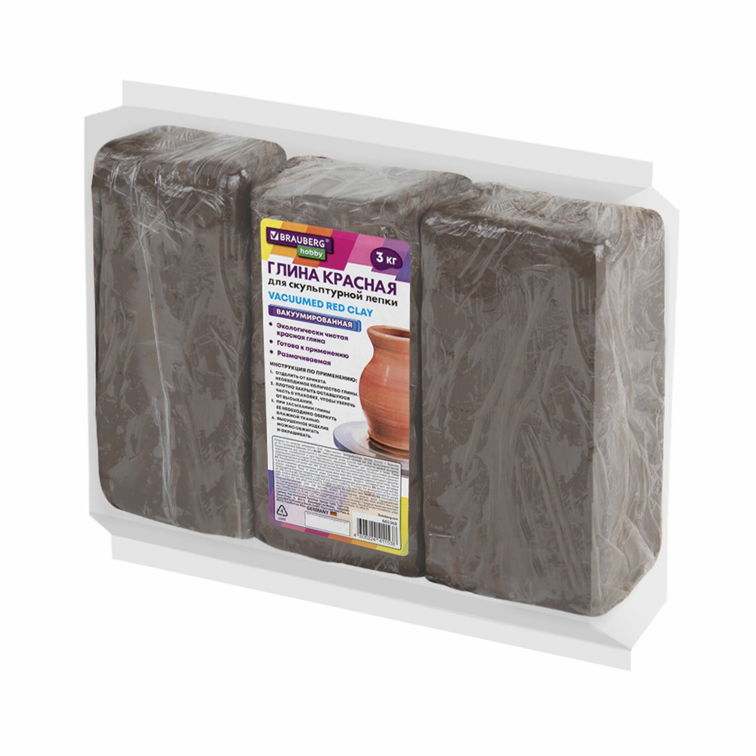 Глина для лепки красная, 3 кг, вакуумированная, готовая, размачиваемая, BRAUBERG HOBBY, 665360