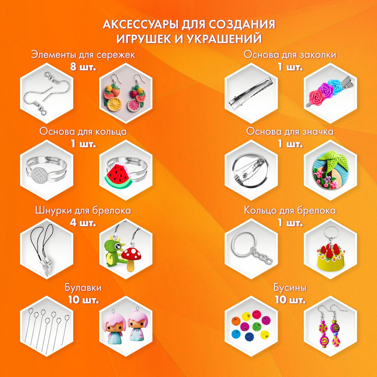 Набор включает в себя 24 бруска (по 20 г) полимерной глины разного цвета, 5 пластиковых стеков, комплект аксессуаров для создания поделок и Инструкцию по эксплуатации. Глина ярких и насыщенных цветов, не пачкает и не сушит руки, легко смывается с рук и рабочей поверхности водой или влажными салфетками.