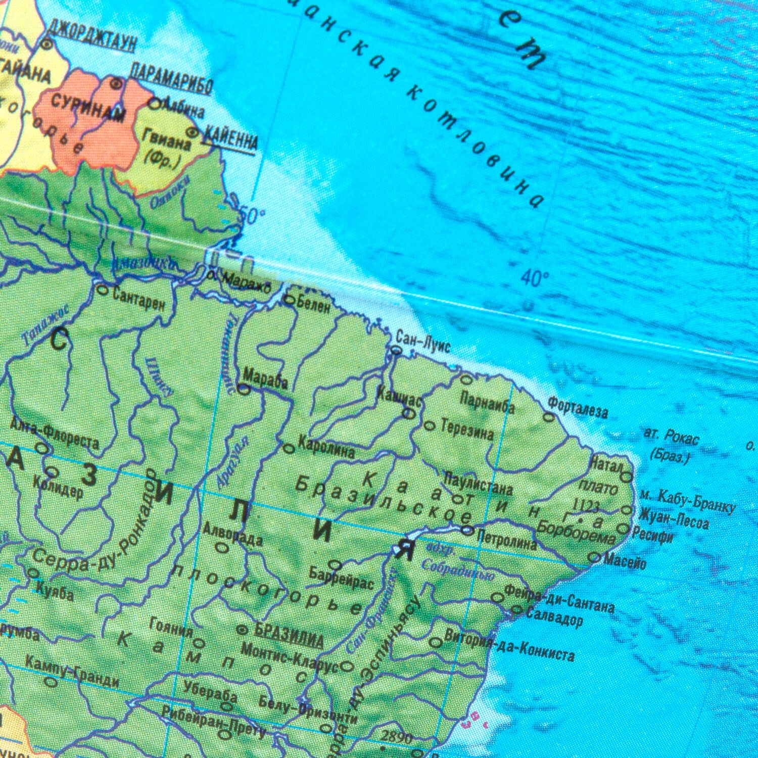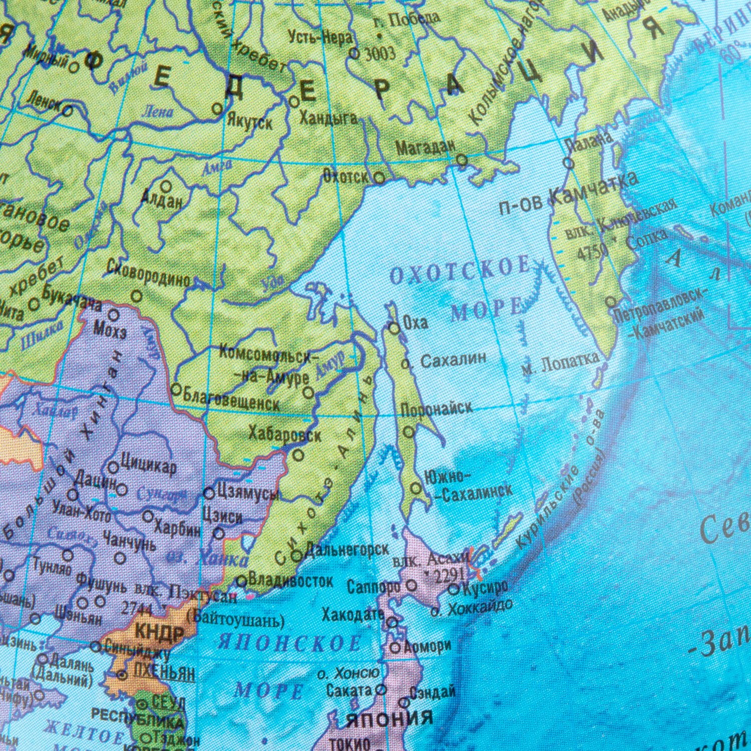 Сфера глобуса изготовлена из прочного пластика, устойчивого к случайным повреждениям. Глобус оклеен специализированной бумагой, на которую нанесена яркая политическая карта мира. Все территории стран выделены разными цветами, четко обозначены границы и столицы. При включении подсветки вы увидите карту звездного неба, адаптированную в цветовом решении для детского возраста. Особенно ярко выделяются созвездия, расположенные в астрономико-географическом соответствии на сфере глобуса. Эта дополнительная функция поможет ребенку в изучении астрономии и более полном восприятии окружающего его мира.