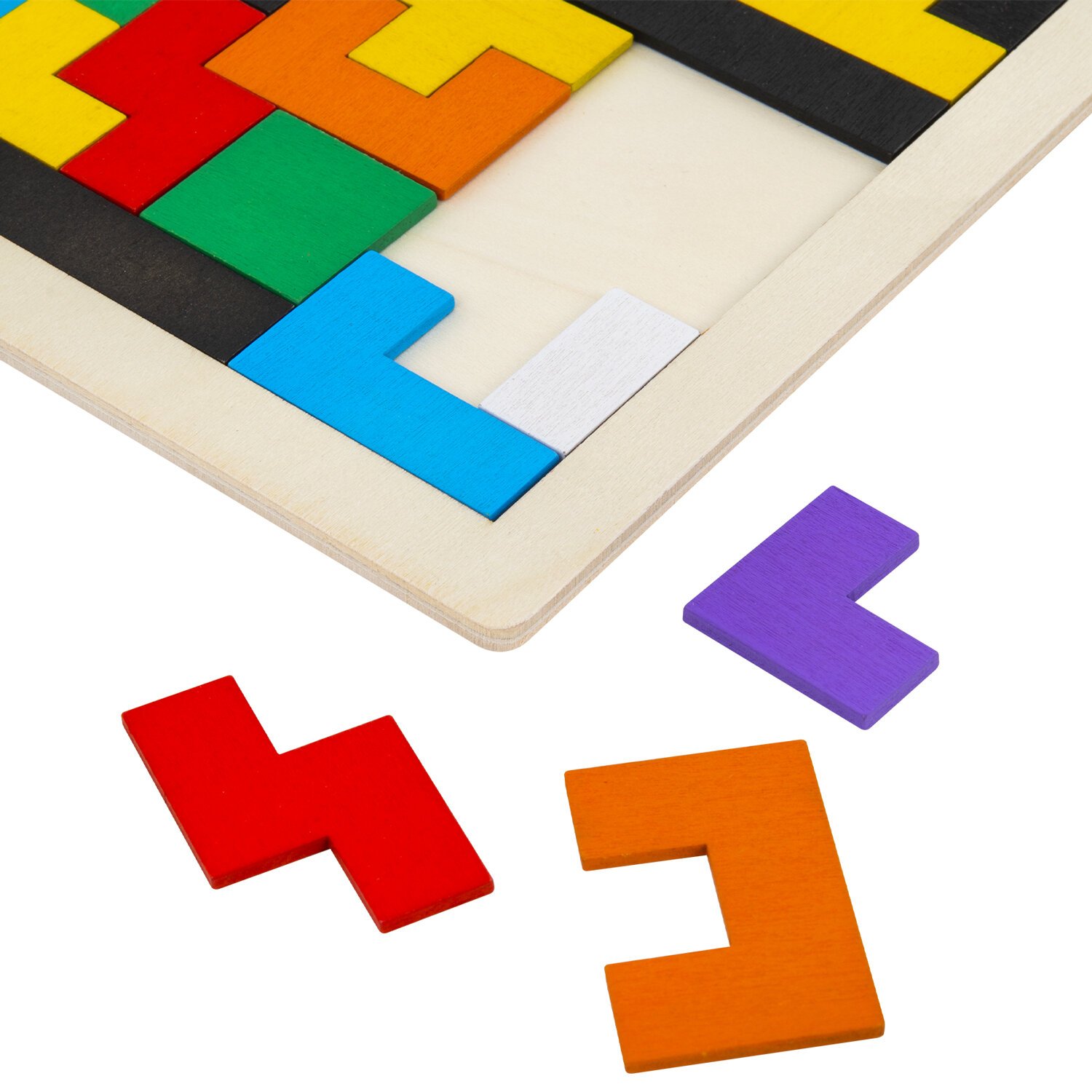 Головоломка состоит из 40 деревянных фигурок различных форм, которые нужно правильно сочетать, чтобы создать разнообразные композиции.