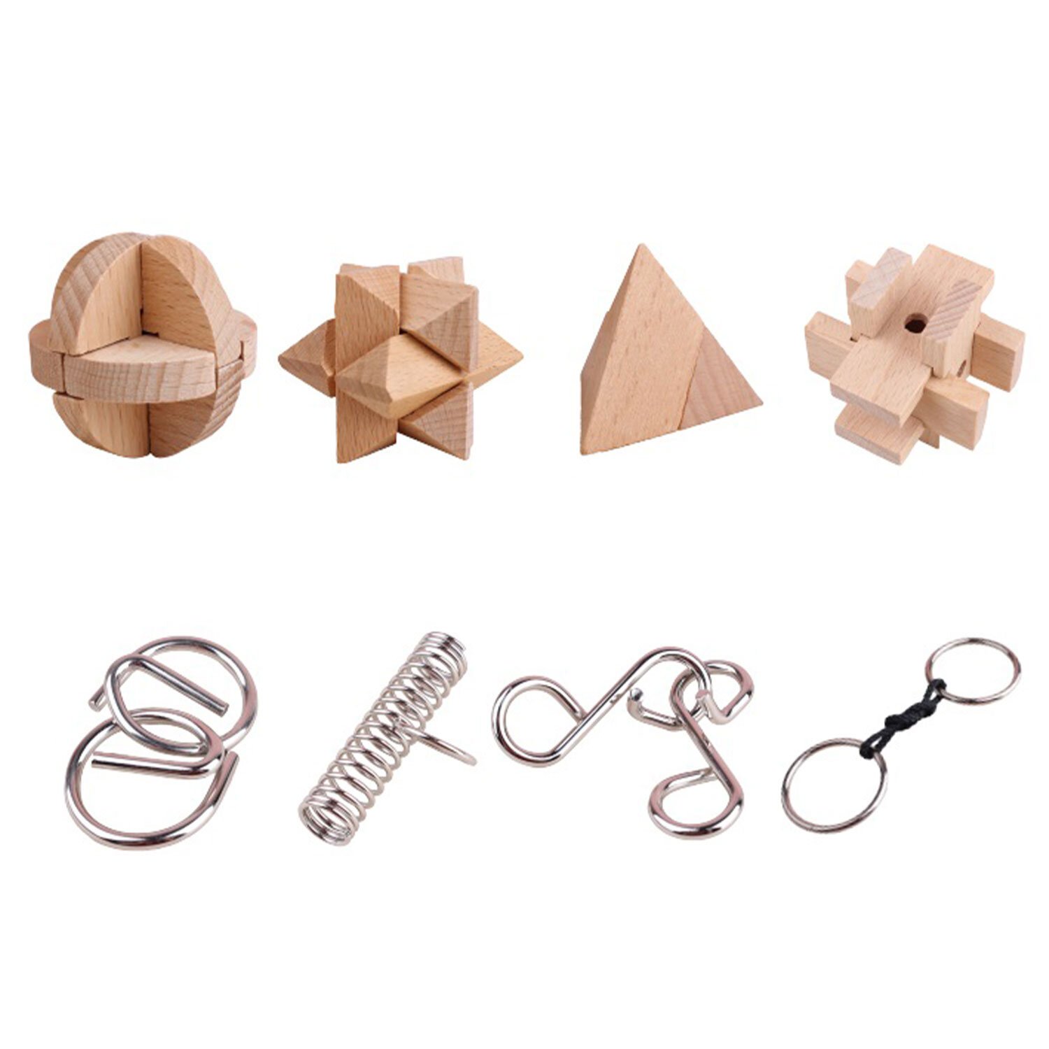 Головоломка представляет собой два или несколько элементов. Смысл решения головоломки в том, чтобы разъединить ее элементы, а затем соединить снова. В комплекте 8 разных деревянных и металлических головоломок, решение находится внутри.