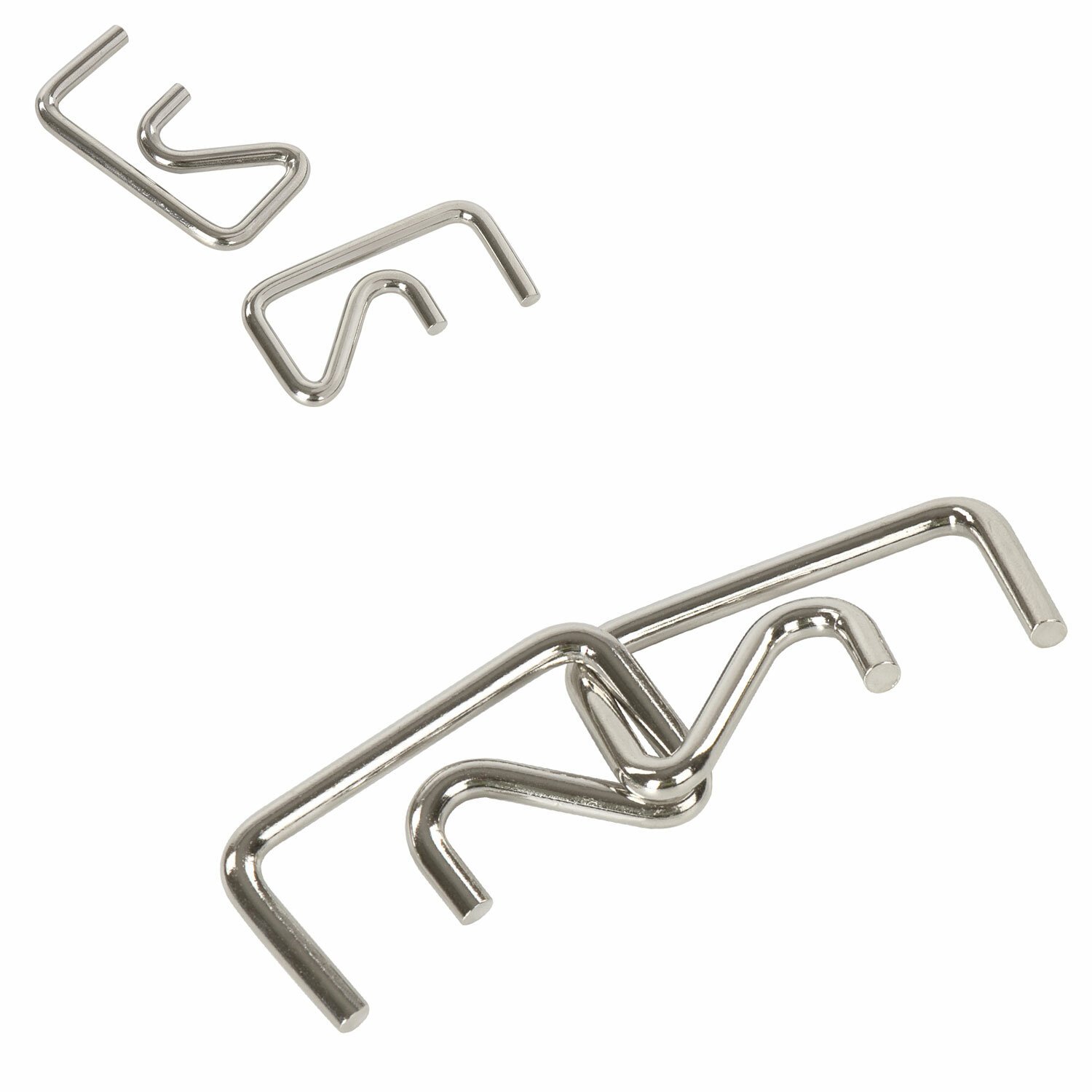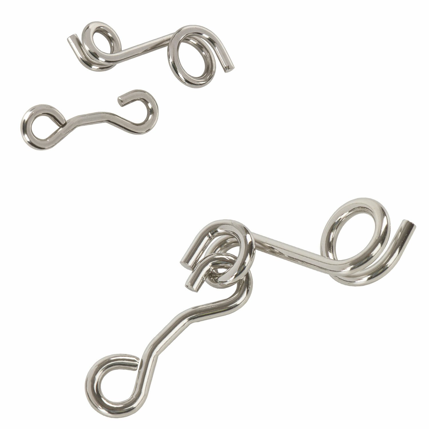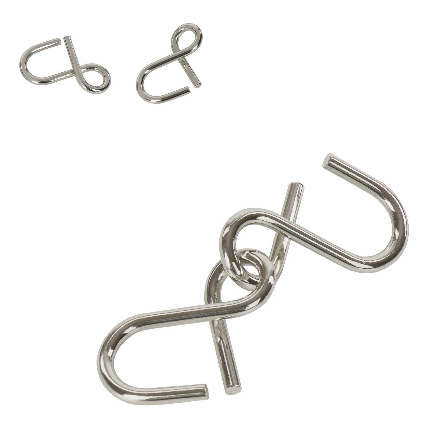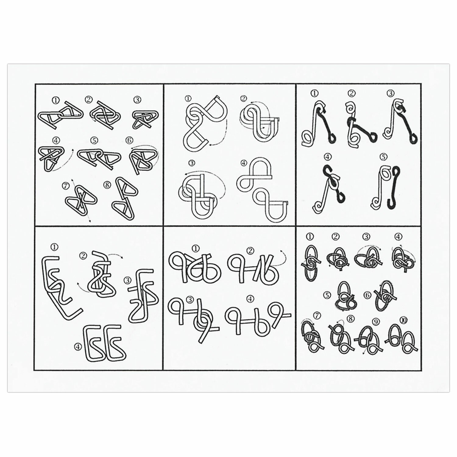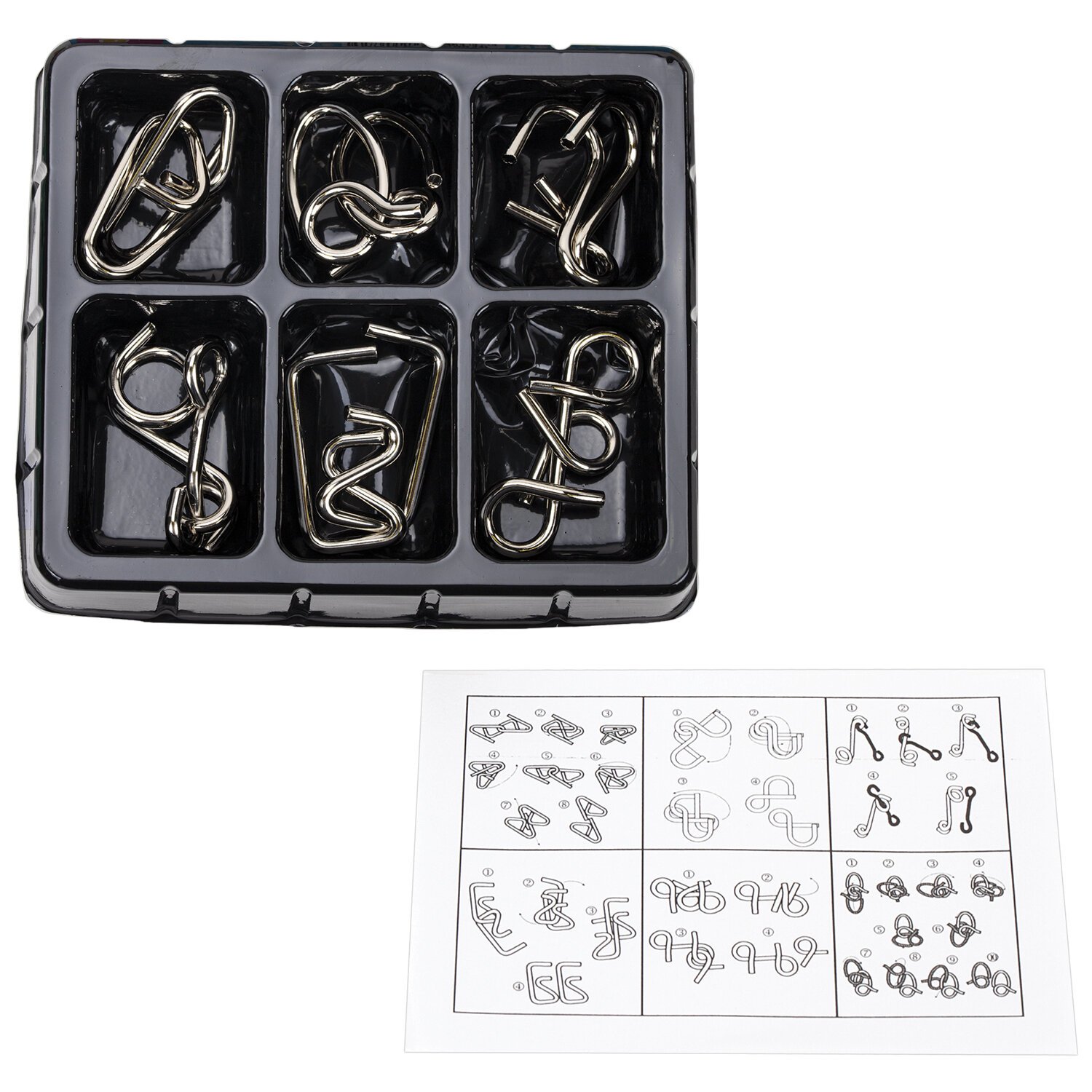 Металлический пазл представляет собой два элемента, изготовленных из стали диаметром 3,5 мм. Смысл решения головоломки в том, чтобы разъединить ее части, а затем соединить обратно. В коробке 6 разных головоломок, решение находится внутри.