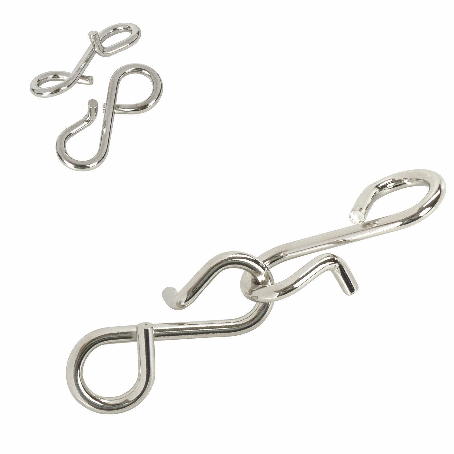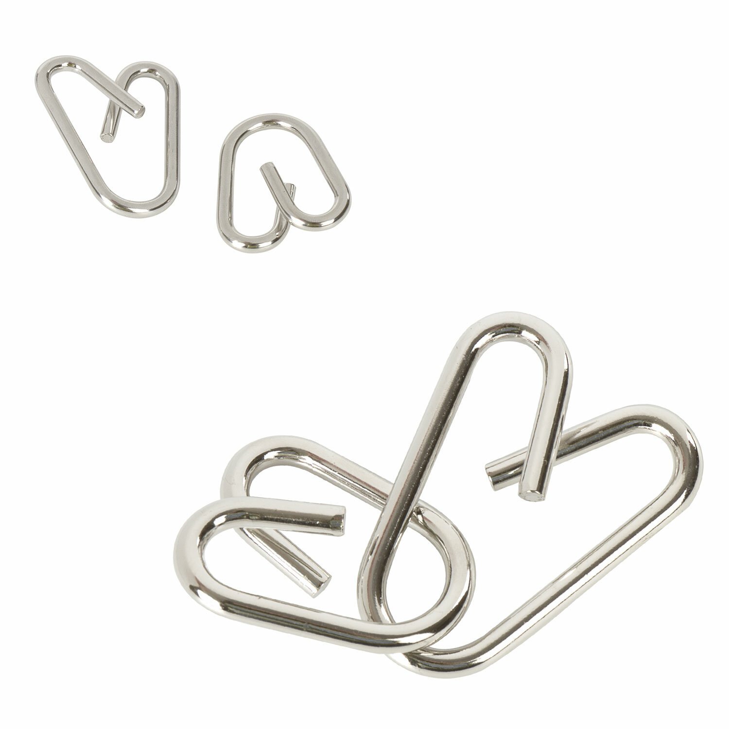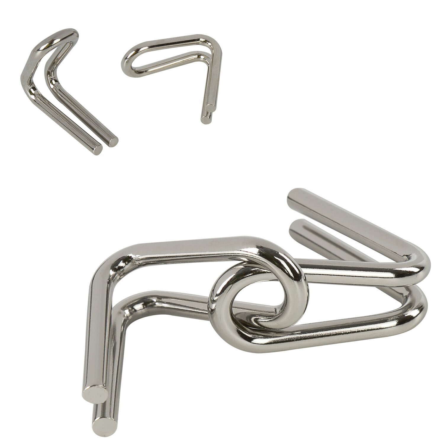 Металлический пазл представляет собой два элемента, изготовленных из стали диаметром 3,5 мм. Смысл решения головоломки в том, чтобы разъединить ее части, а затем соединить обратно. В коробке 6 разных головоломок, решение находится внутри.