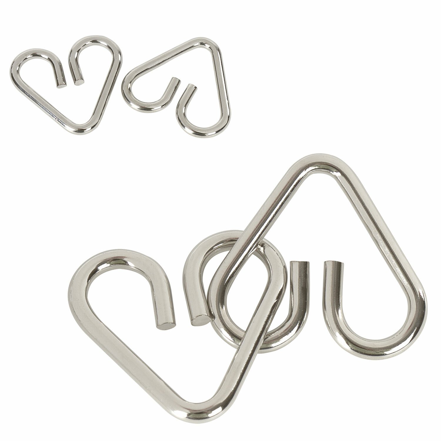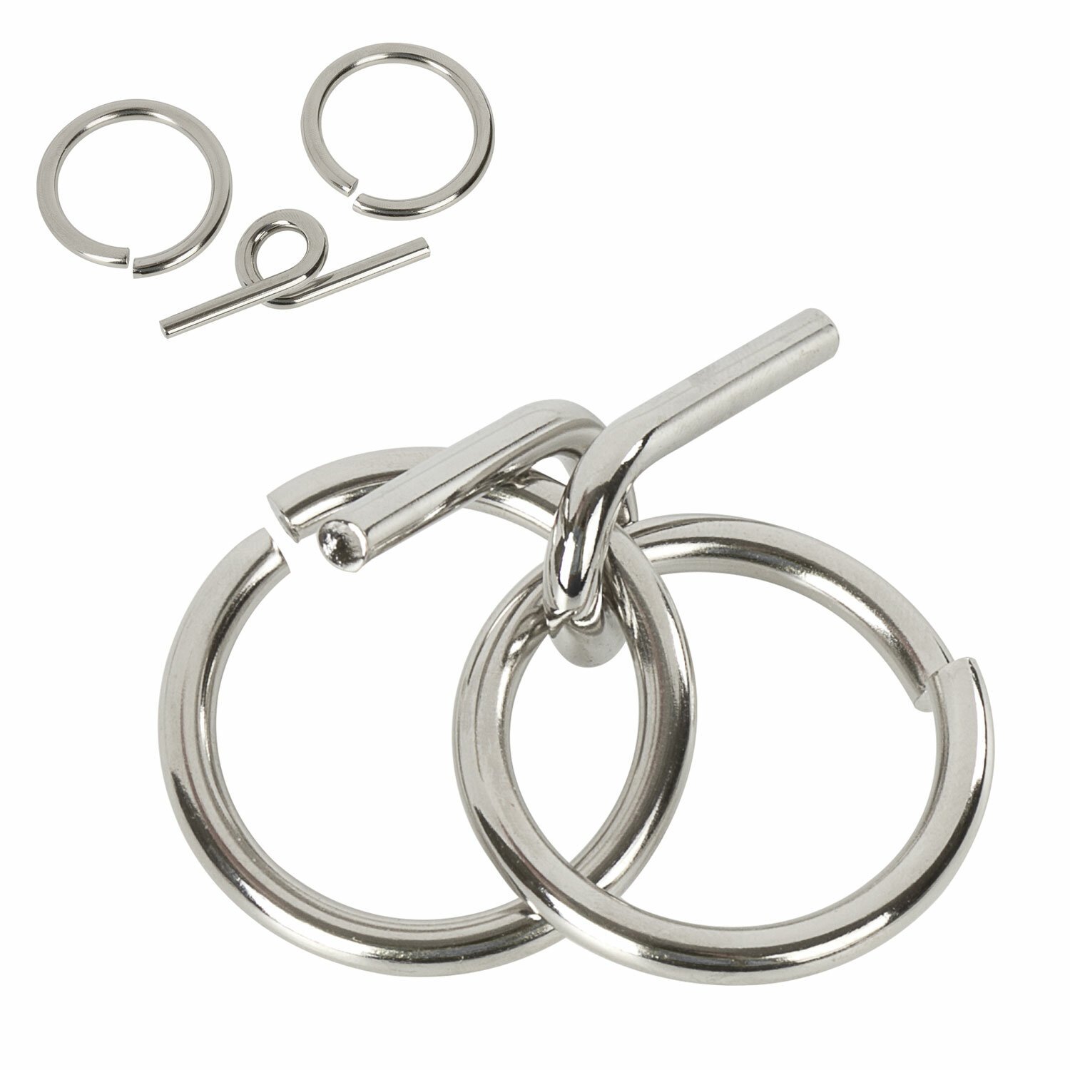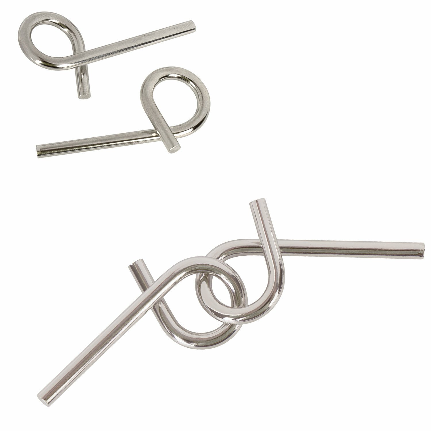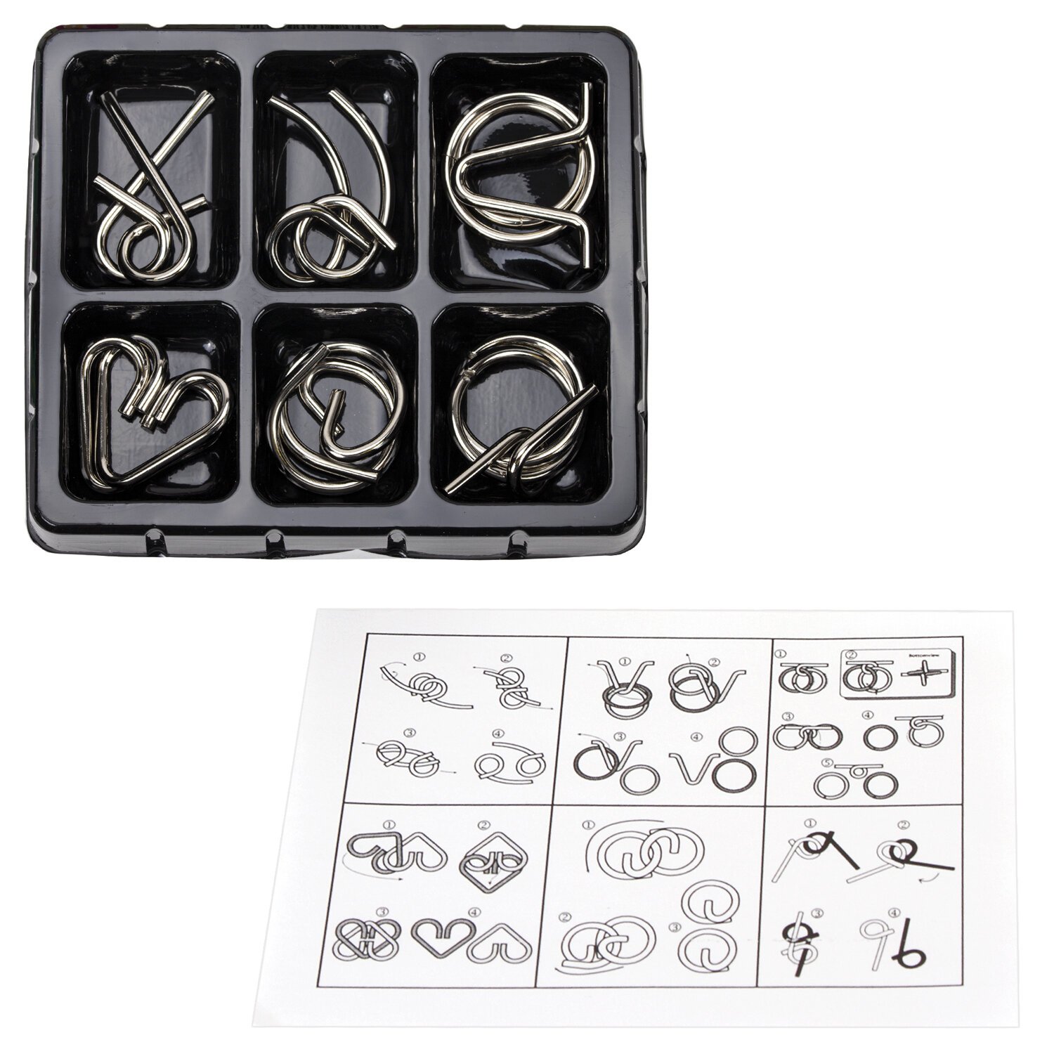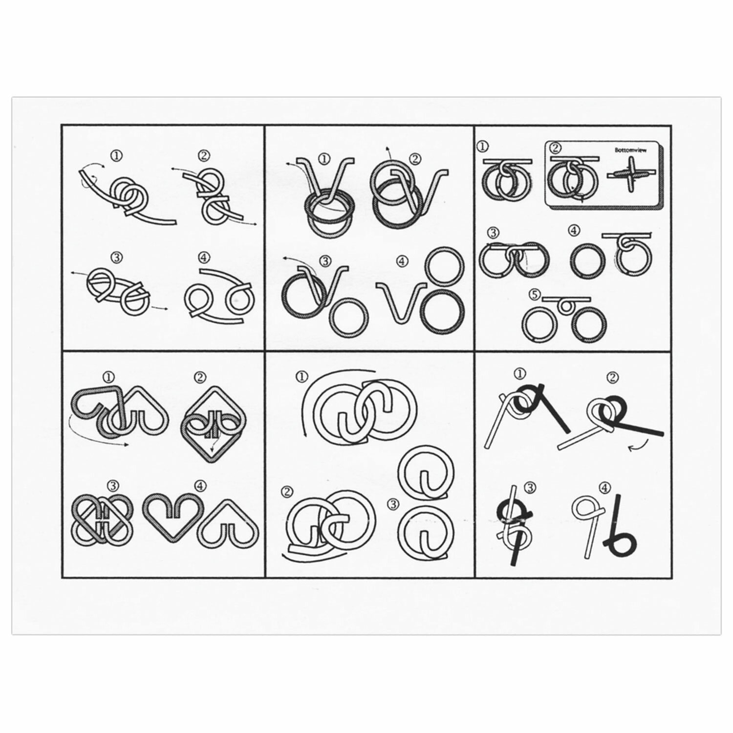 Металлический пазл представляет собой два элемента, изготовленных из стали диаметром 3,5 мм. Смысл решения головоломки в том, чтобы разъединить ее части, а затем соединить обратно. В коробке 6 разных головоломок, решение находится внутри.