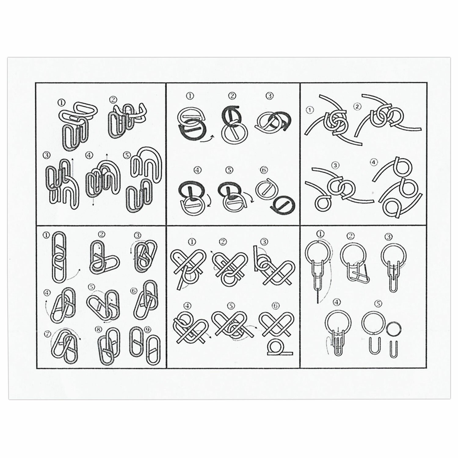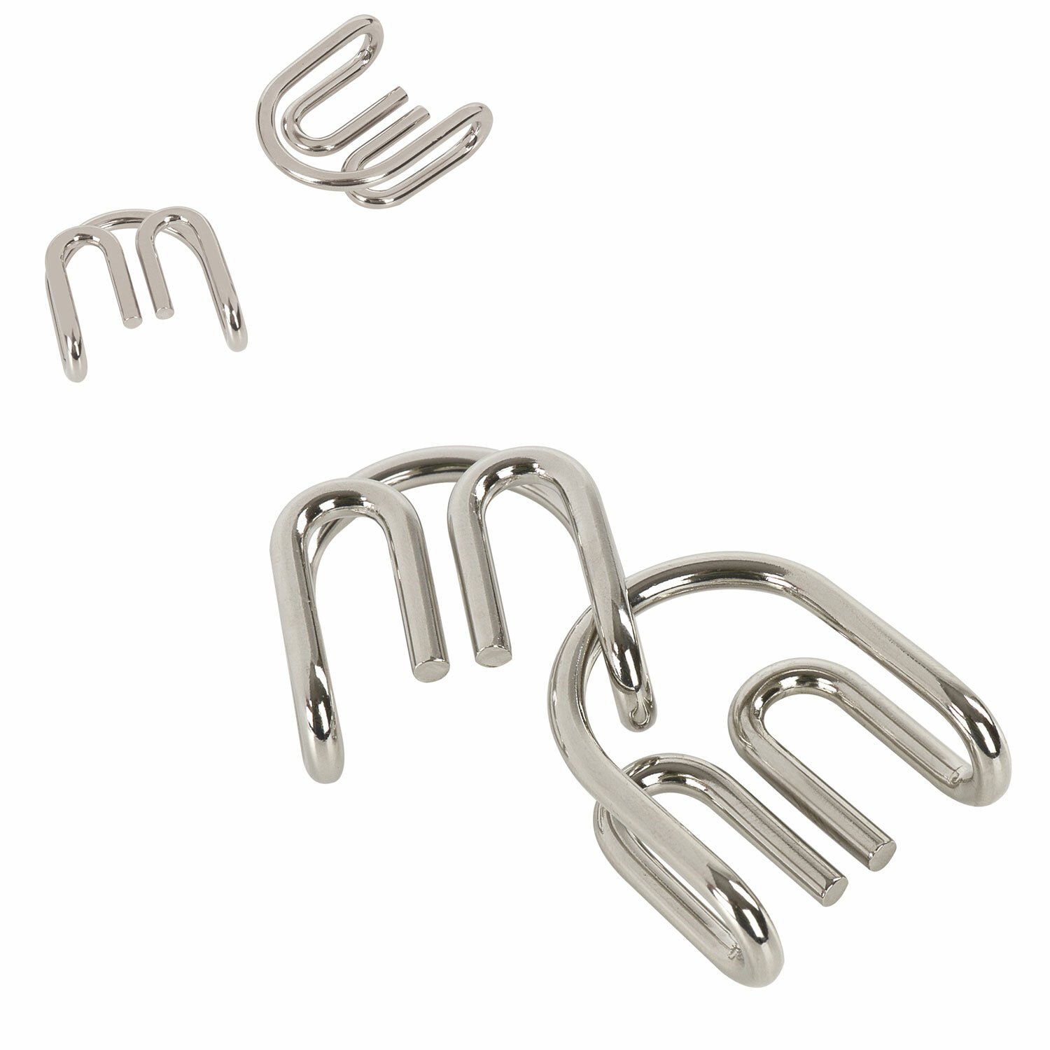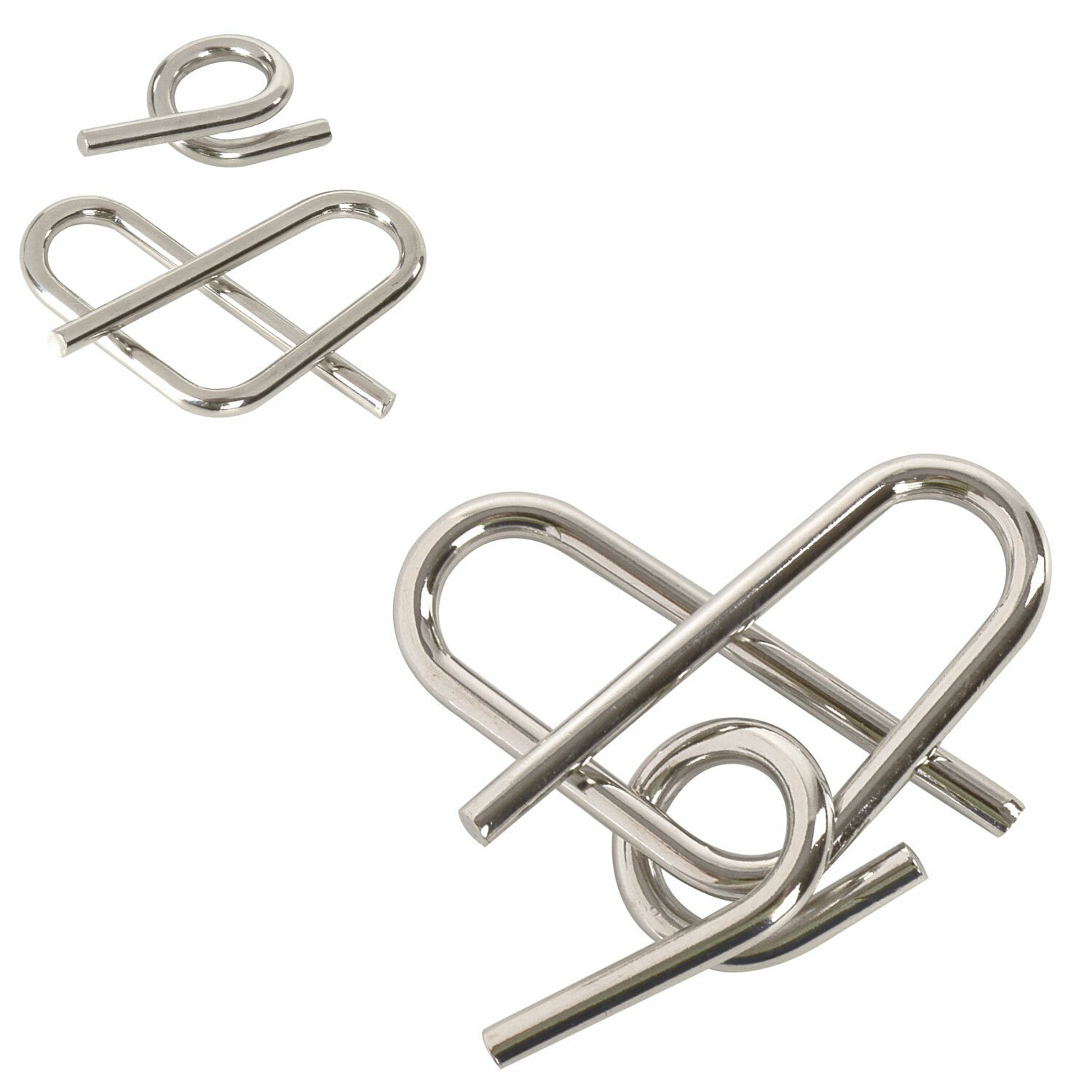Металлический пазл представляет собой два элемента, изготовленных из стали диаметром 3,5 мм. Смысл решения головоломки в том, чтобы разъединить ее части, а затем соединить обратно. В коробке 6 разных головоломок, решение находится внутри.