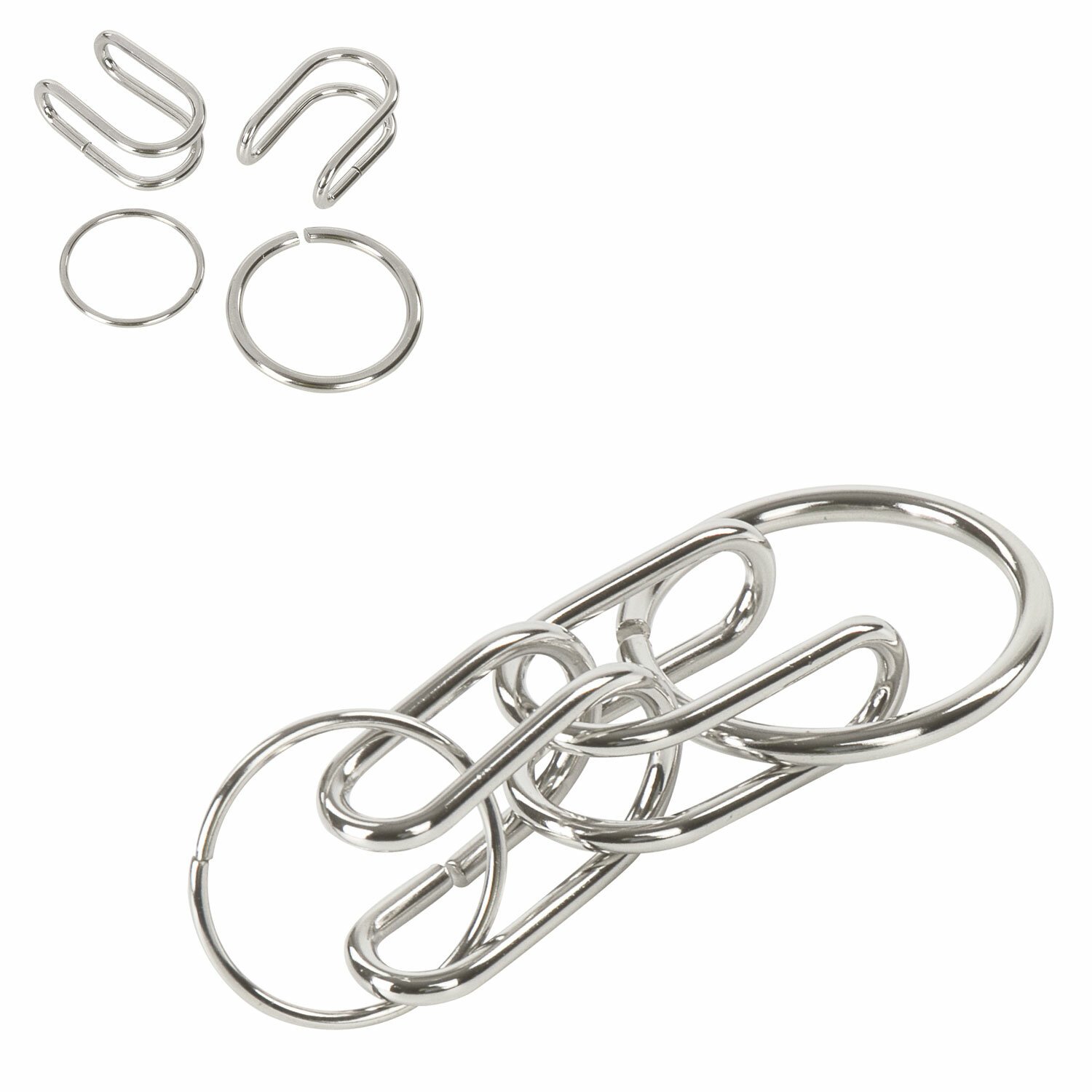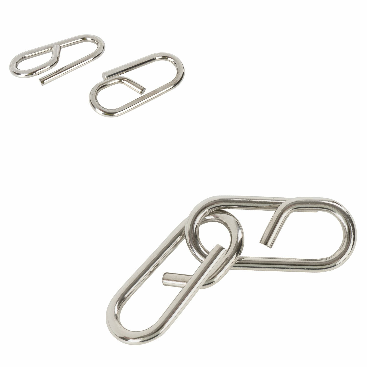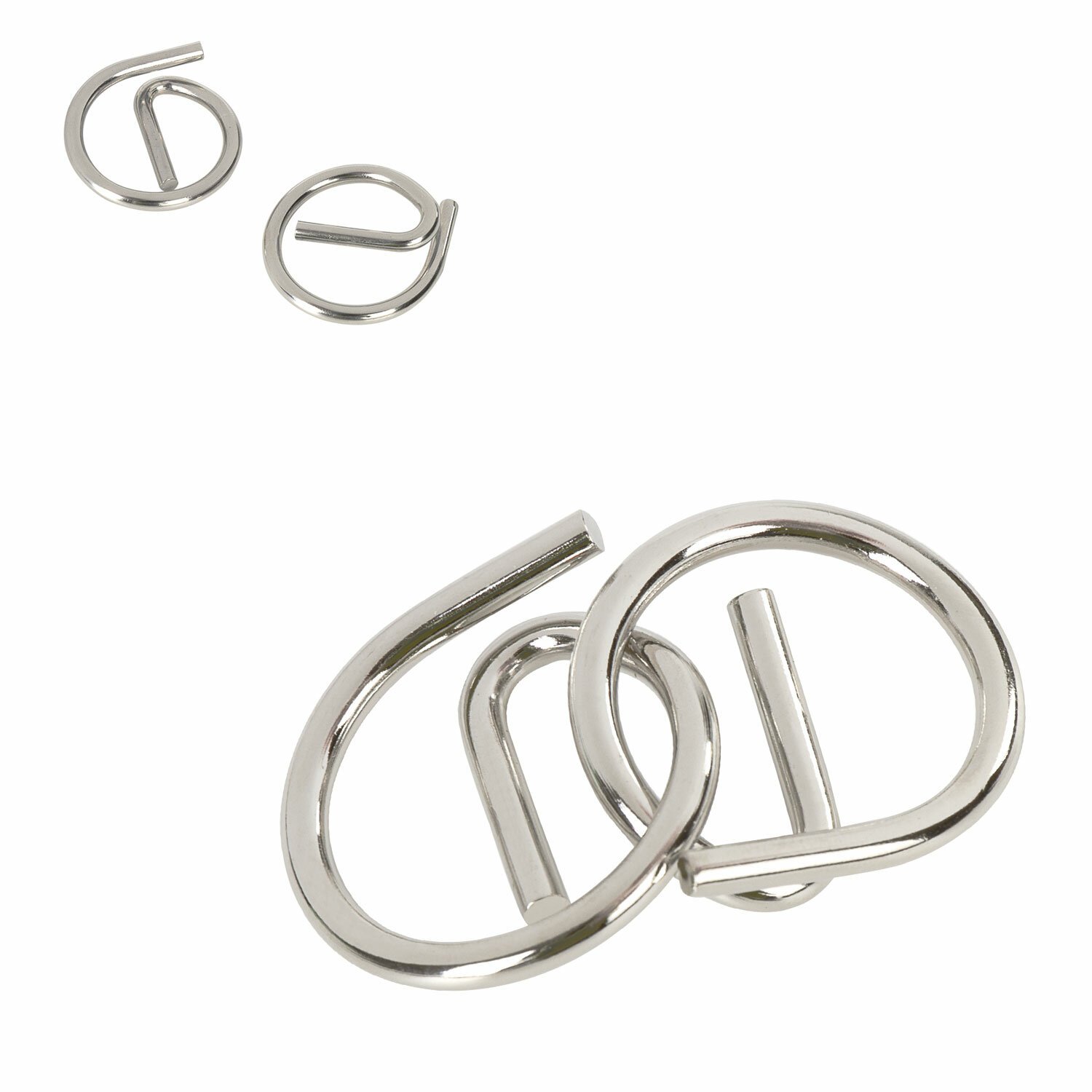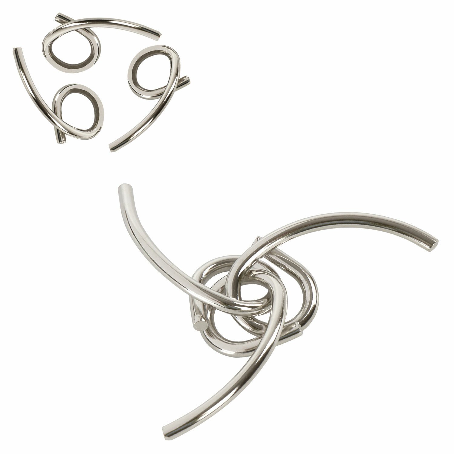 Металлический пазл представляет собой два элемента, изготовленных из стали диаметром 3,5 мм. Смысл решения головоломки в том, чтобы разъединить ее части, а затем соединить обратно. В коробке 6 разных головоломок, решение находится внутри.