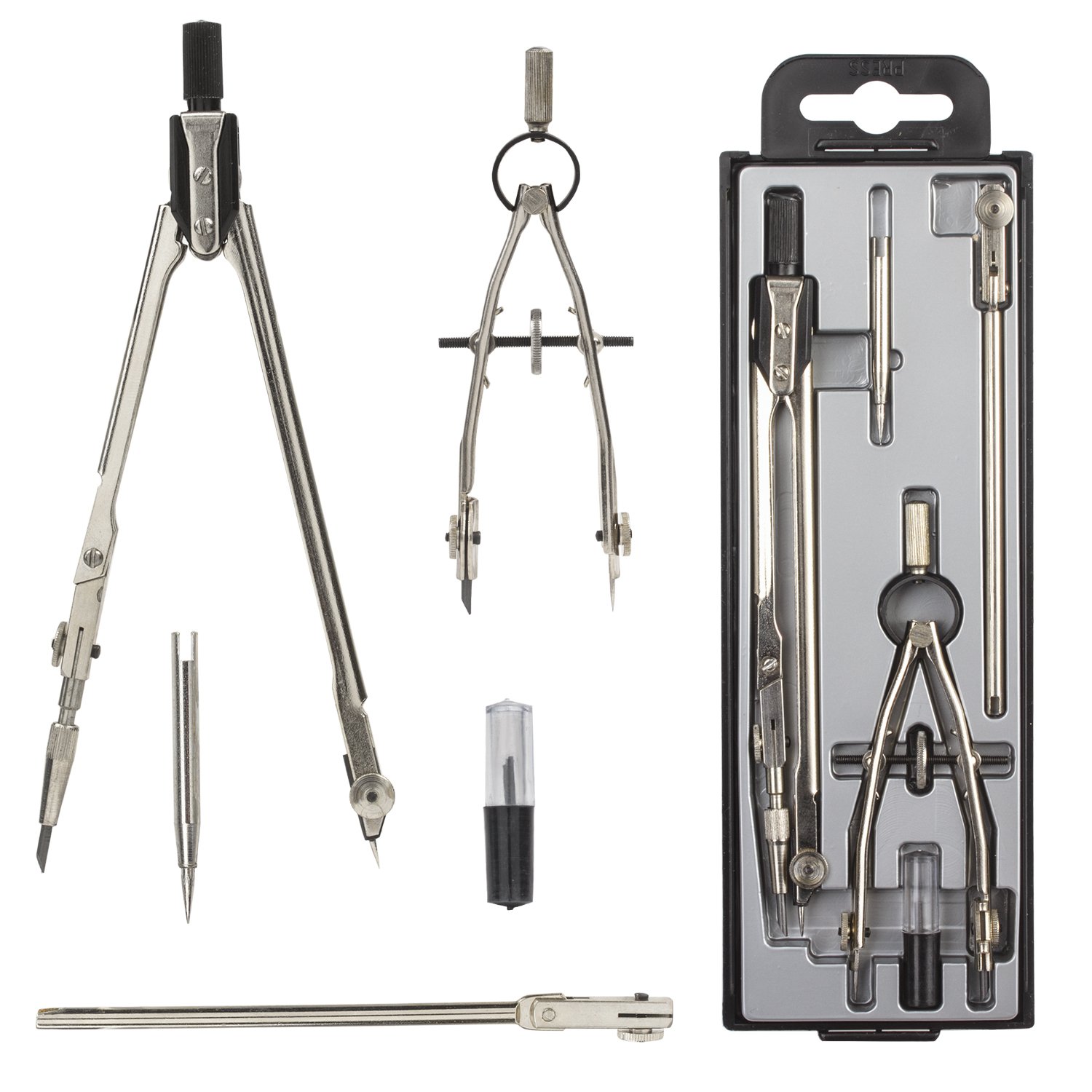 Готовальня BRAUBERG "Architect", 9 предметов: циркуль + измер + кронциркуль, рейсфедер + держатель, 2 вставки, удлинитель, грифель, 210353