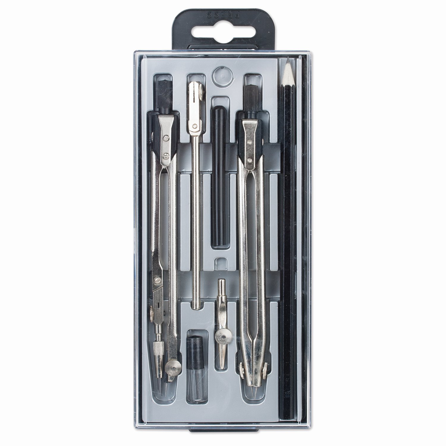 Готовальня для учеников старших классов и студентов. Инструмент отвечает всем требованиям ГОСТа. В комплекте: циркуль стальной никелированный, циркуль разметочный, пенал с запасным грифелем, карандашная вставка, ручка, удлинитель, запасной винт, карандаш.