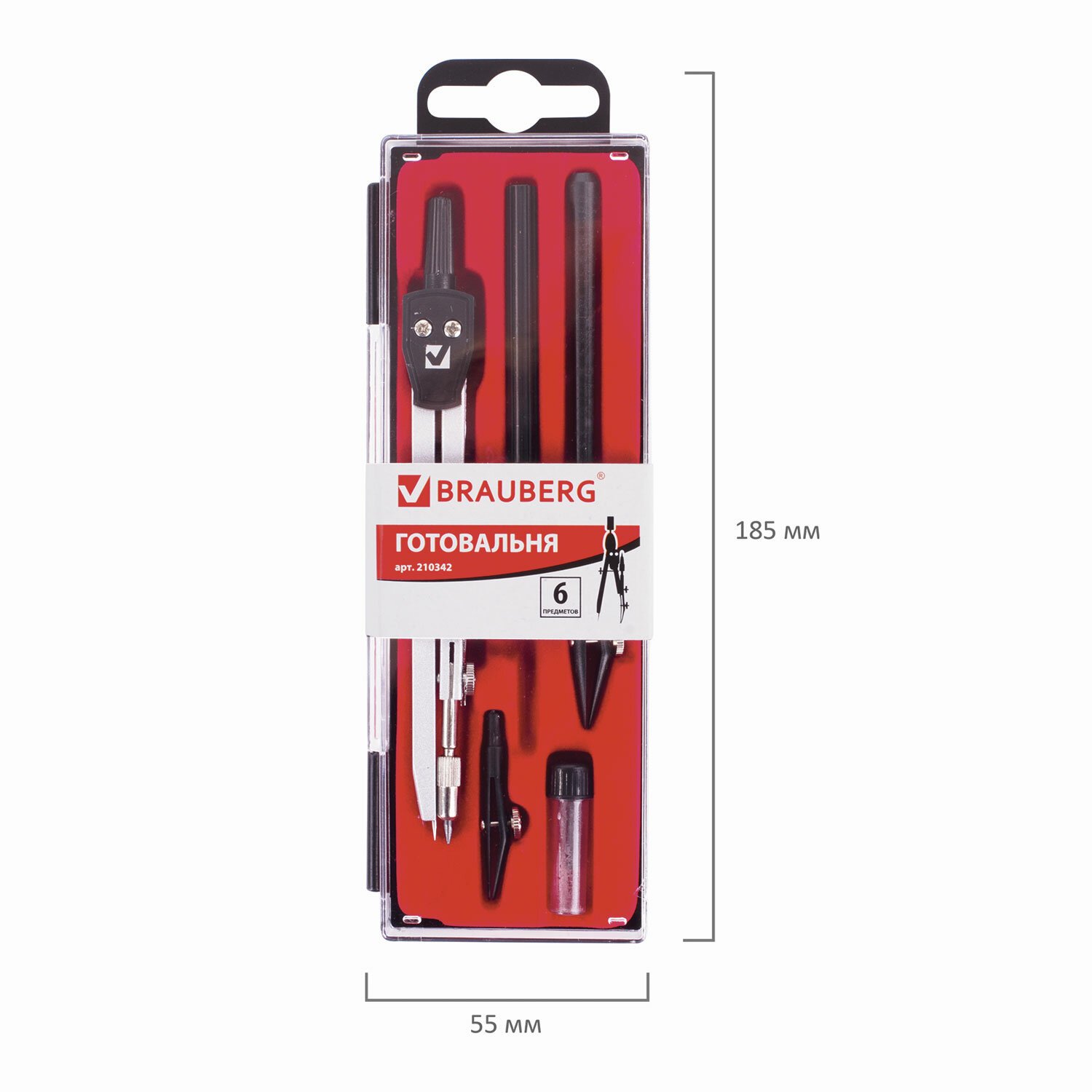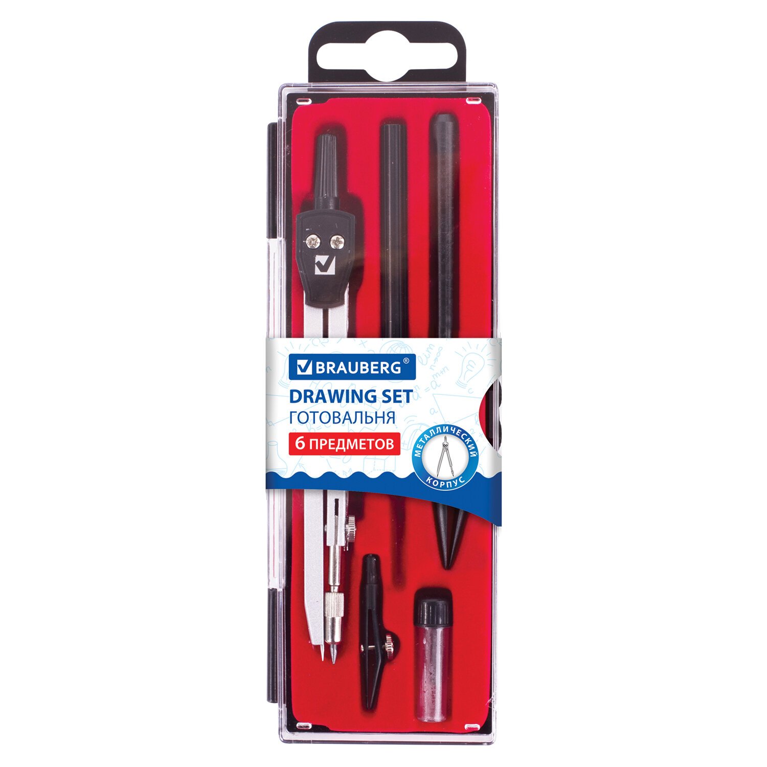 Готовальня BRAUBERG "Architect", 6 предметов: циркуль, рейсфедер + вставка + держатель, игольная вставка, грифель, 210342