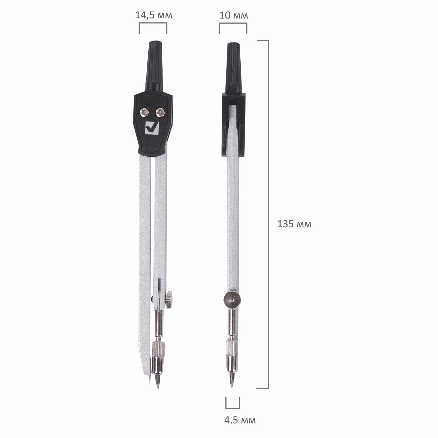 Циркуль длиной 135 мм имеет несгибаемые штанги. Изготовлен из металла, дополнительный цвет элементов - черный.
