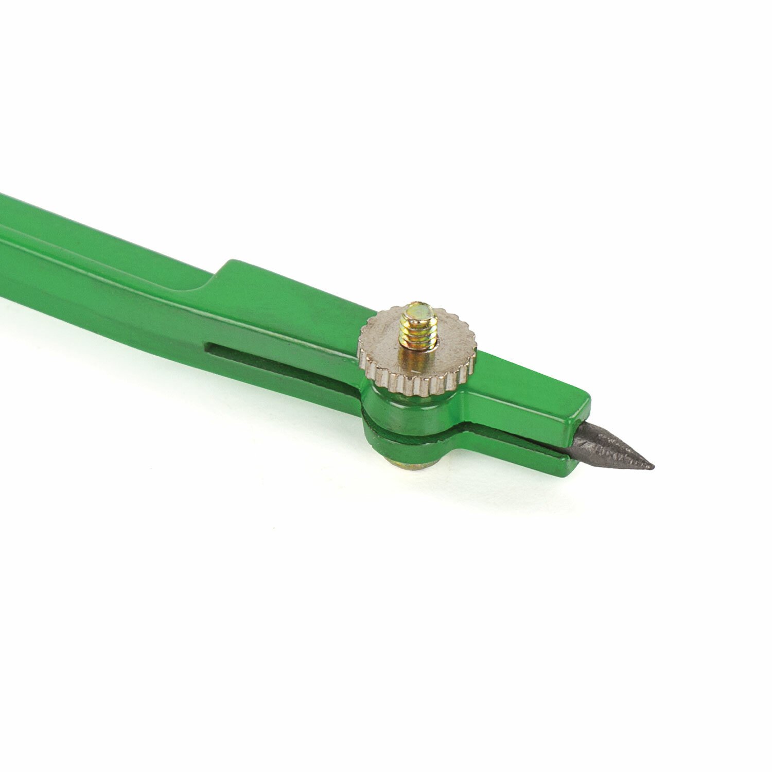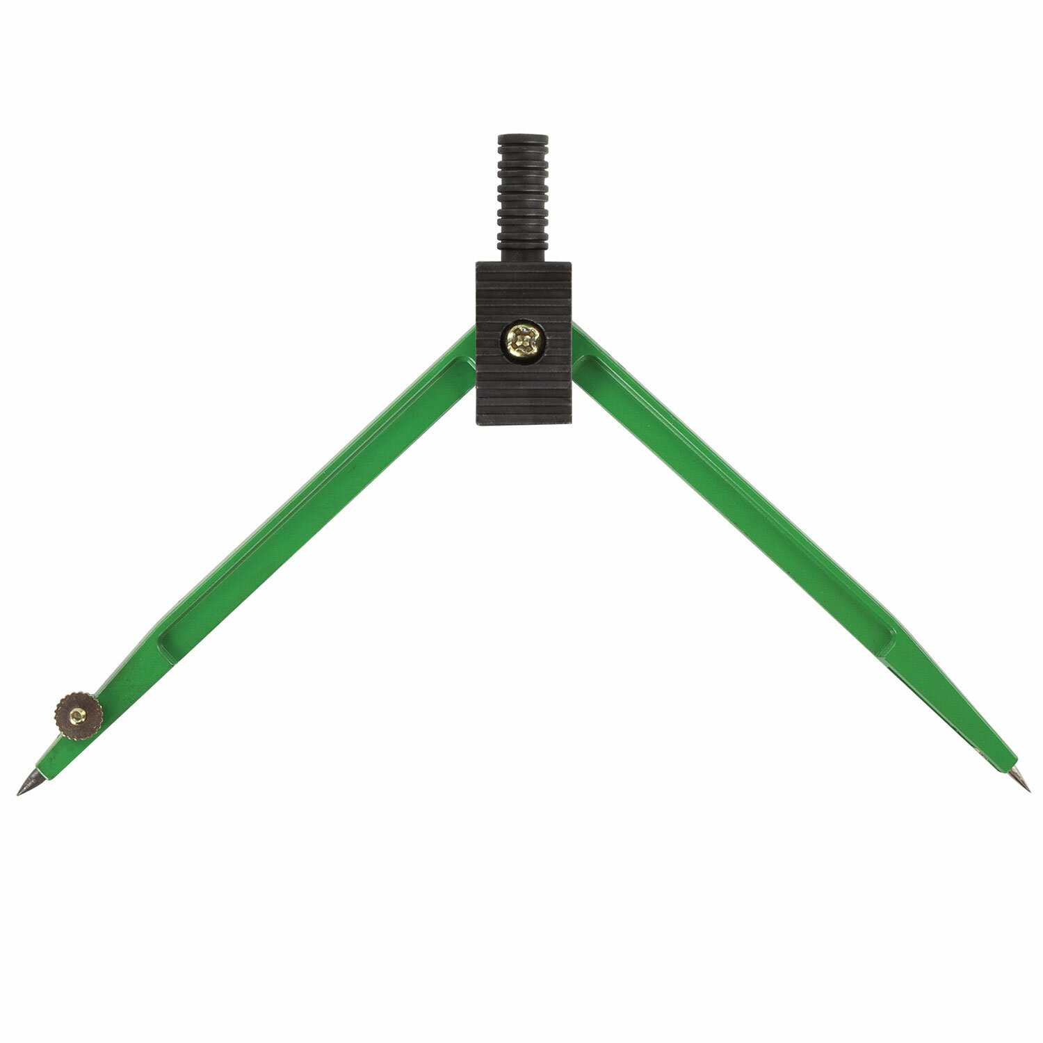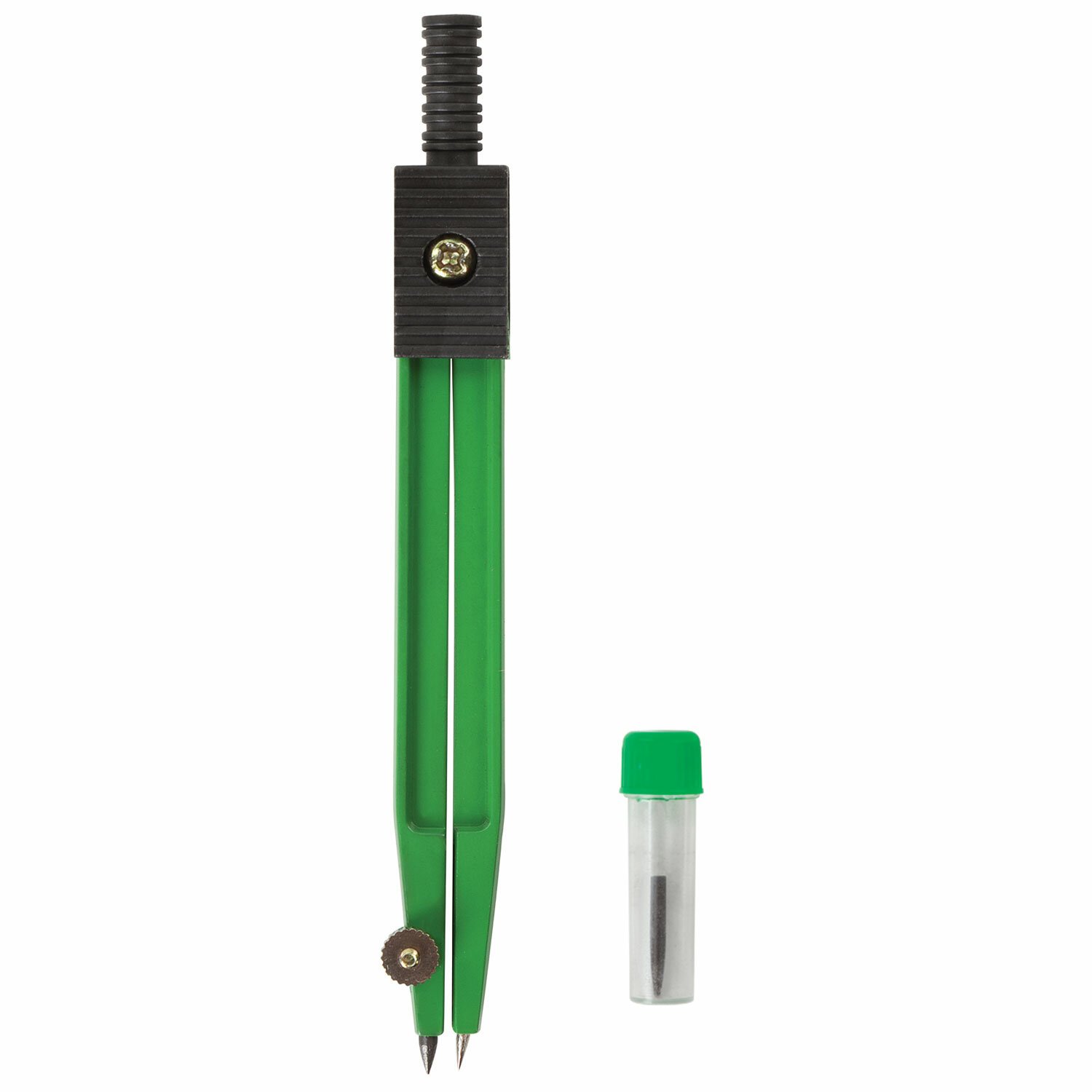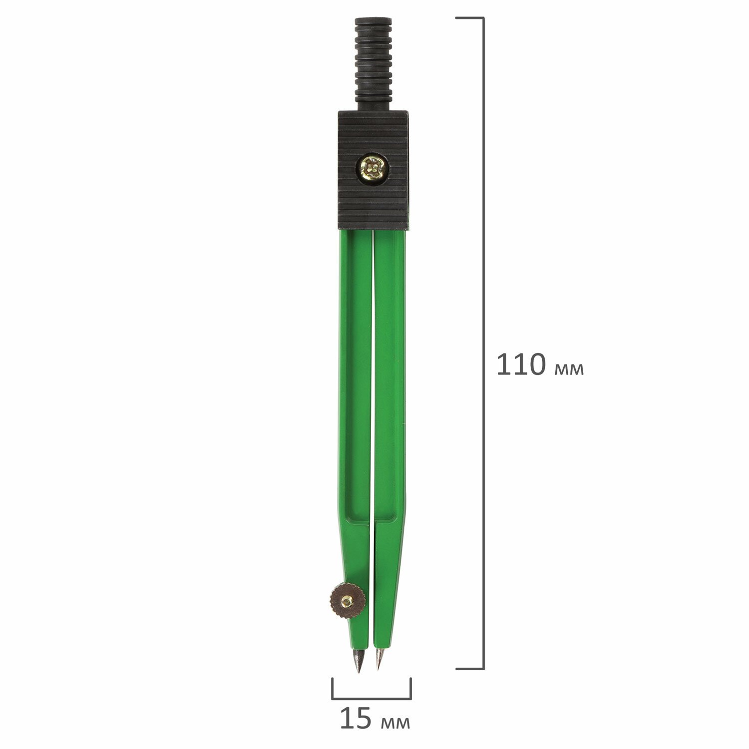 Циркуль длиной 110 мм имеет несгибаемые штанги и подстраиваемую иглу. Изготовлен из металла. Цвет - зеленый, дополнительный цвет элементов - черный.