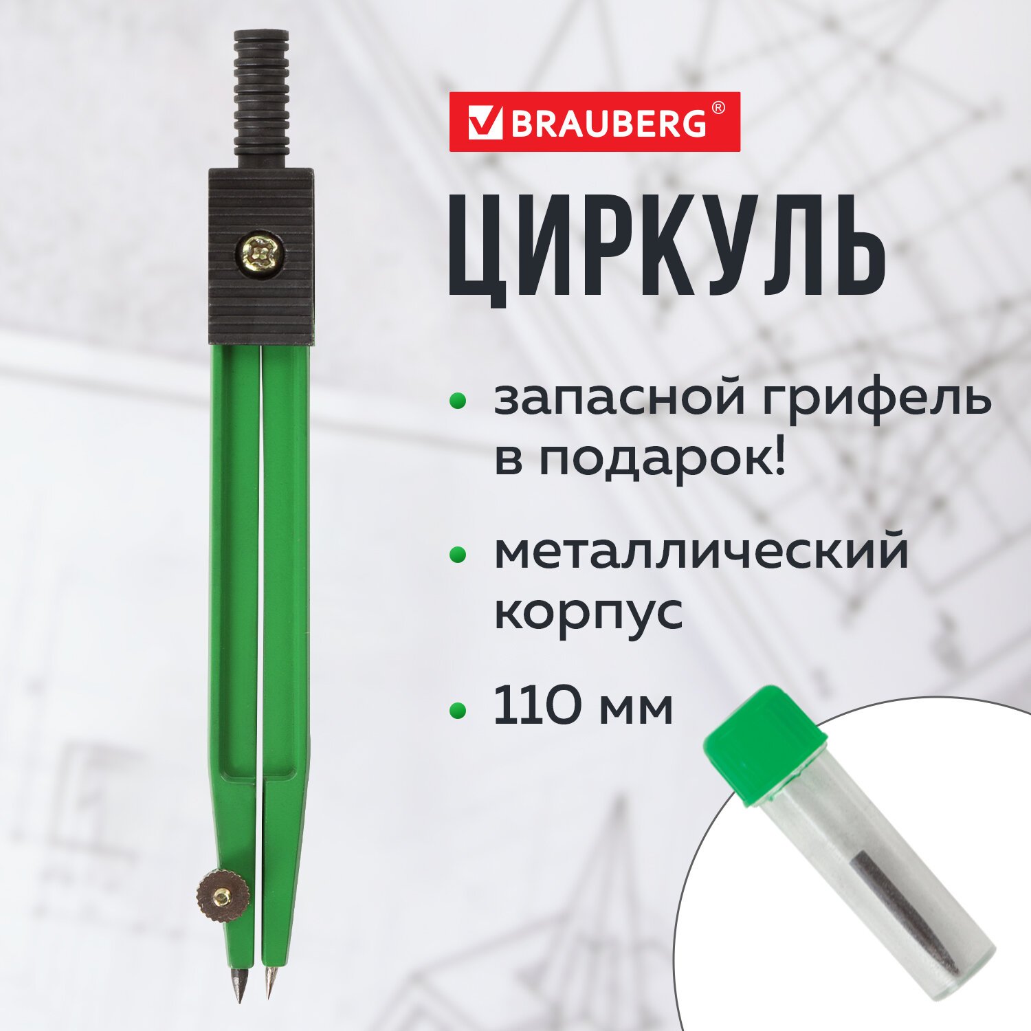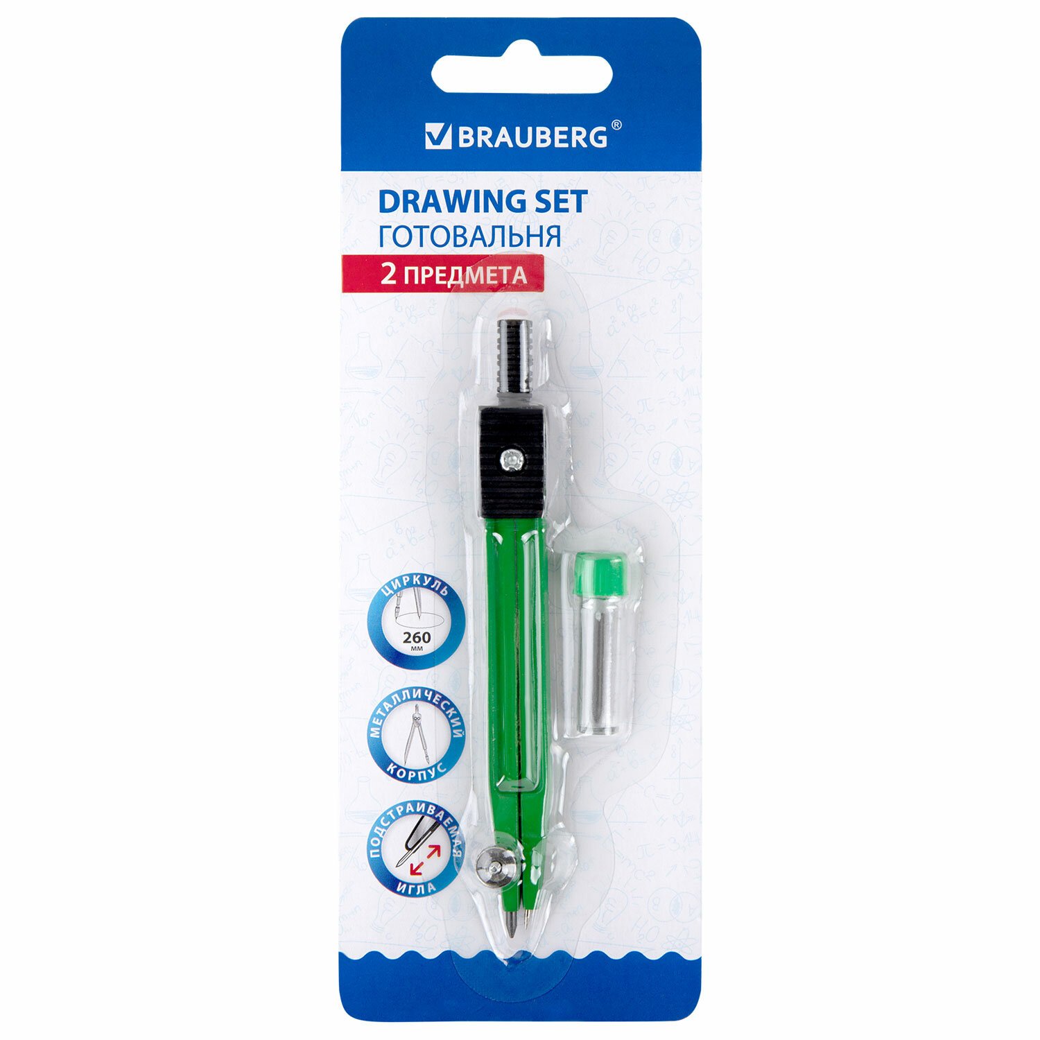 Готовальня BRAUBERG "Klasse", 2 предмета: циркуль 110 мм с подстраиваемой иглой, грифель, блистер, 210319