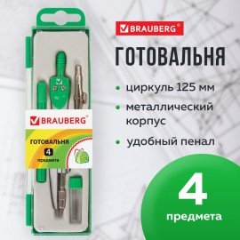Металлическая готовальня BRAUBERG "Klasse" предназначена для выполнения чертежных работ. Для учеников младших и средних классов.