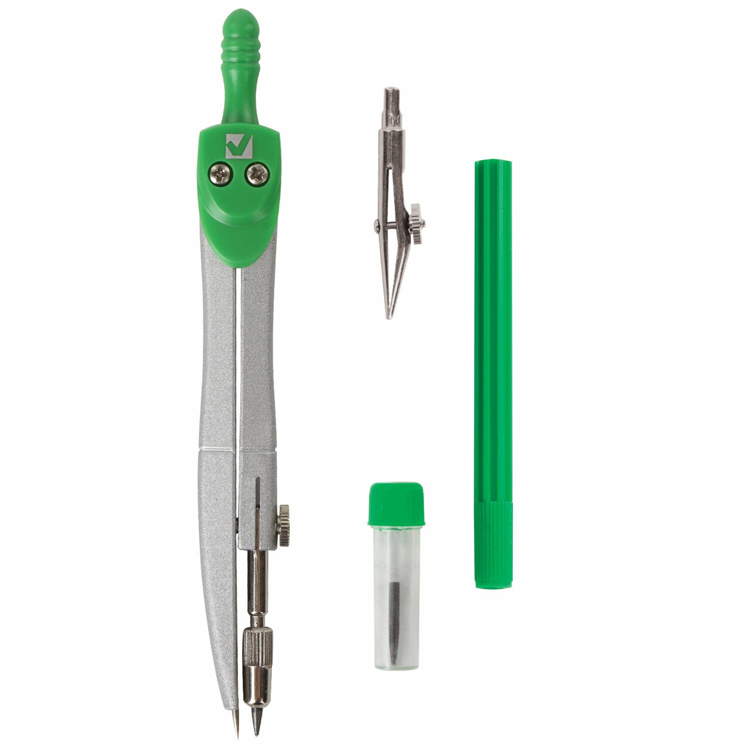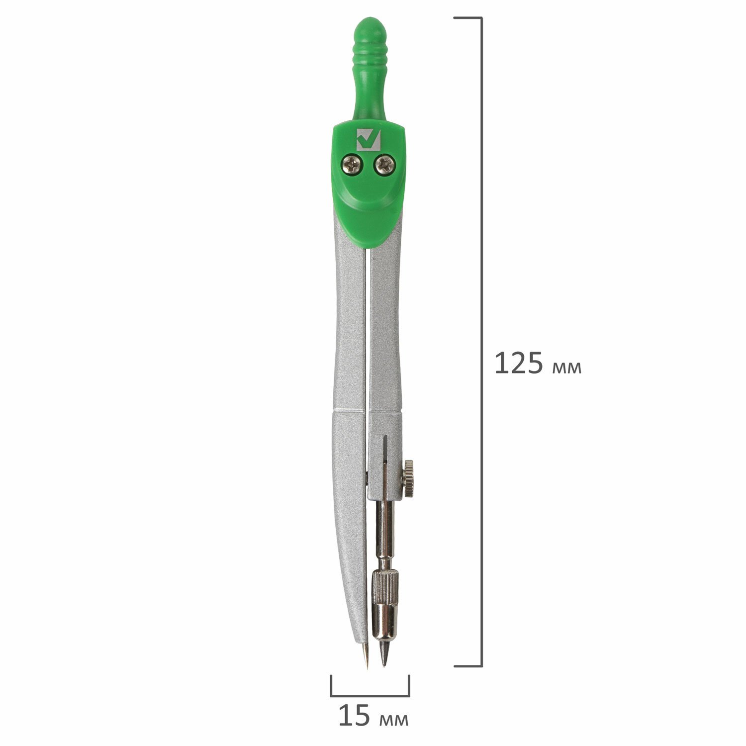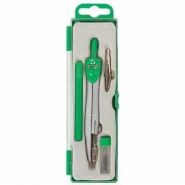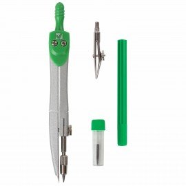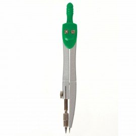 Циркуль длиной 125 мм имеет несгибаемые штанги. Изготовлен из металла, дополнительный цвет элементов – зеленый.