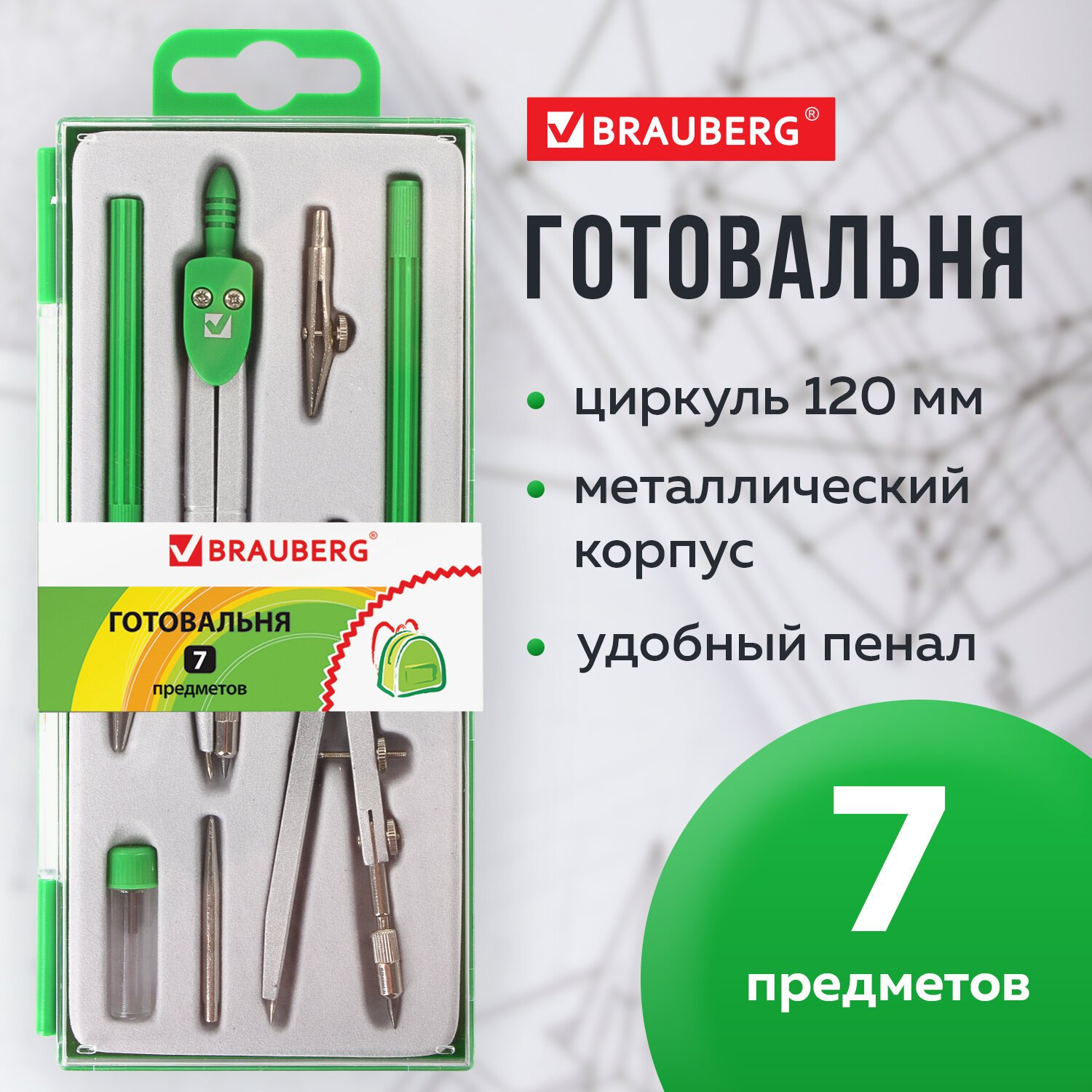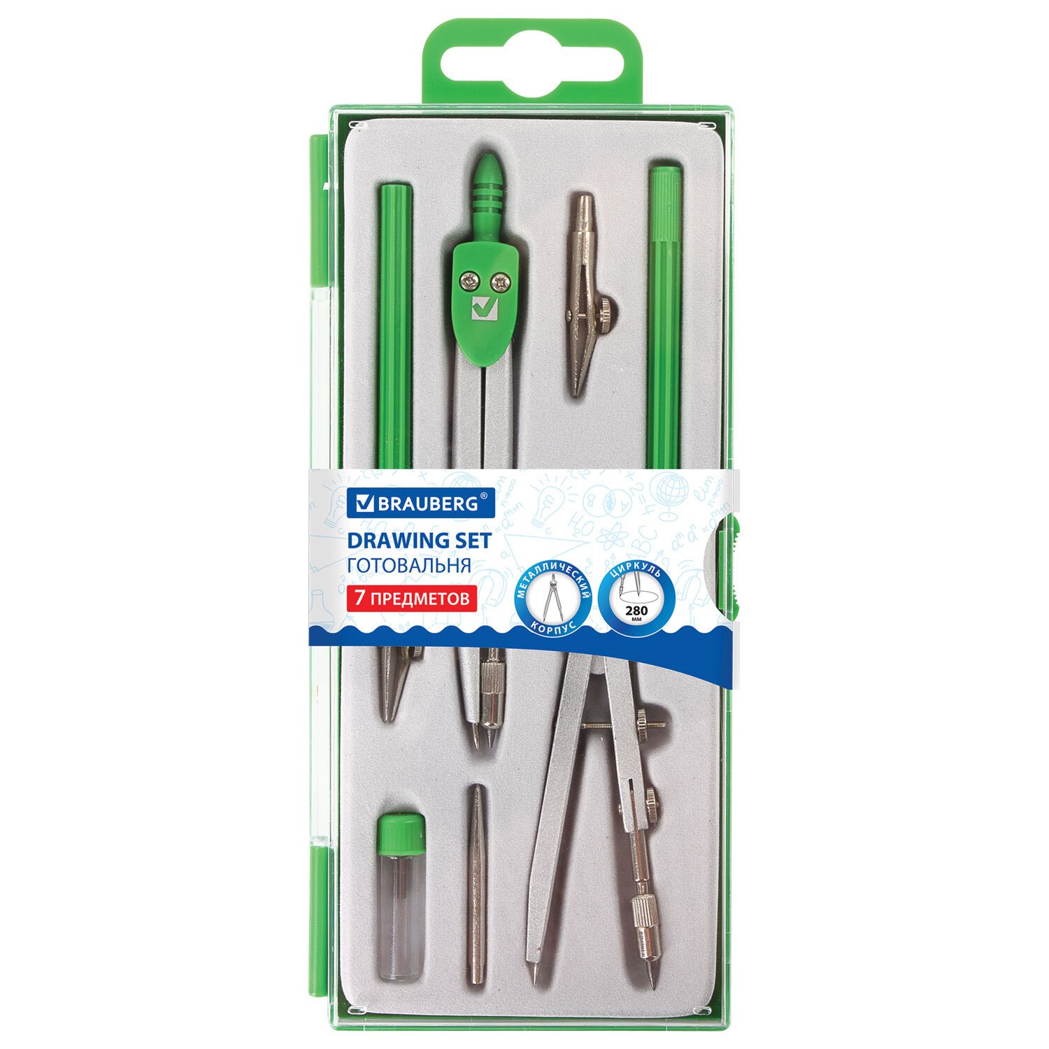 Готовальня BRAUBERG "Klasse", 7 предметов: циркуль+кронциркуль, рейсфедер + держатель, 2 вставки, грифель, 210344
