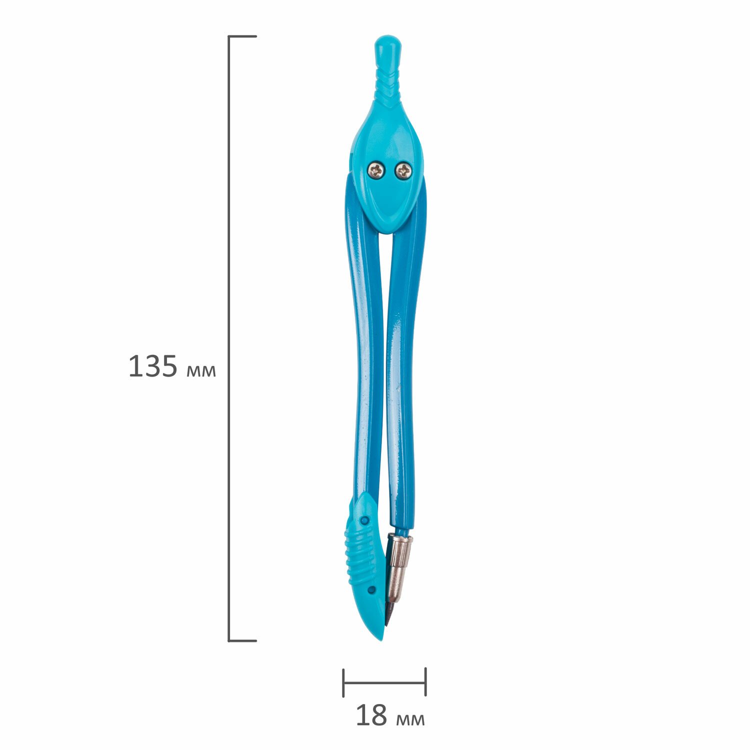 Циркуль длиной 135 мм имеет несгибаемые штанги и пластиковый защитный колпачок для иглы. Изготовлен из металла. Цвет – ассорти (без возможности выбора цвета).
