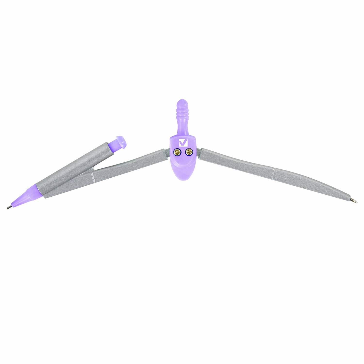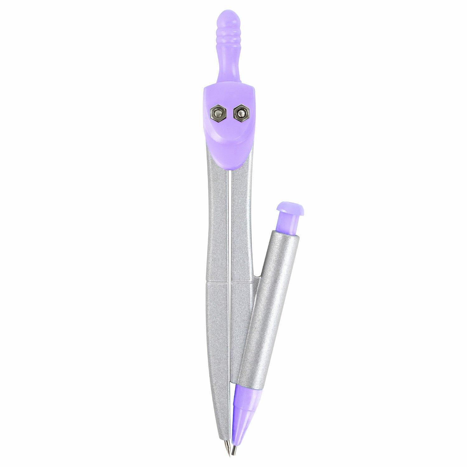 Циркуль длиной 125 мм с механическим карандашом имеет несгибаемые штанги. Изготовлен из металла, дополнительный цвет элементов - лавандовый.
