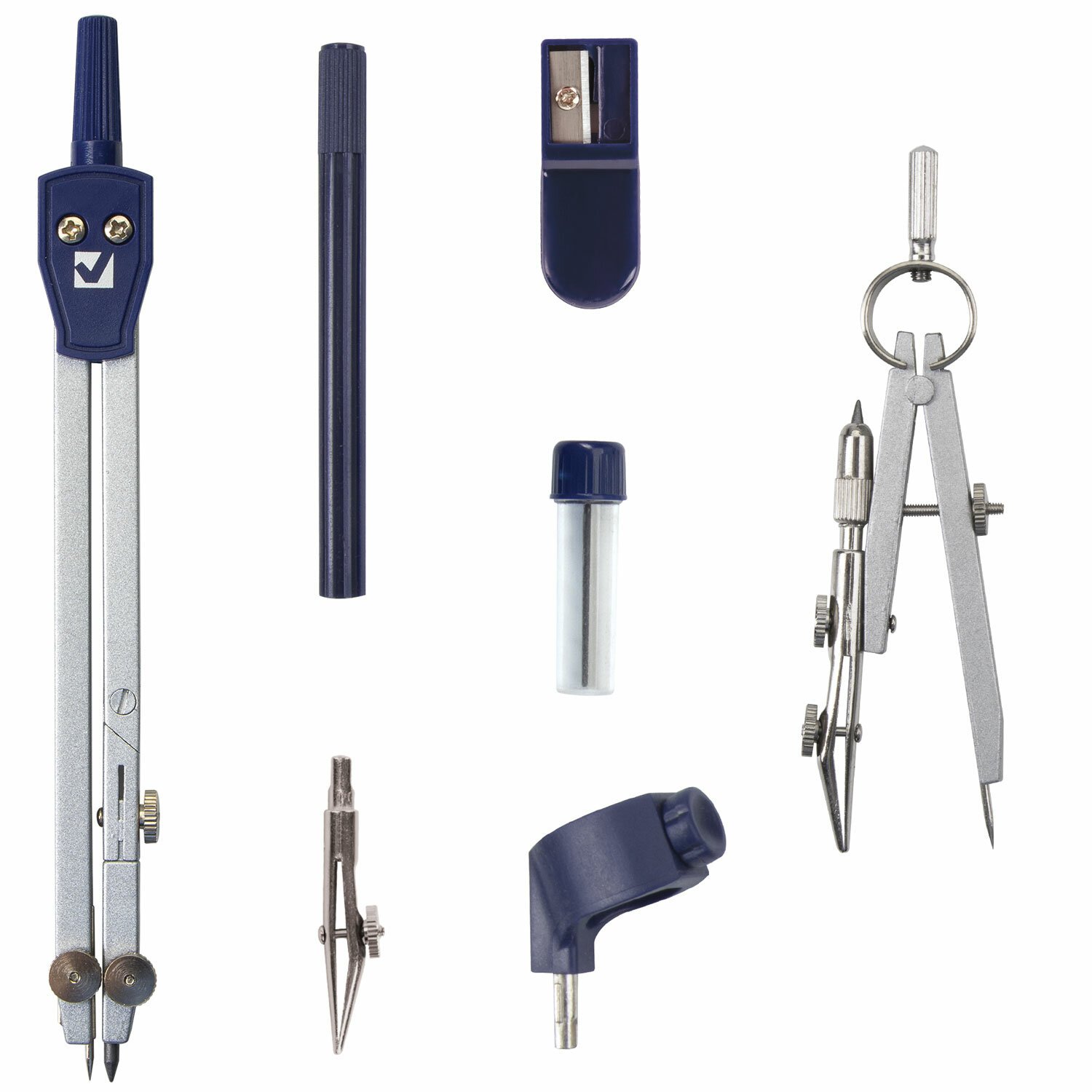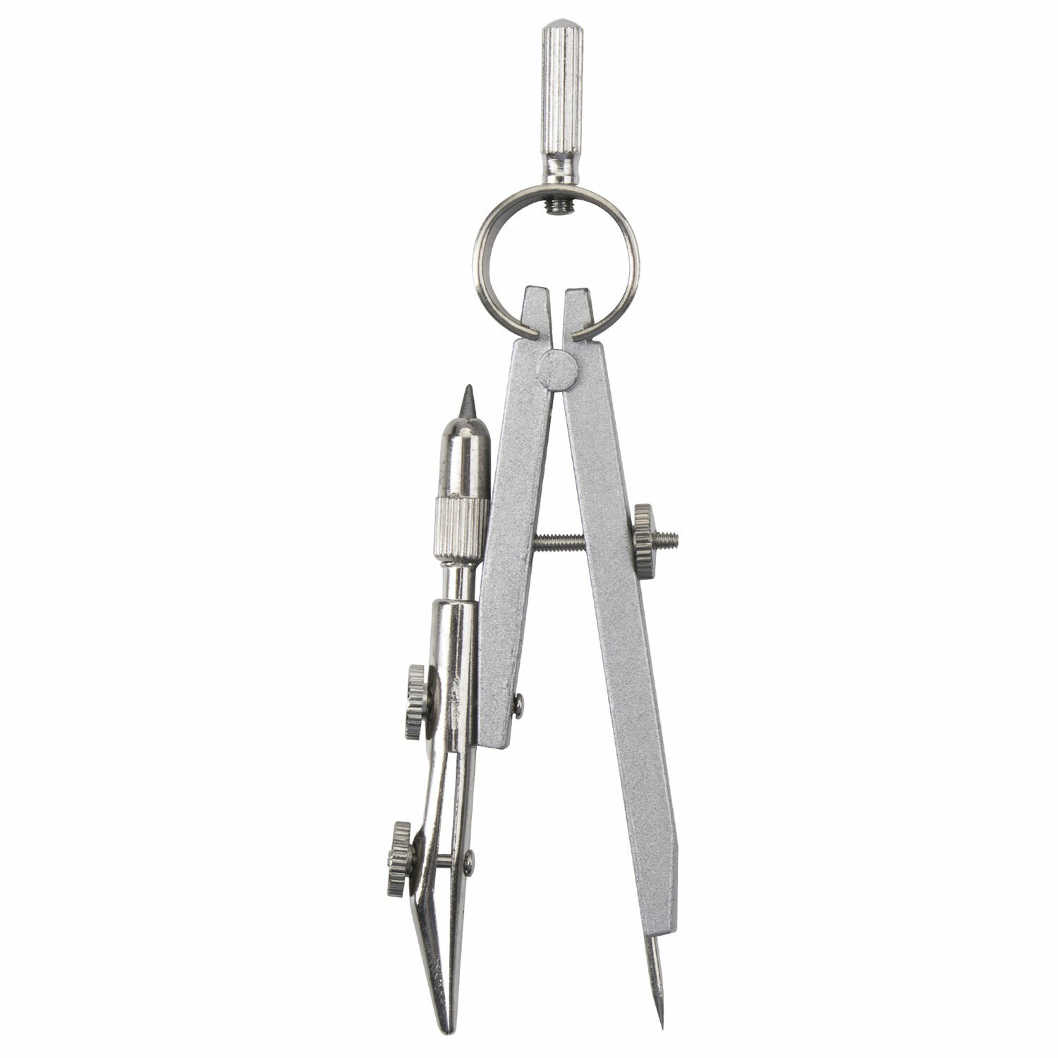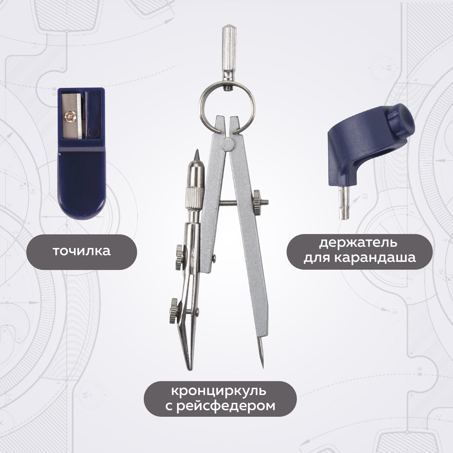 Циркуль длиной 140 мм имеет одну сгибаемую штангу и подстраиваемую иглу. Изготовлен из металла, дополнительный цвет элементов – синий.