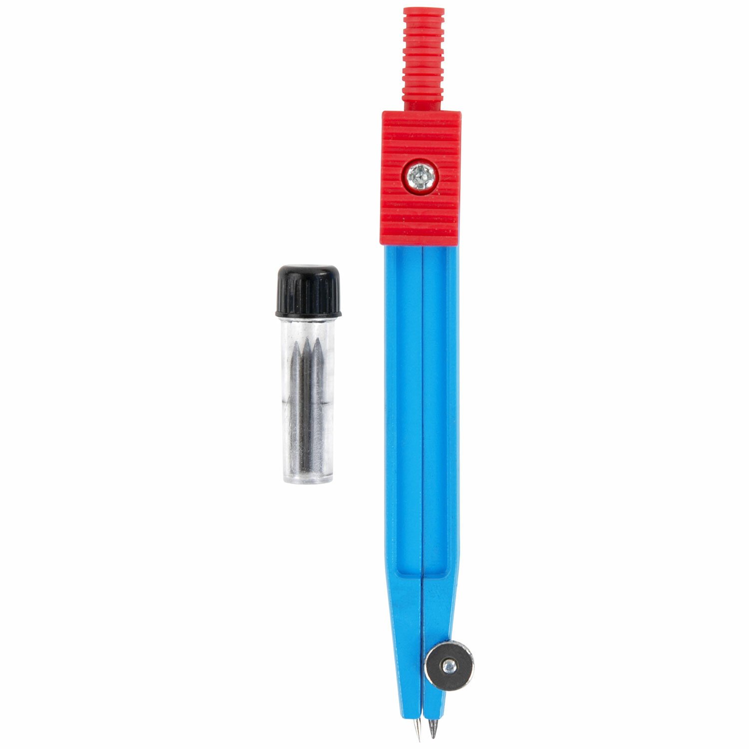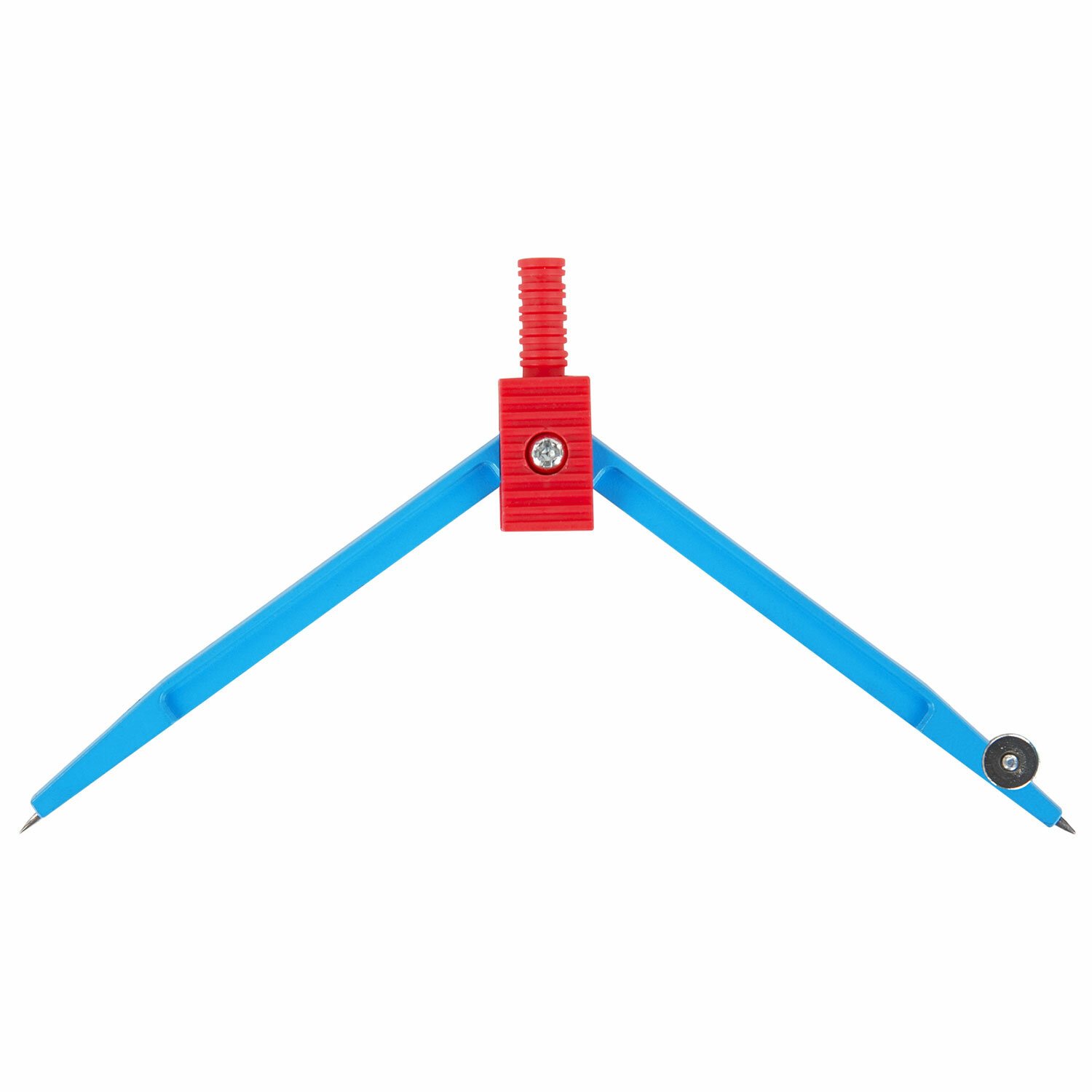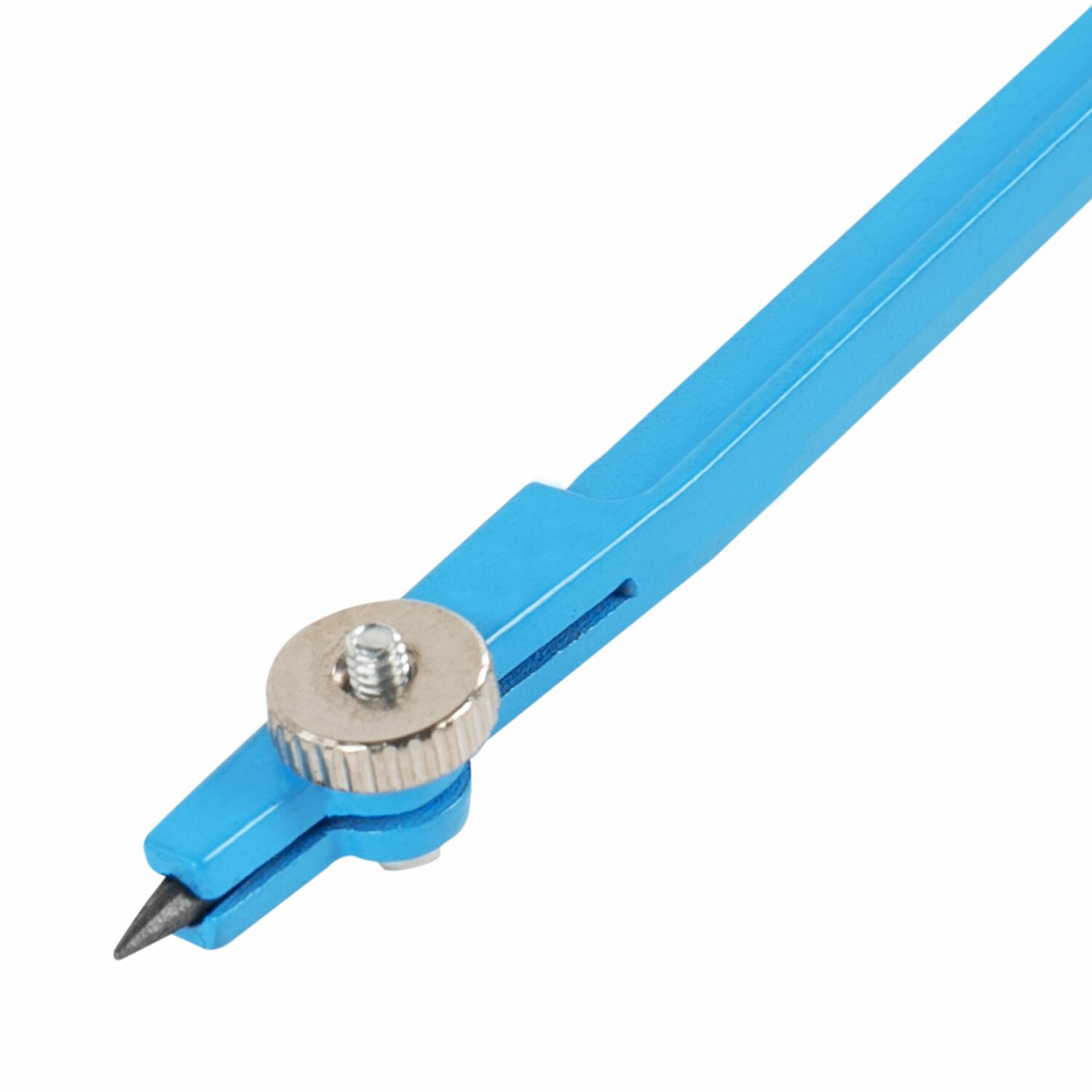 Циркуль длиной 110 мм имеет несгибаемые штанги и подстраиваемую иглу. Изготовлен из металла. Цвет – синий, дополнительный цвет элементов – красный.
