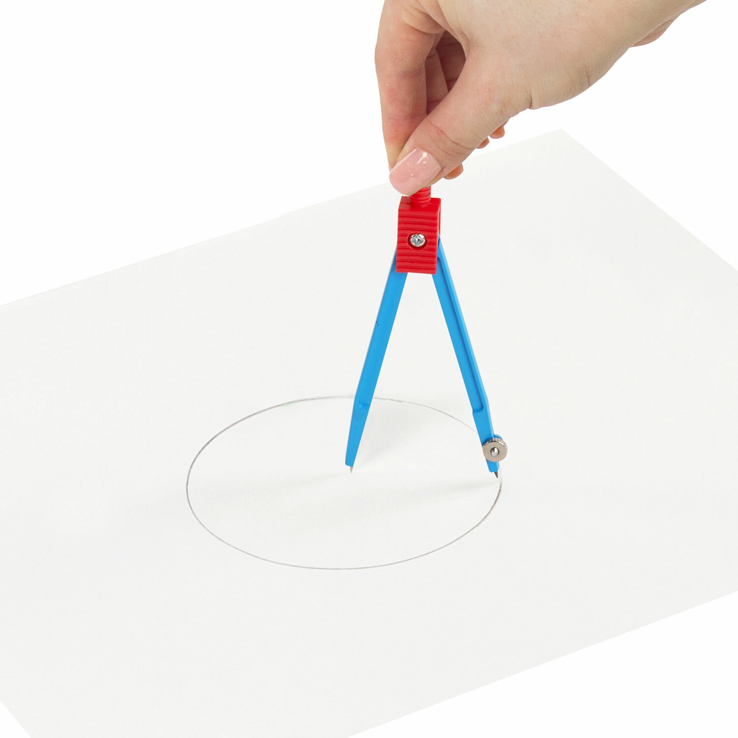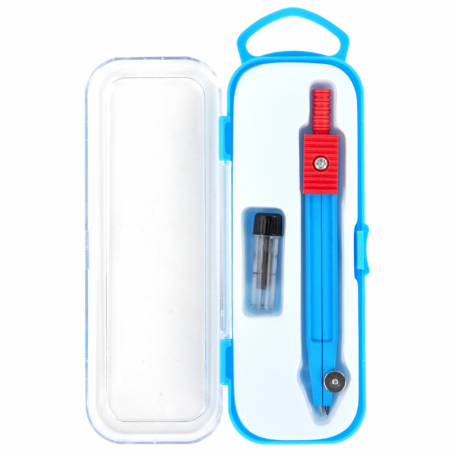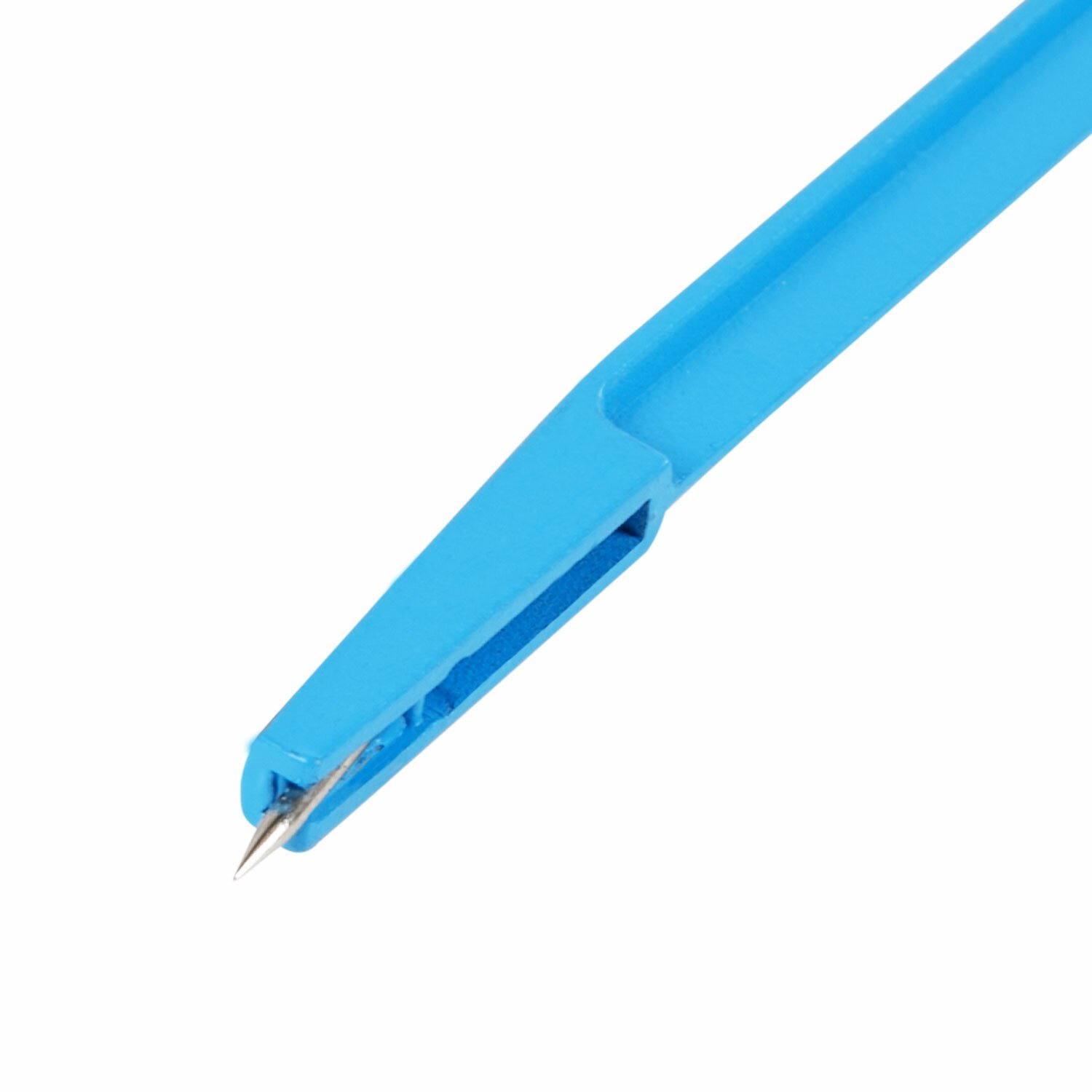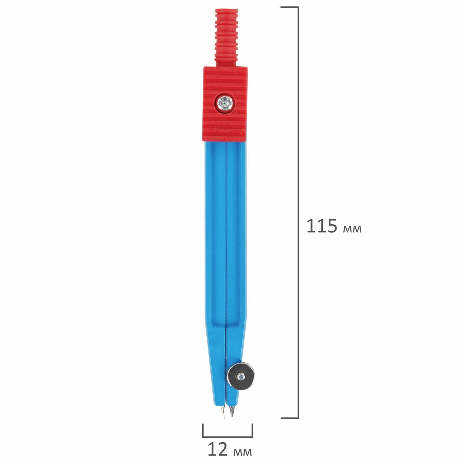 Циркуль длиной 110 мм имеет несгибаемые штанги и подстраиваемую иглу. Изготовлен из металла. Цвет – синий, дополнительный цвет элементов – красный.