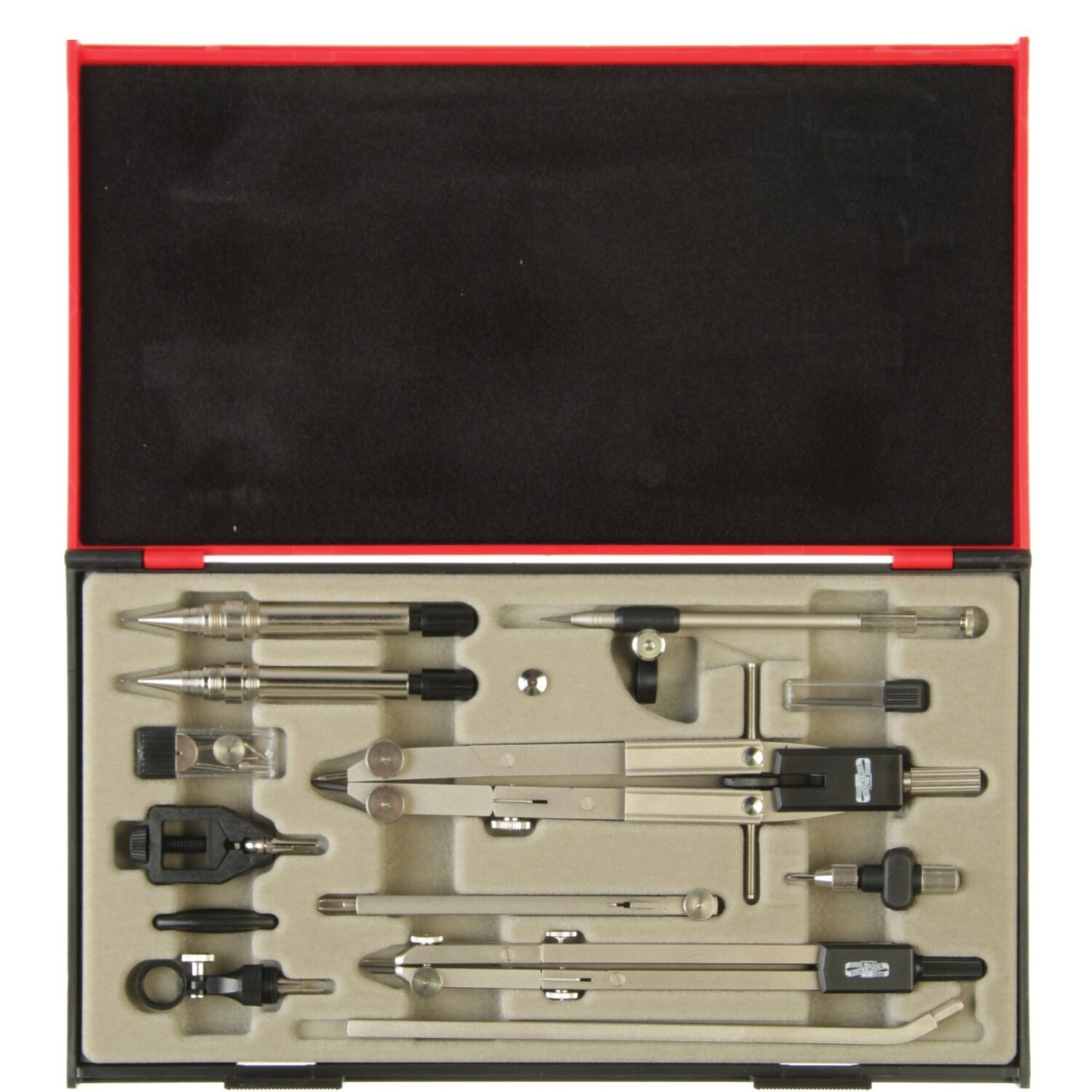 Профессиональная готовальня в пластиковом красном футляре с бархатной подложкой. Наполнение – 13 предметов. Инструменты предназначены для выполнения чертежных работ любой сложности как техническими специалистами, так и студентами.