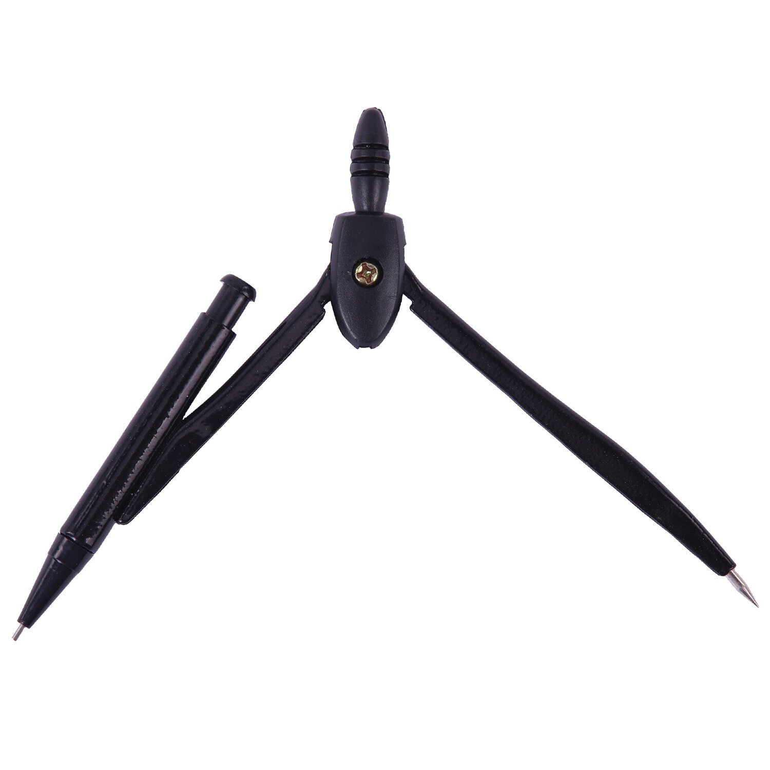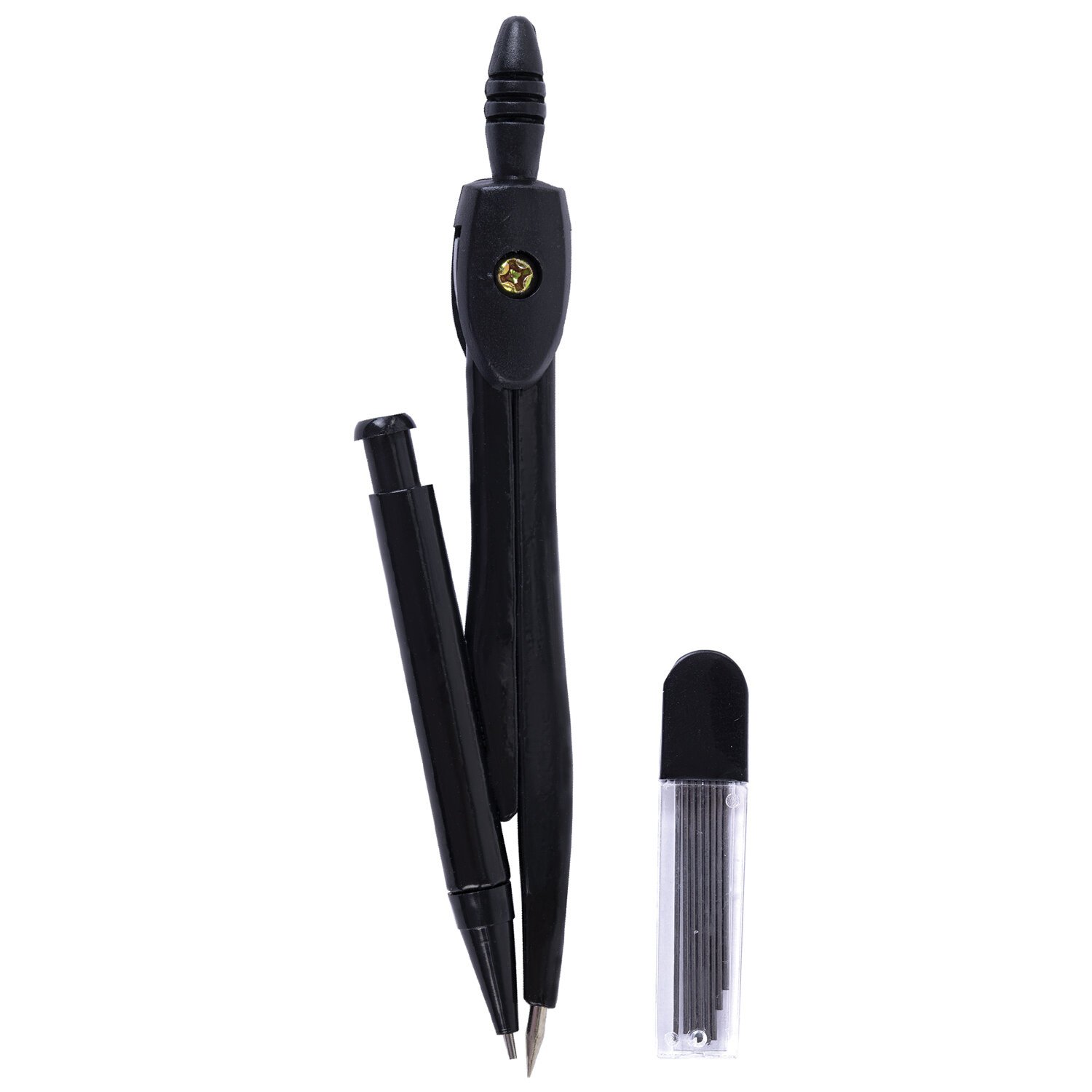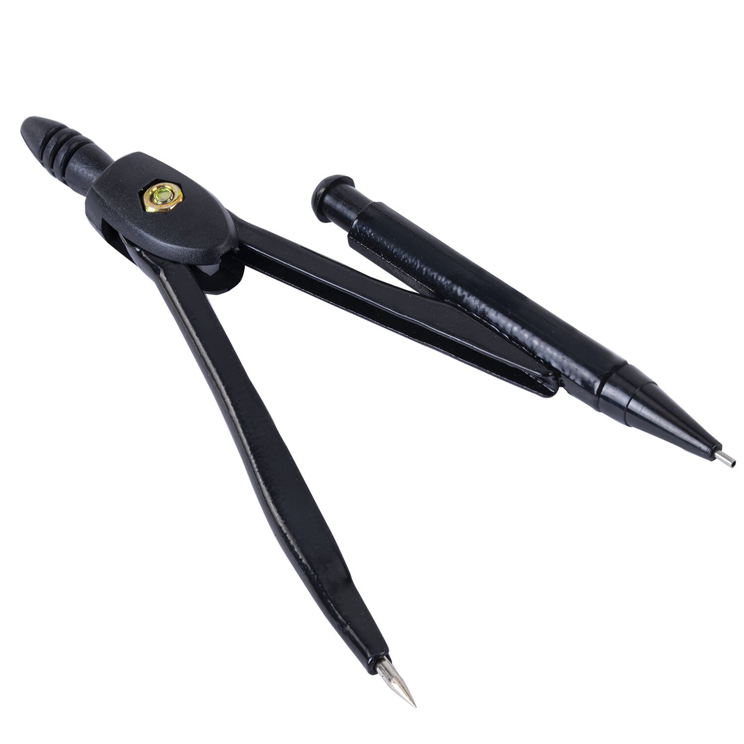Циркуль длиной 120 мм с механическим карандашом имеет несгибаемые штанги. Изготовлен из металла, черного цвета.