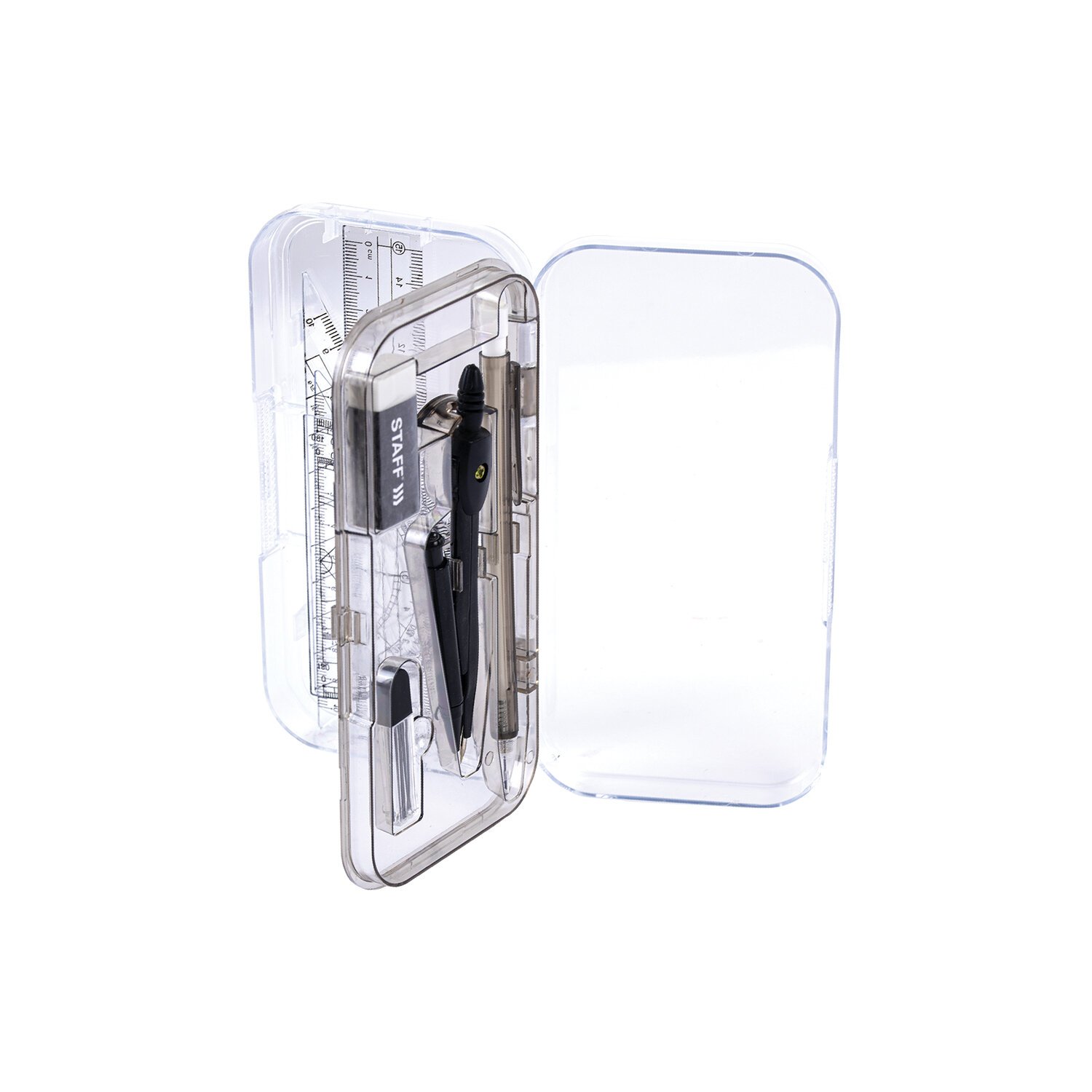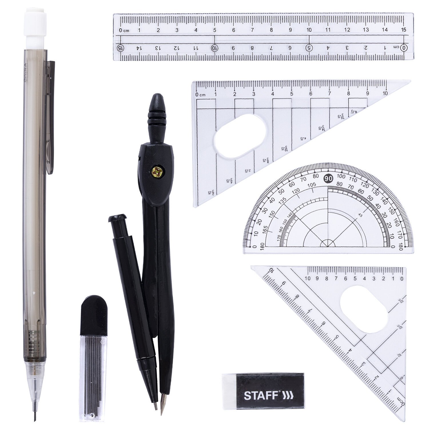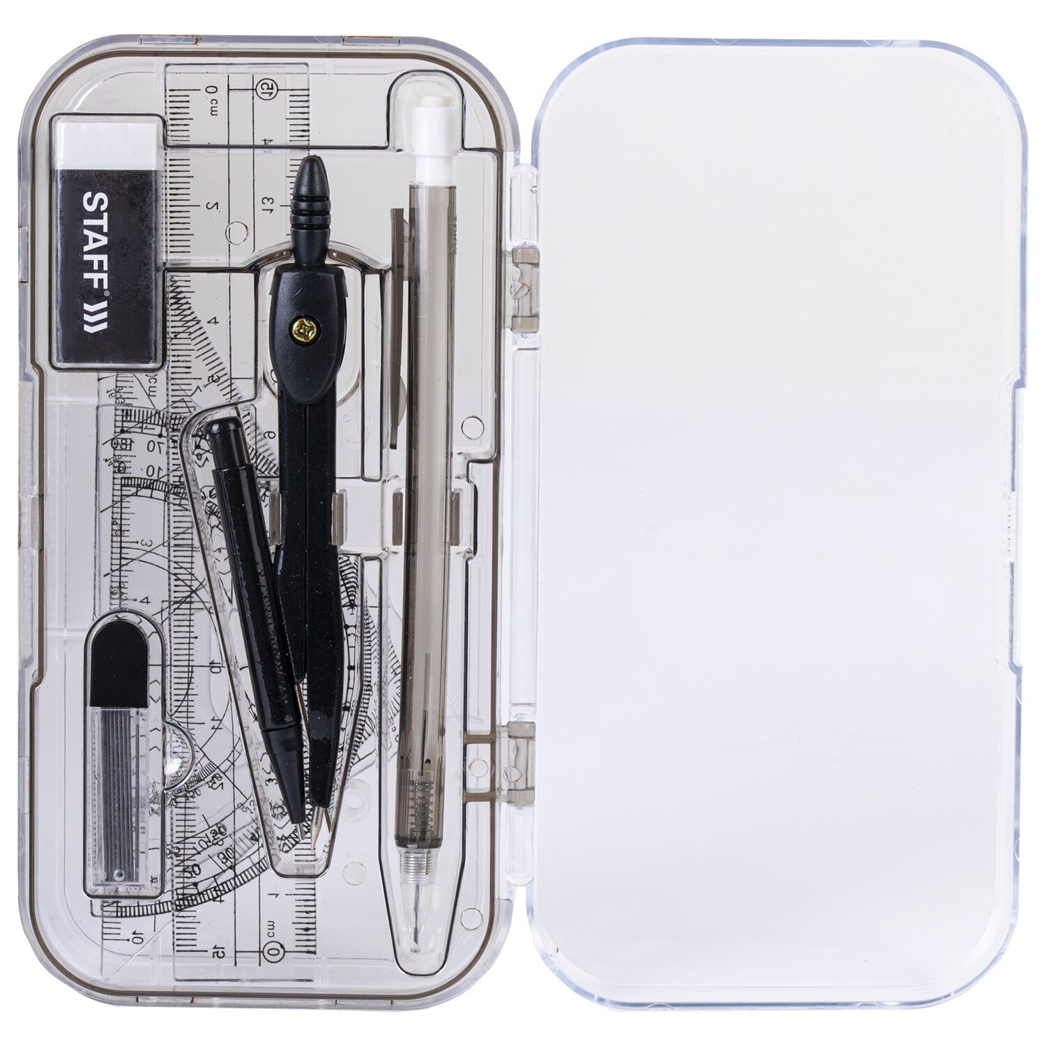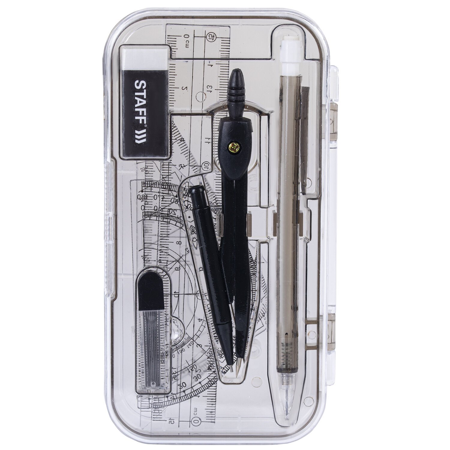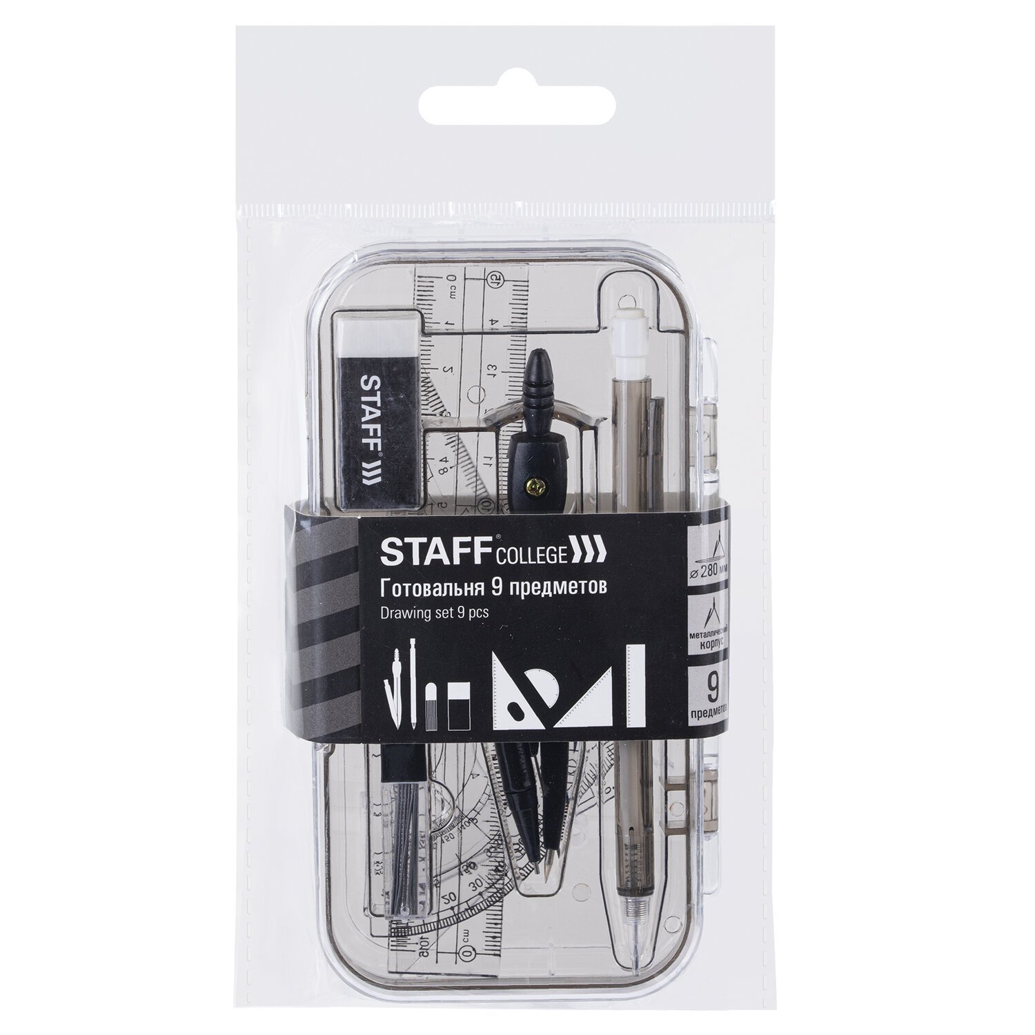Готовальня STAFF, 9 предметов: циркуль 120 мм, чертежные принадлежности, механический карандаш, пластиковый пенал, 210863