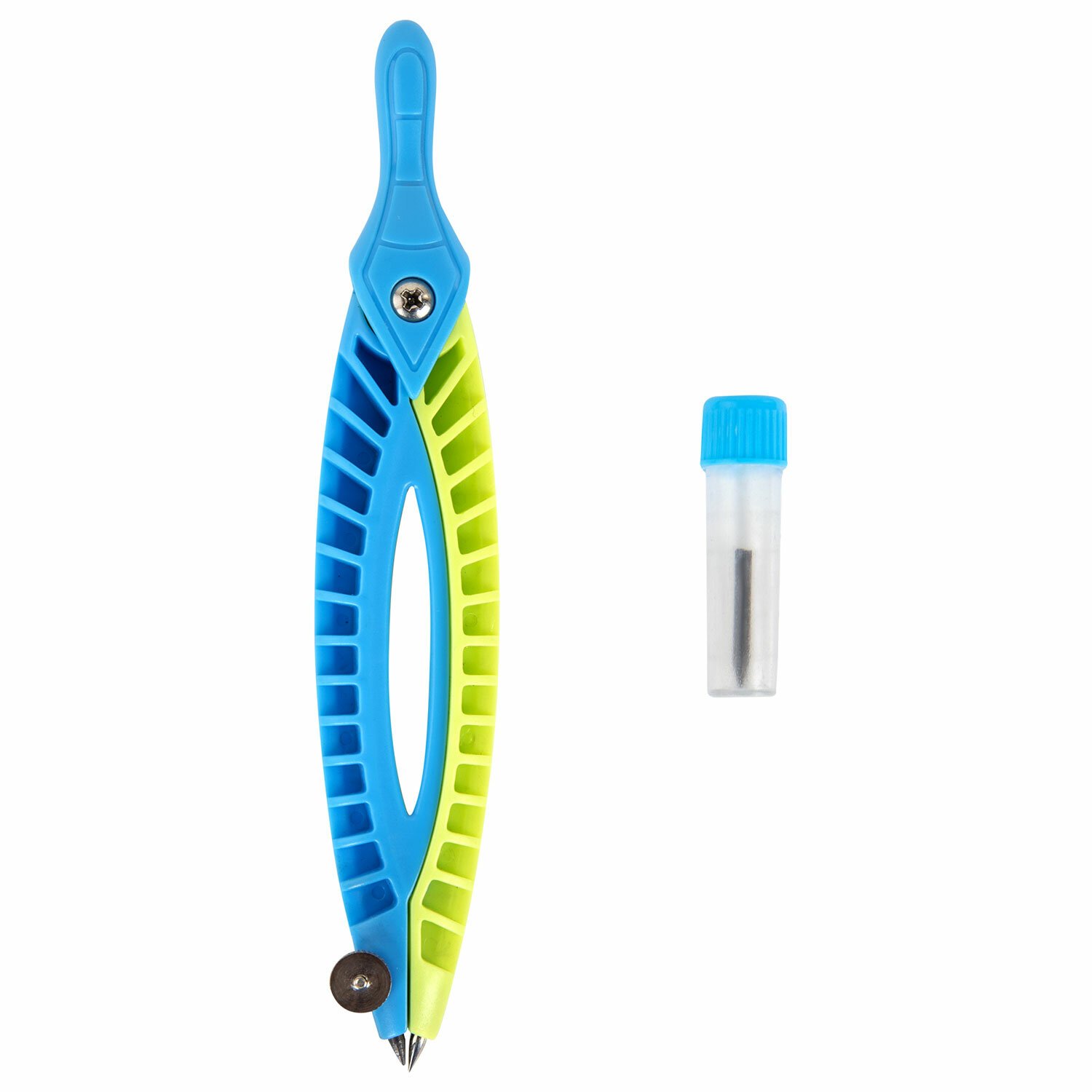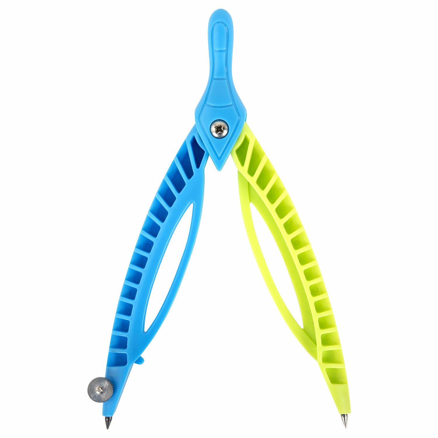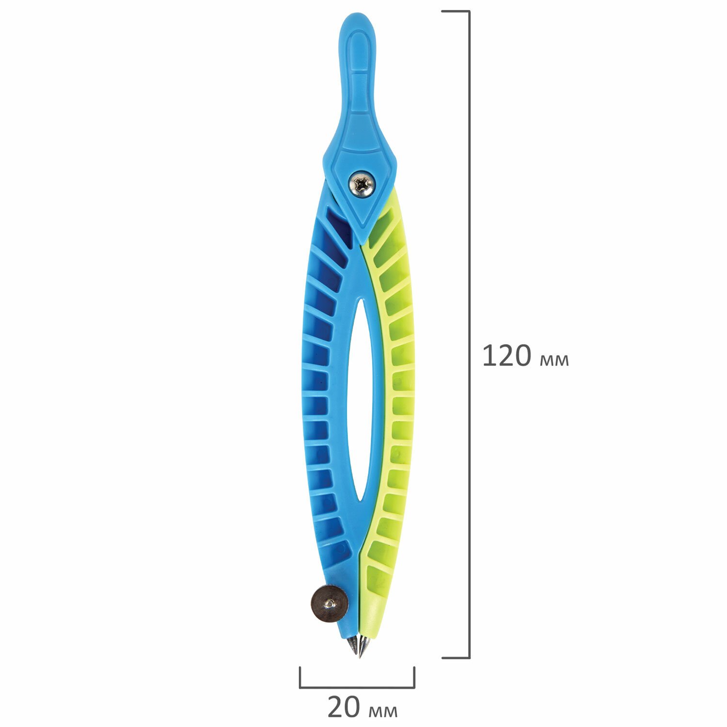 Циркуль длиной 120 мм с несгибаемыми штангами изготовлен из пластика. Цвета – голубой и салатовый.