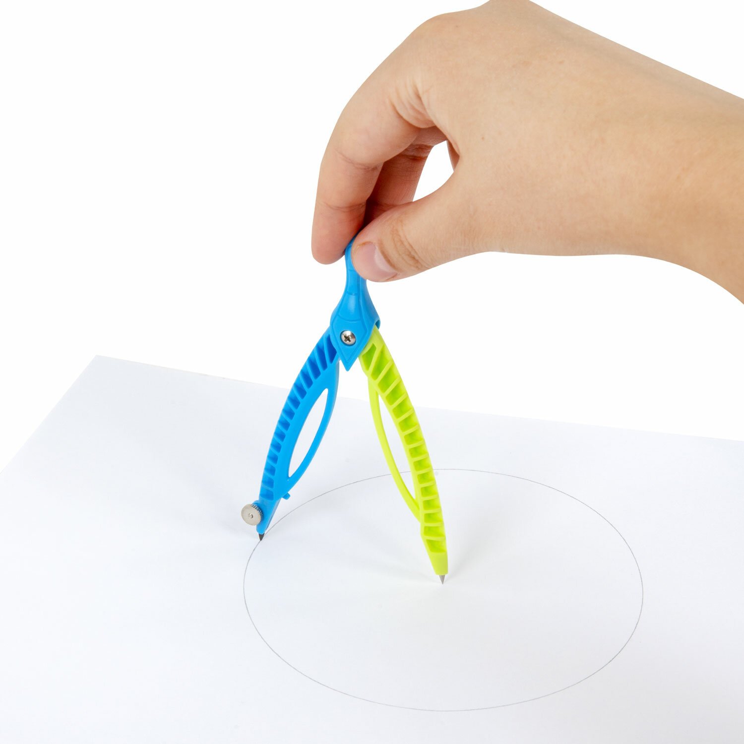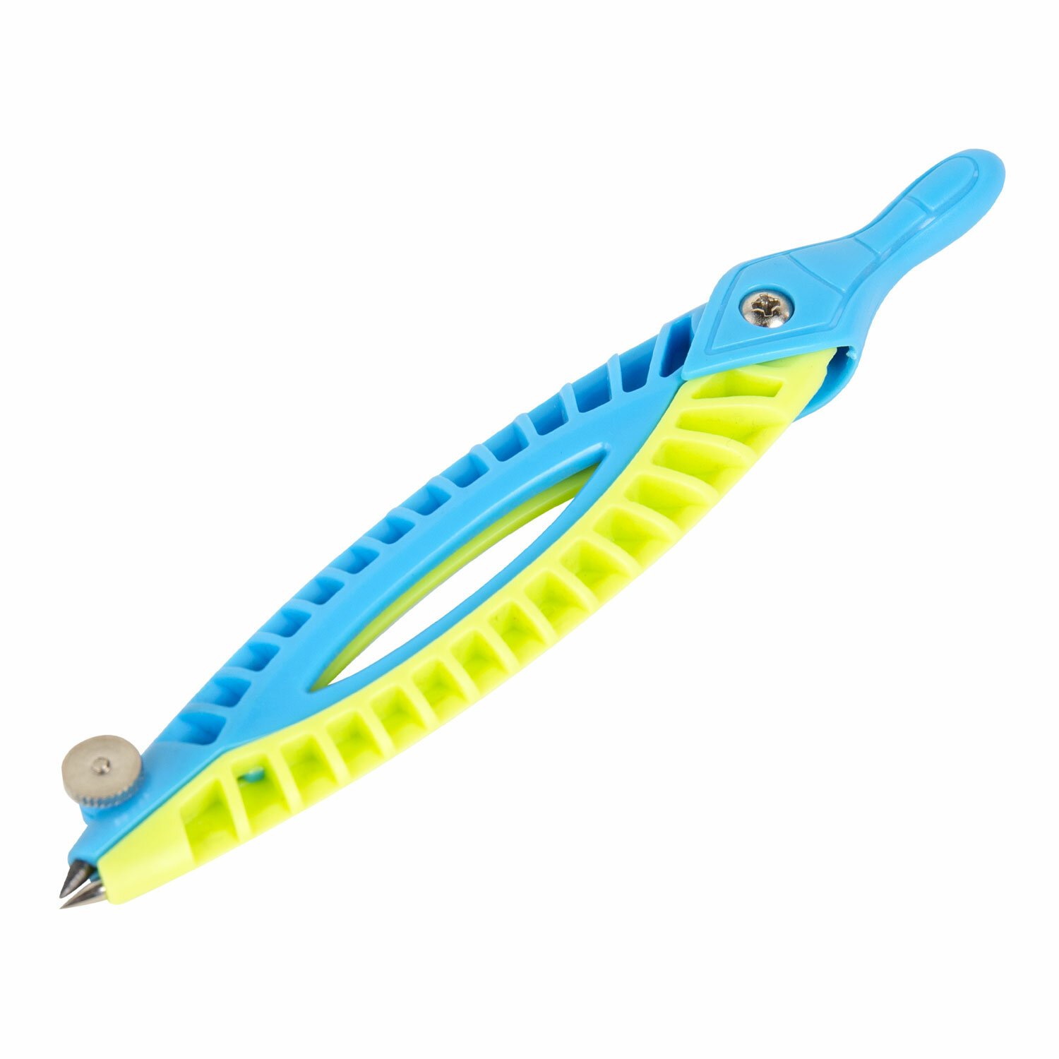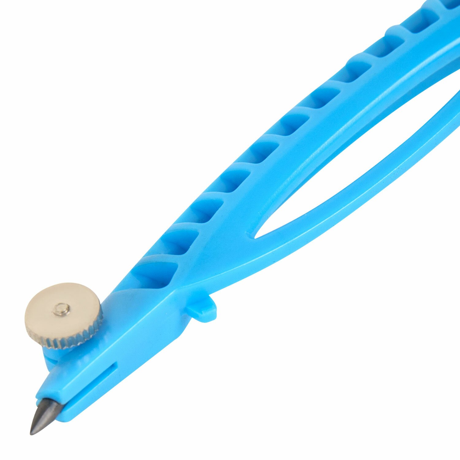 Циркуль длиной 120 мм с несгибаемыми штангами изготовлен из пластика. Цвета – голубой и салатовый.